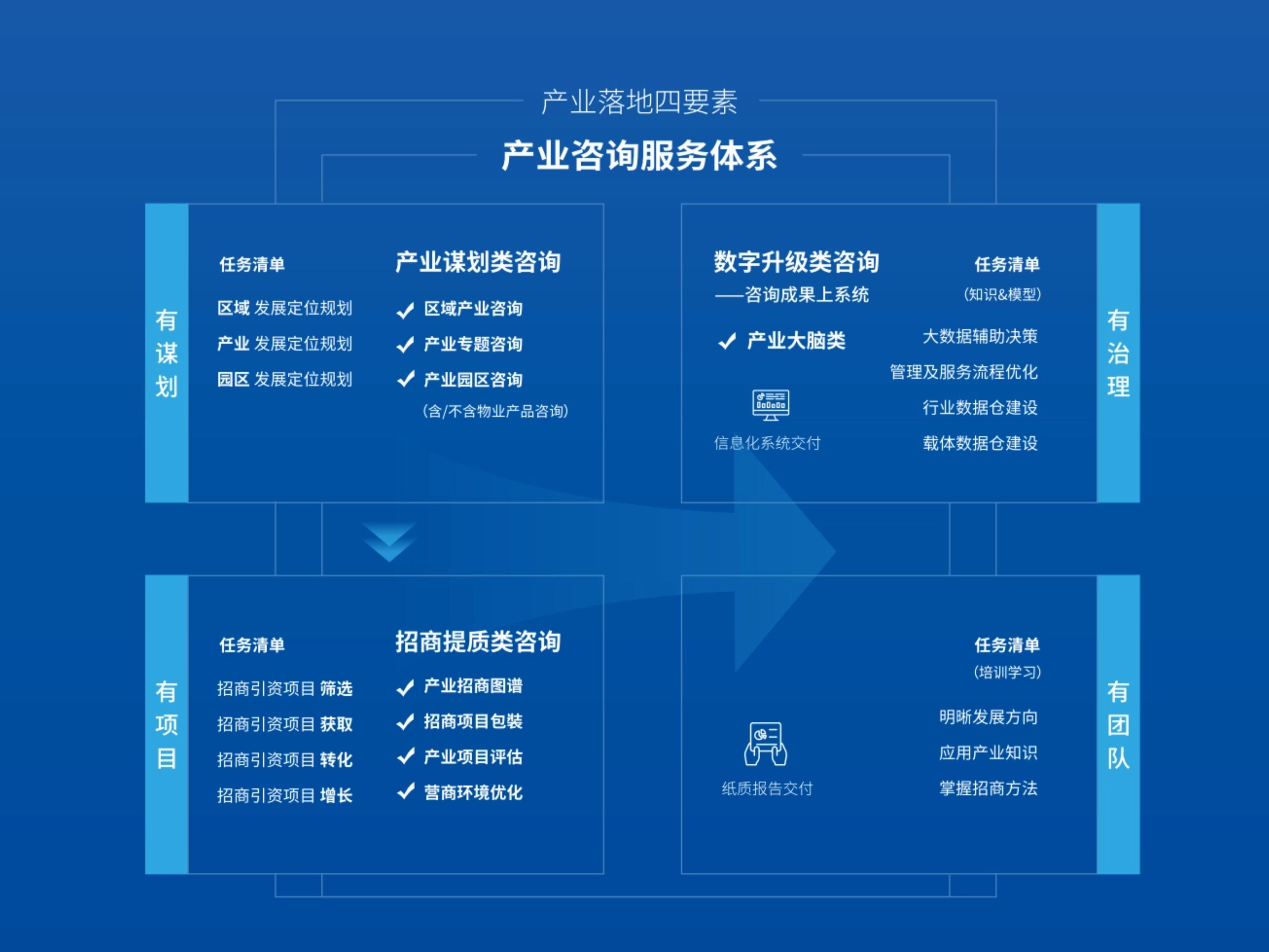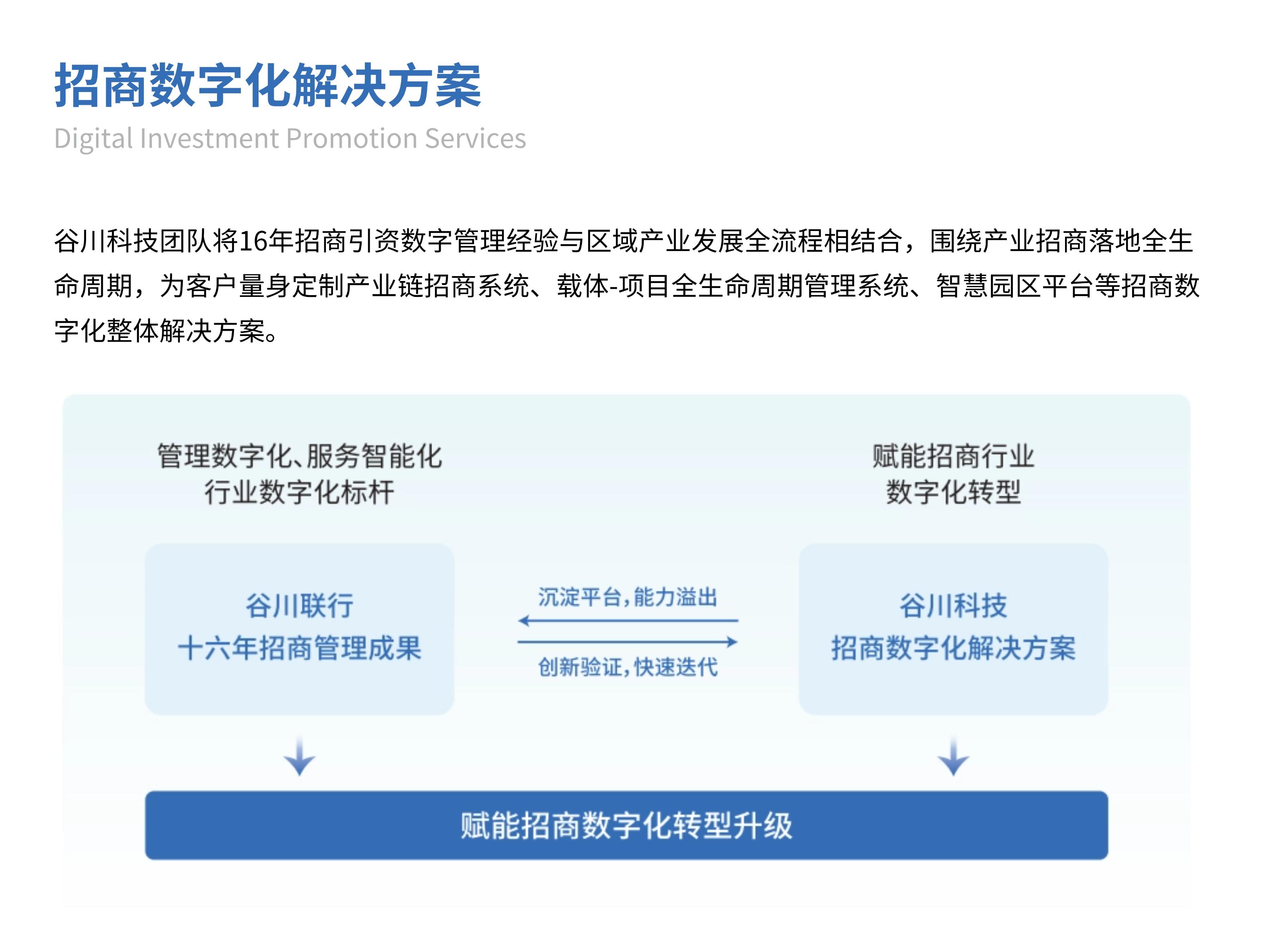 谷川集团秉承“为商所想、为商所用、为商服务”的宗旨,搭建起连接投资者与招商载体的桥梁,旗下包含谷川联行、谷川高科两大核心业务版块,涵盖招商引资、产业咨询、产业园区开发运营等多个领域,致力于为全国各级政府及园区提供产业发展全流程、全生命周期的解决方案;打造谷川律师事务所、凯德赛恩、谷川税务师事务所等生态服务体系,为企业提供法律、投融资、财税、投资选址等多方面、各阶段的商务咨询服务。