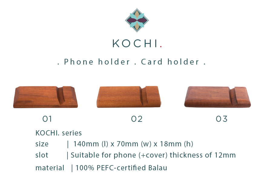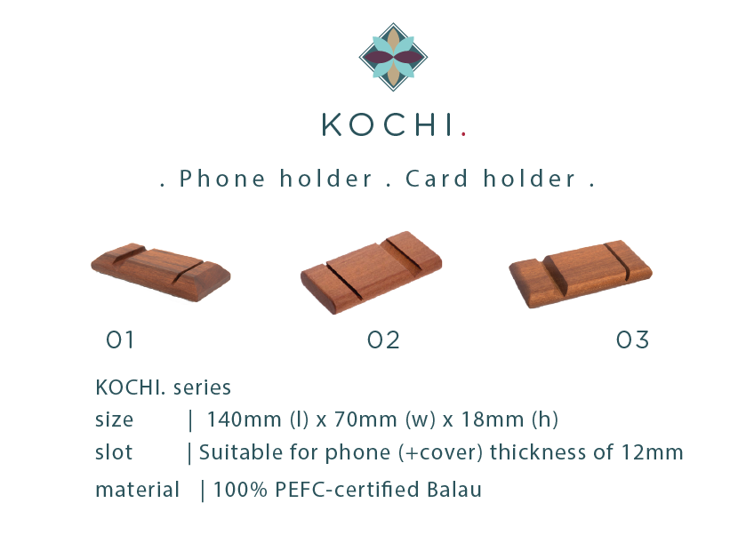The KOCHI phone holder initially began as a paperweight, a block of excess wood born from cutting the outlines of our PEGA board handles. This block was then rounded at the edges to a point that it lightly resembled the ‘Kuih Kochi’ - a sweet Malay glutenous rice dumpling, and later evolved into a more functional item that now comes in 3 modern designs.