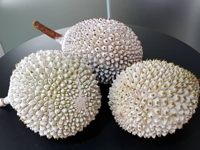 形态完整美观: 展出的榴莲保持着完整的球形或椭圆形外观,榴莲刺锐利分明,果实饱满,极具视觉冲击力。