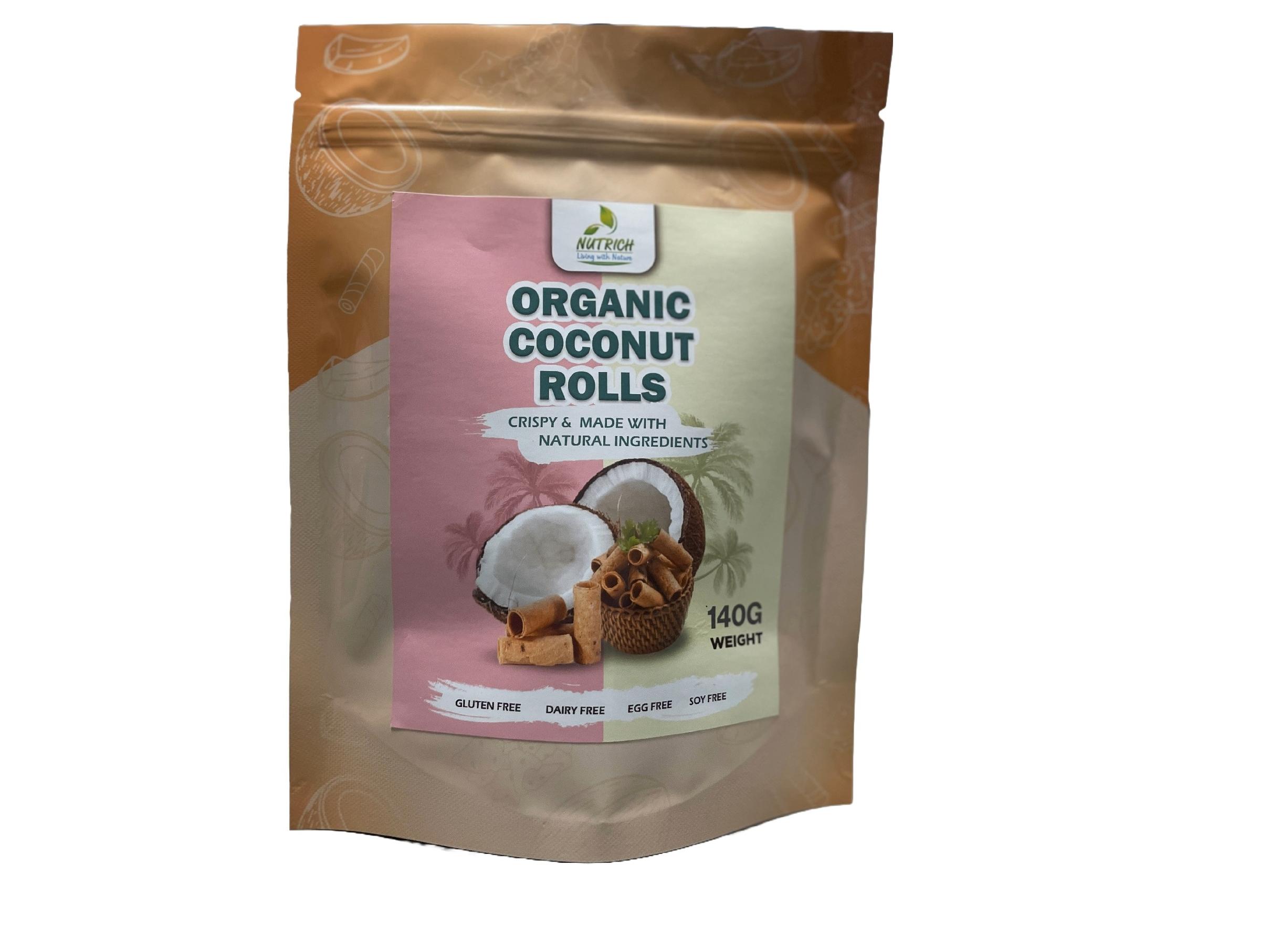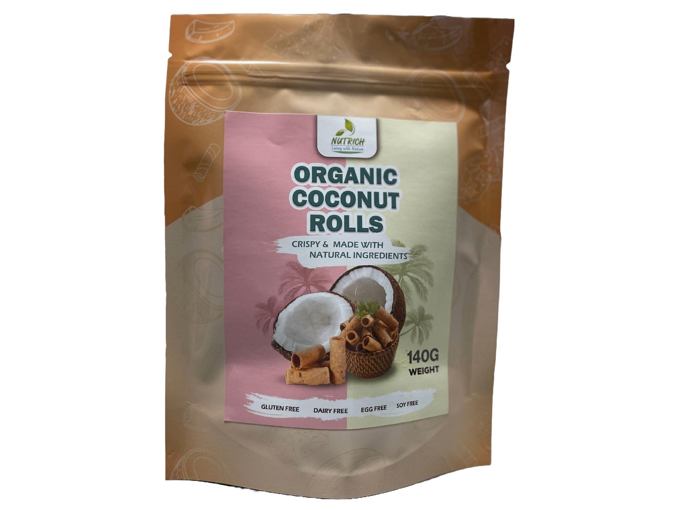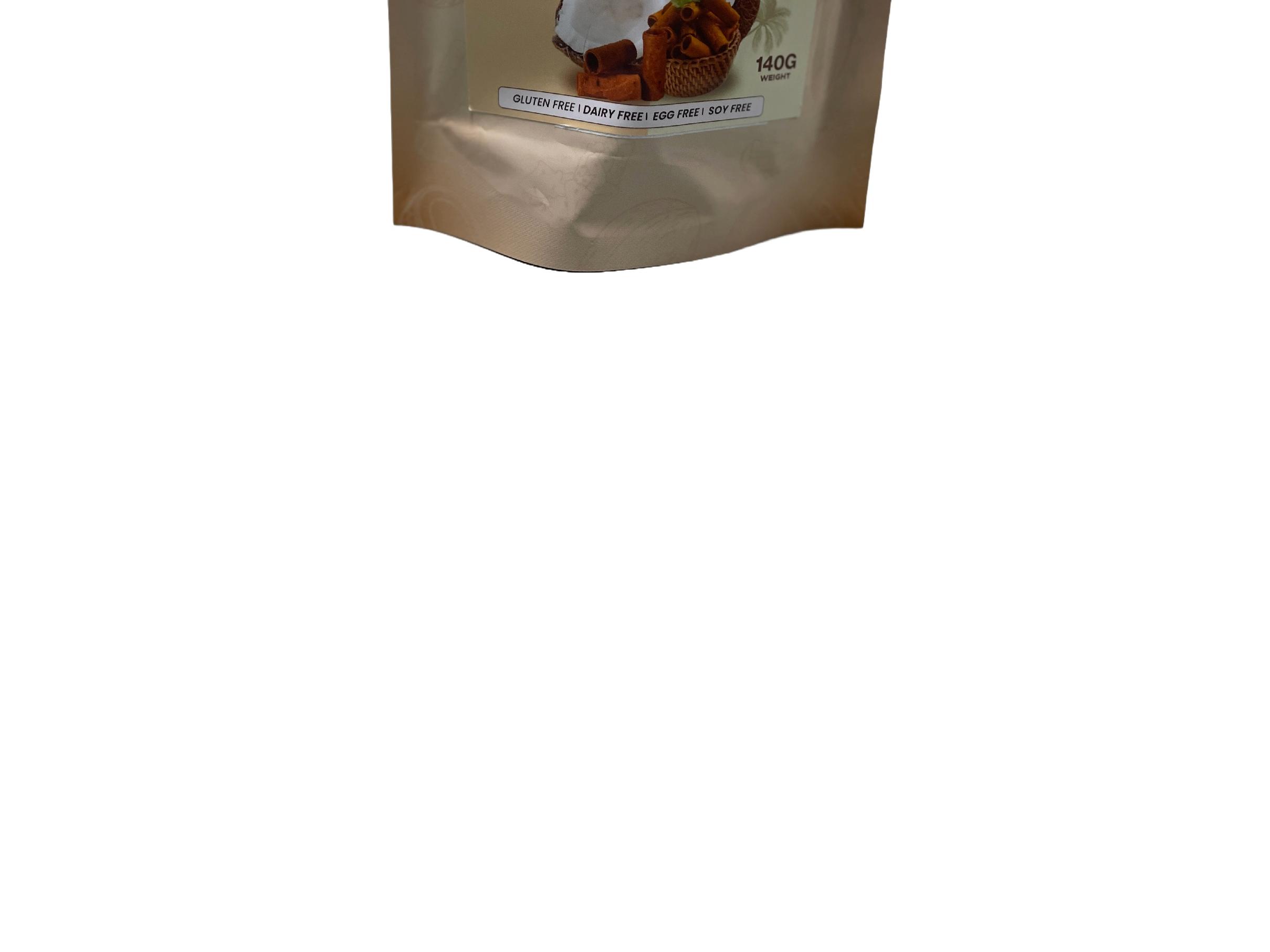 Coconut roll is crispy sweet snack, with real coconut extract, rice flour, casava flour, crane and coconut sugar. It is vegen gluten free, dairy free, egg free and soy free.