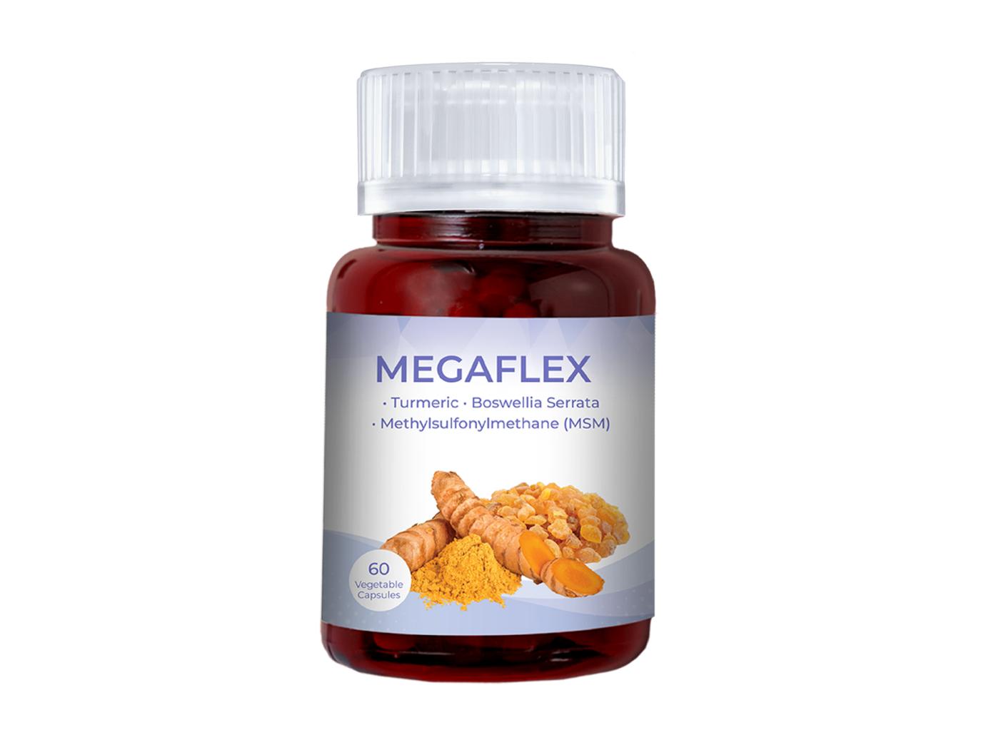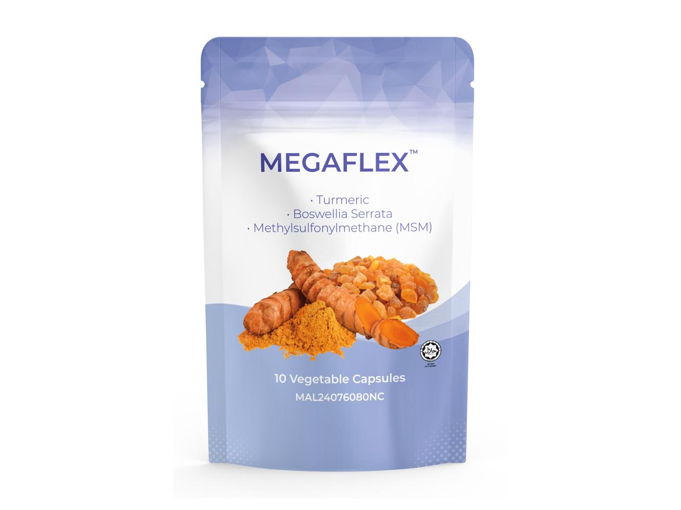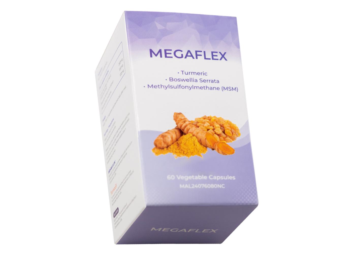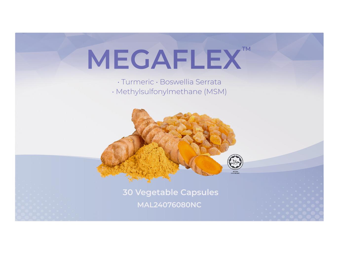 MEGAFLEXTM is a joint nutritional supplement that combines the natural essence of Eastern and Western medicine. It integrates three powerful branded anti-inflammatory ingredients: TURMACIN® Turmeric Extract, BOSWELLIN® Boswellia Extract, and OptiMSMTM Organic Sulfur MSM. This formulation works synergistically by first reducing inflammation to relieve joint pain, swelling, and stiffness, and then repairing joint connective tissue, ultimately enhancing quality of life.