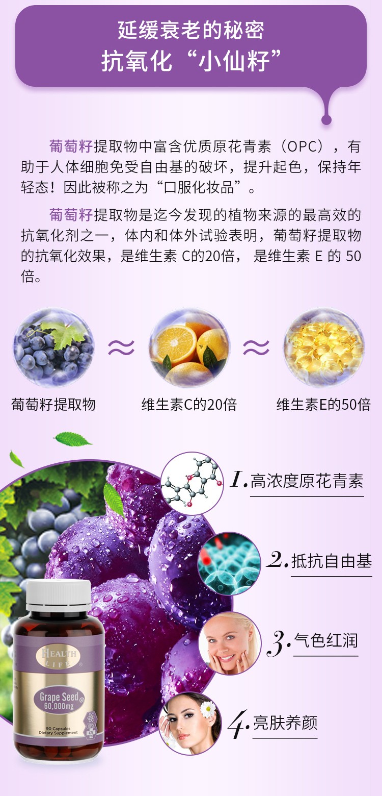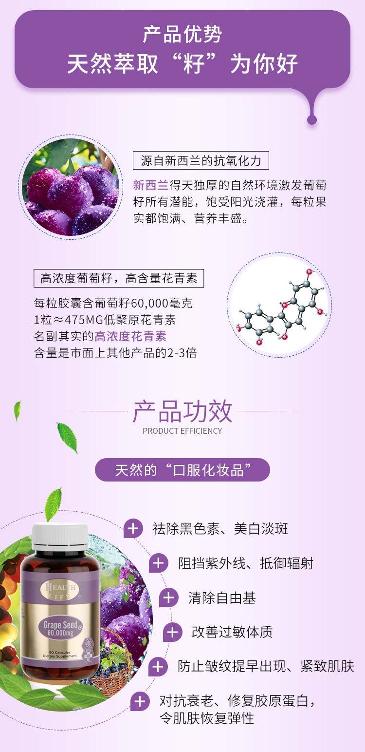 清除⾃由基、美⽩淡斑、抗紫外抗辐射、抗皱延衰,⾼含量葡萄籽精华!畅销新西兰本土20年国民健康品牌, GMP国际质量认证,品质胜过市面上同类产品