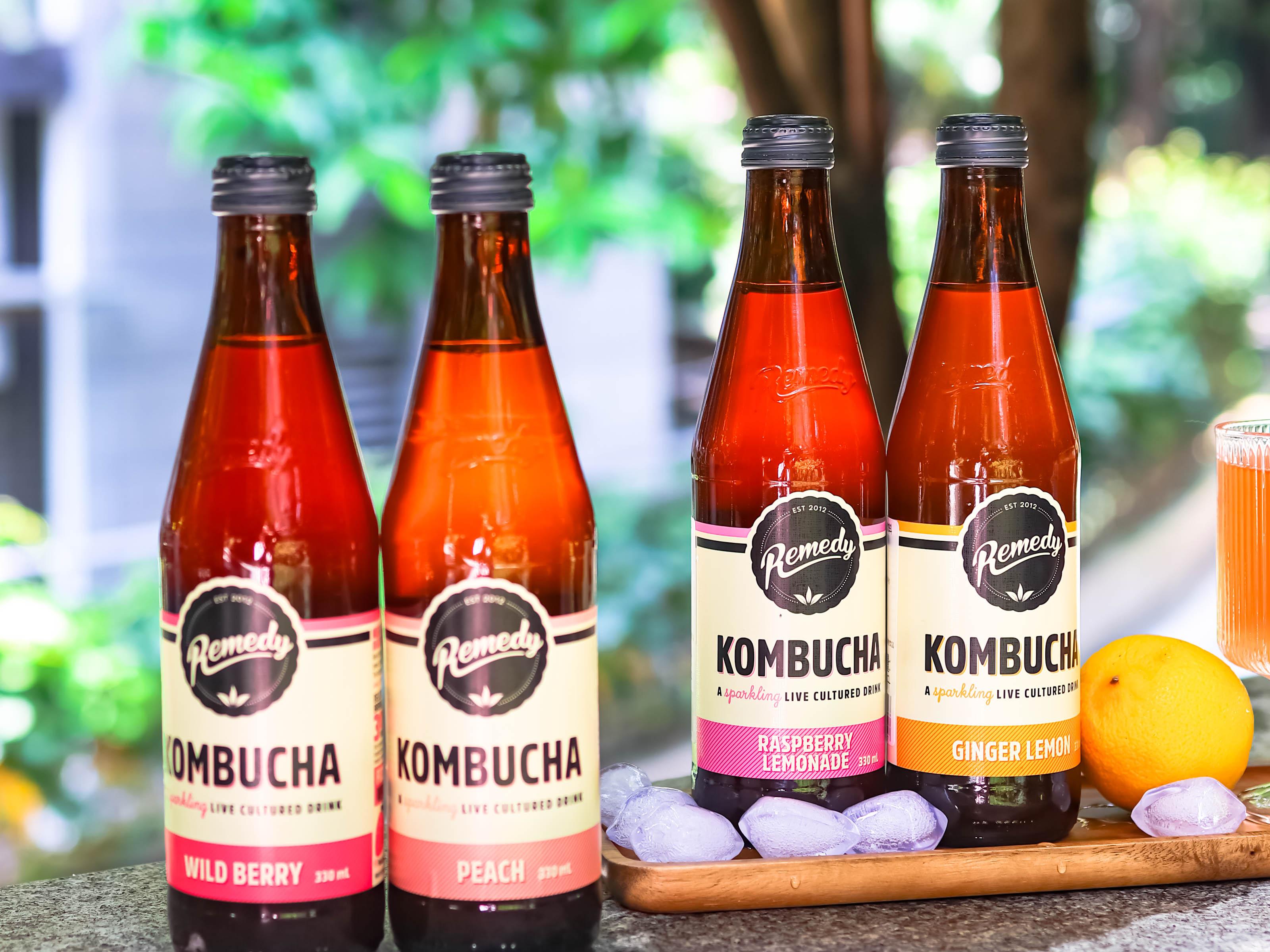 Remedy康普茶是一款发酵气泡茶,由红茶菌发酵而成,无添加蔗糖,一瓶330ml仅13大卡。内含活性菌,有助于肠道蠕动,低卡低脂。拥有四款口味:生姜柠檬、混合莓果、覆盆子柠檬以及桃子。