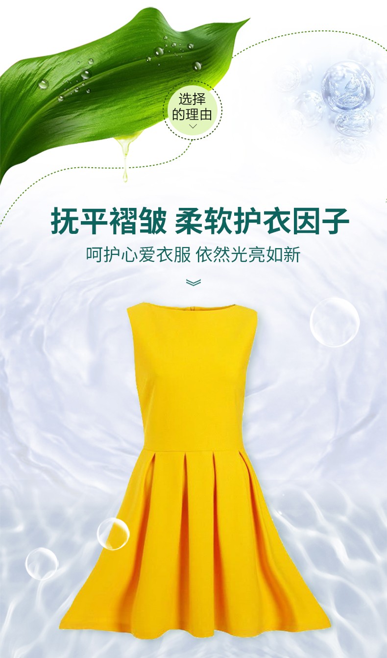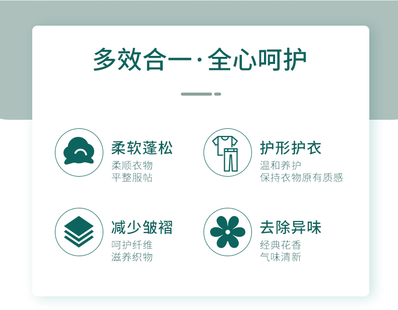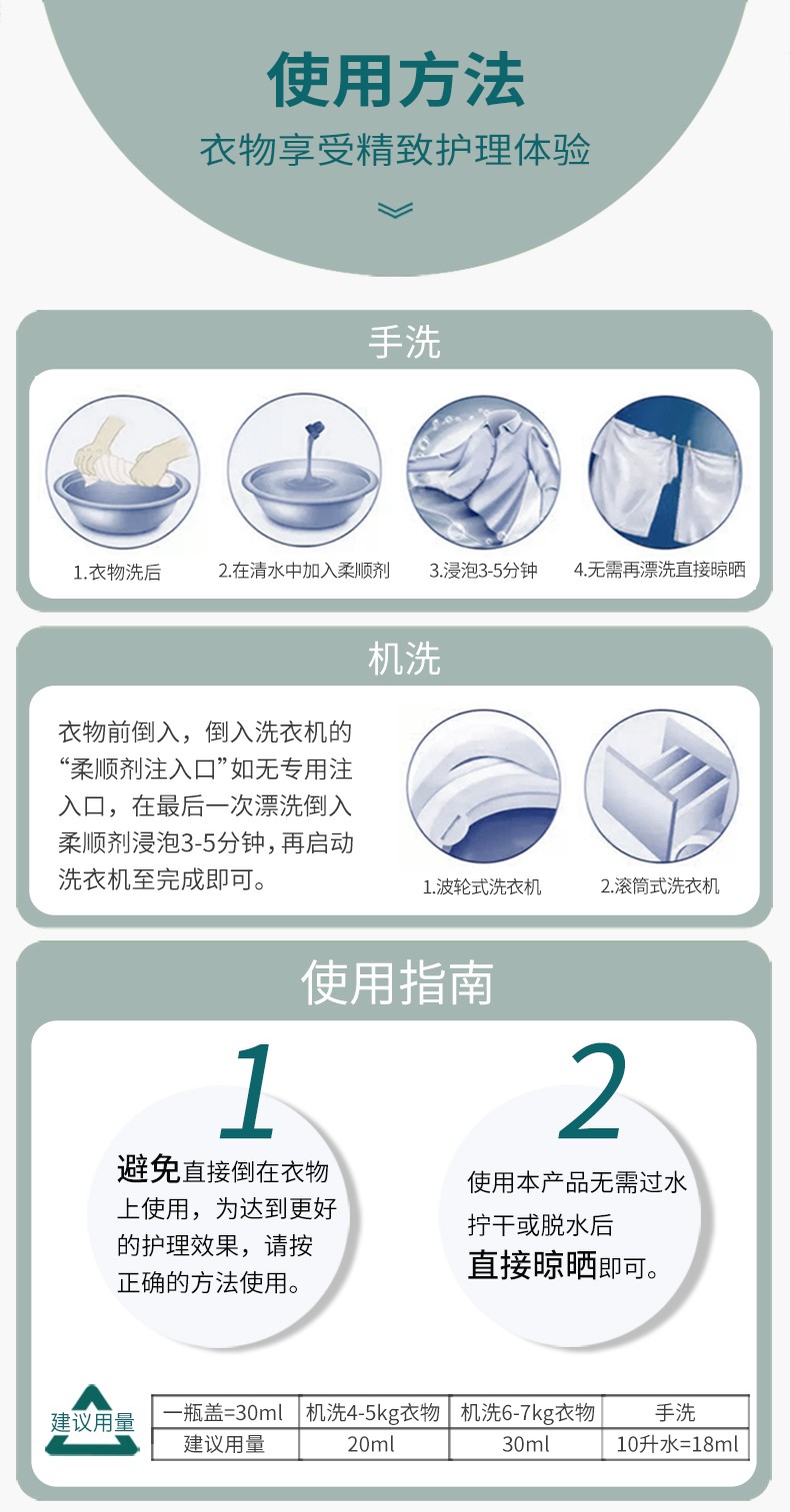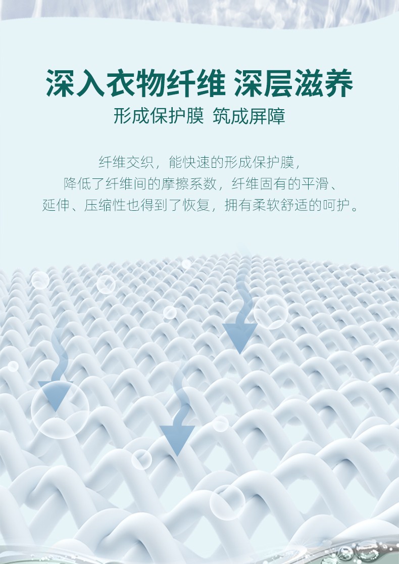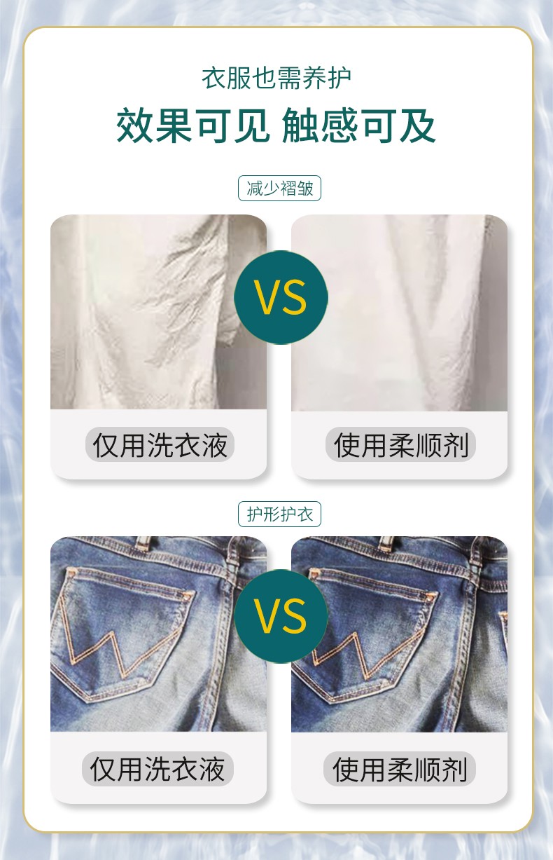 浓缩配方,保护衣物柔软、平整、贴服;天然植物提取,易漂洗;理顺衣物内部纤维,恢复衣物蓬松柔软。