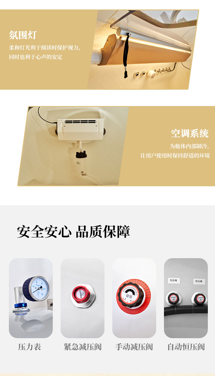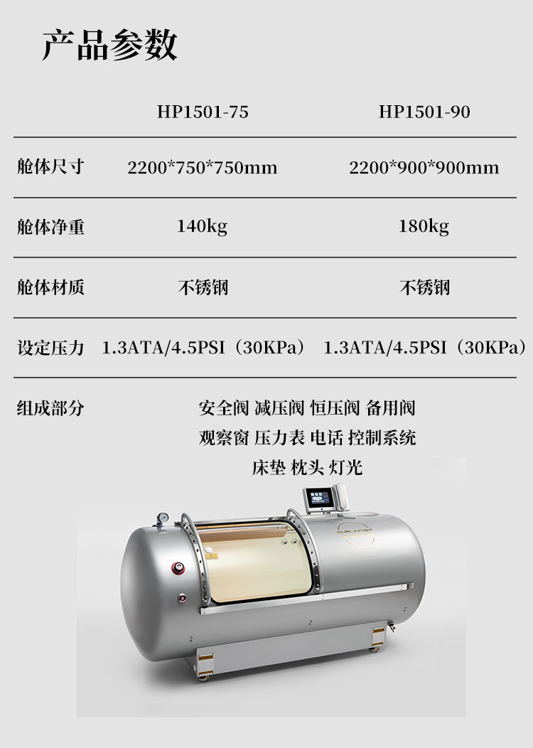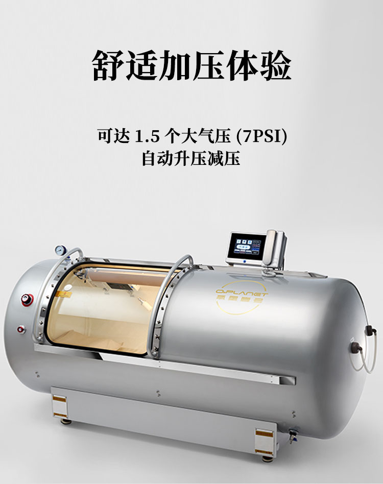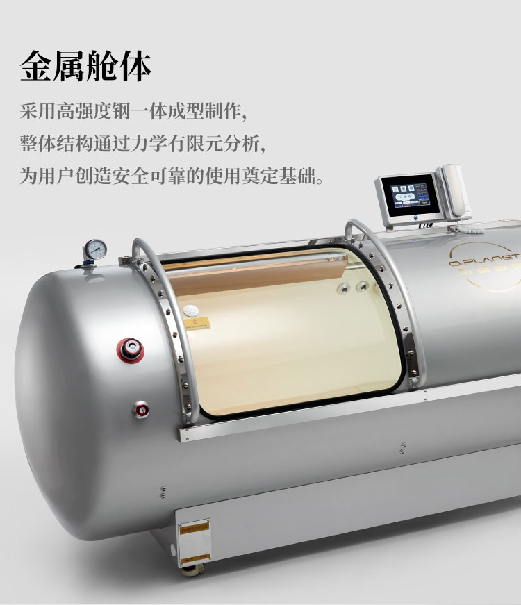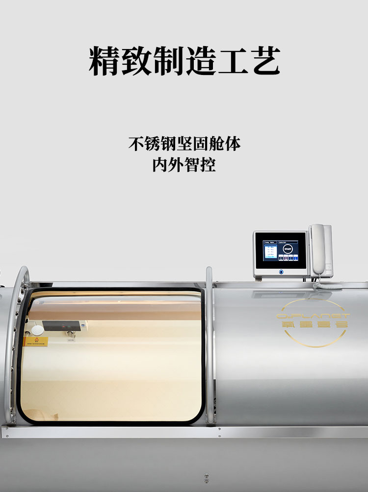 压力可以达到1.5ATA,一体成型,舱体是不锈钢材质,舱门是PC材质;可以一键升压,舱内带空调,内外对话系统,暖光灯等,操作简单方便。