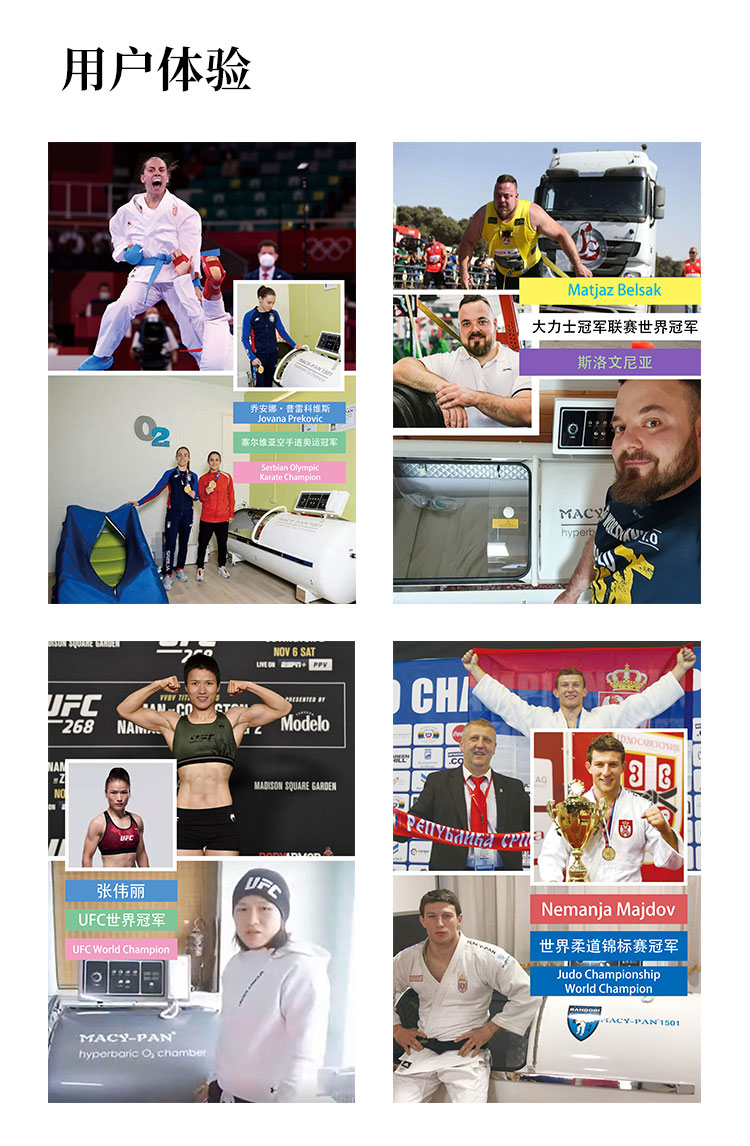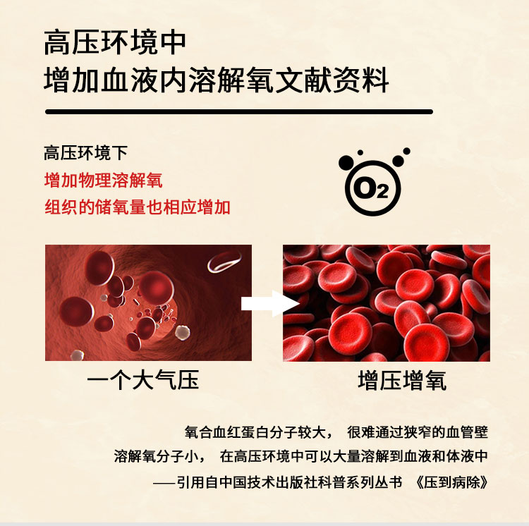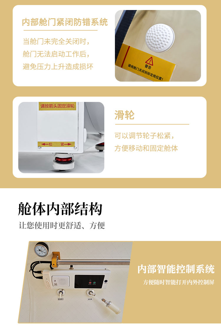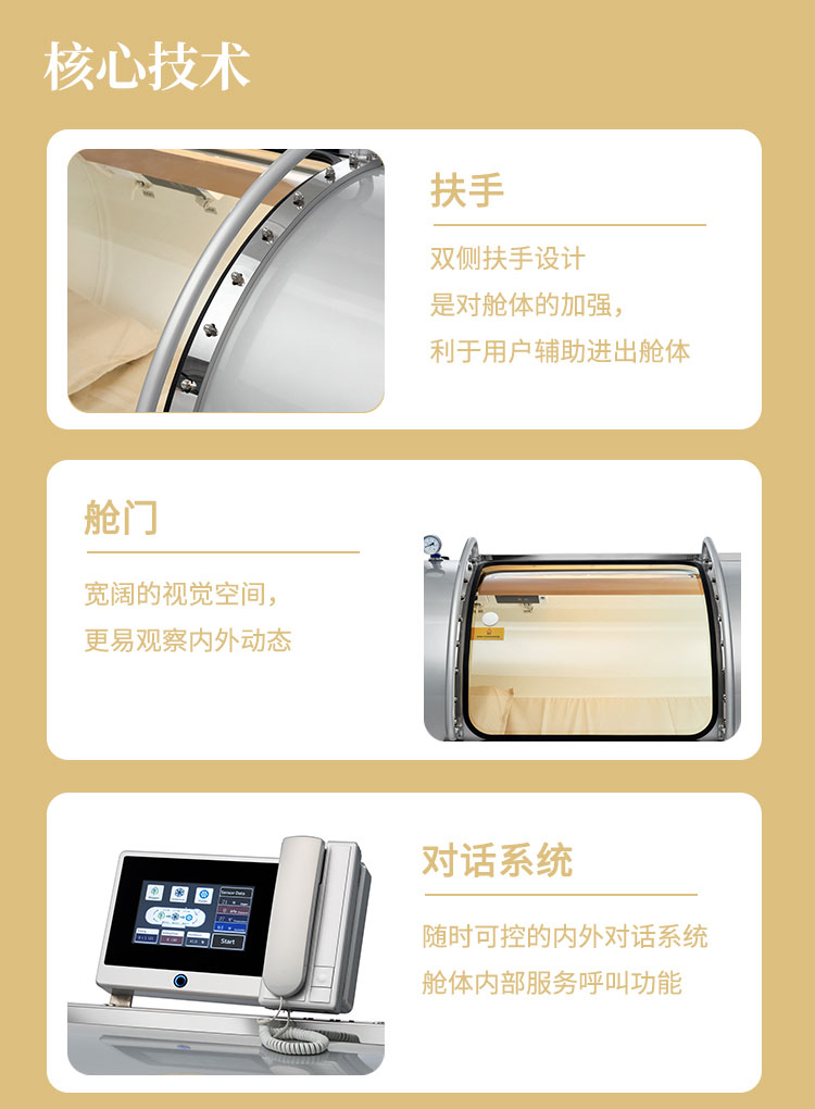 压力可以达到1.5ATA,一体成型,舱体是不锈钢材质,舱门是PC材质;可以一键升压,舱内带空调,内外对话系统,暖光灯等,操作简单方便。