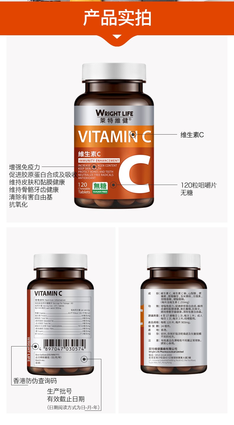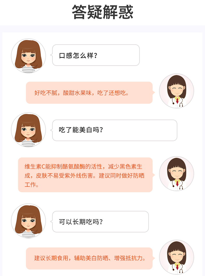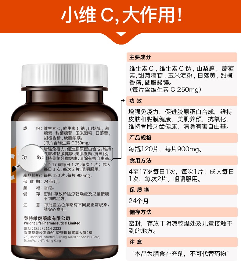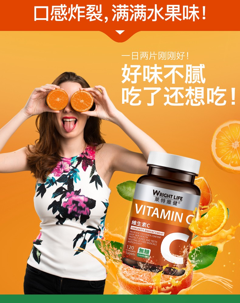 主要成份为维生素C,每片维C高达250毫克,两片可满足成人日常维C摄取量的需求,酸甜的橙子口味,不添加糖,咀嚼食用,可增强自身免疫力,呵护皮肤和黏膜的健康,促进骨骼牙齿的健康,还可清除自由基,达到美容养颜的作用。每日一次,成人2片,青少年1片,尤其适合白领人群。