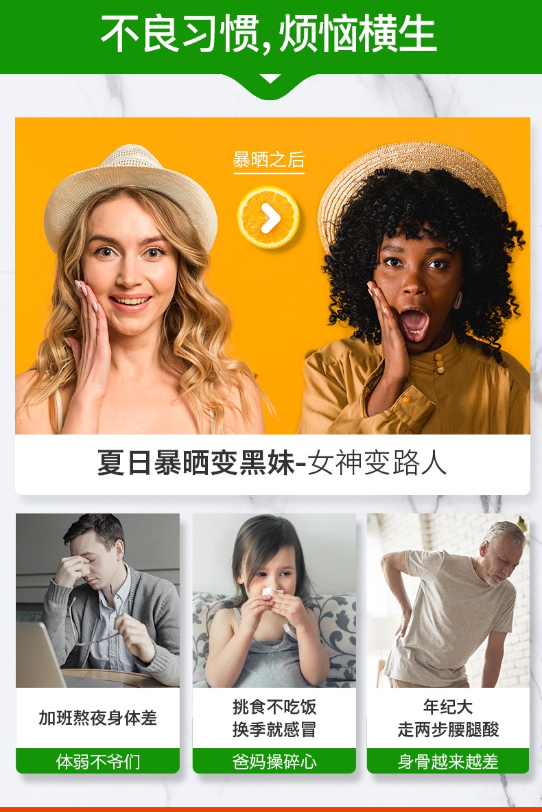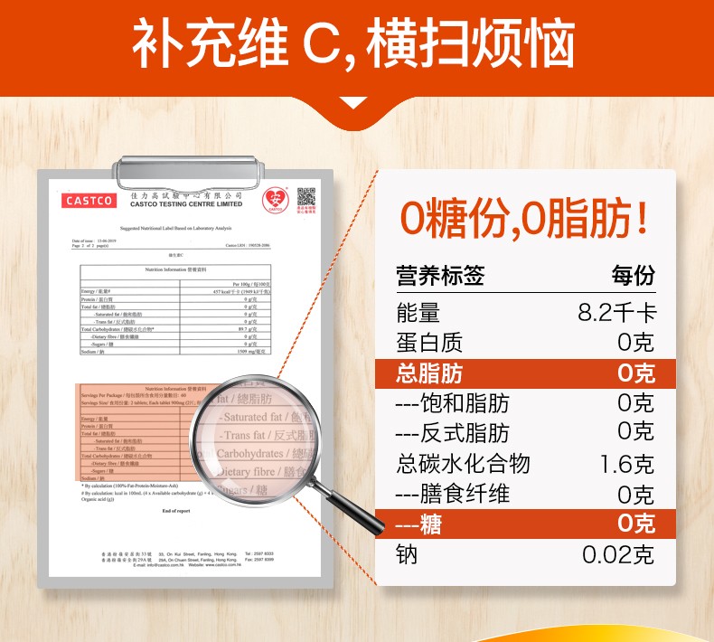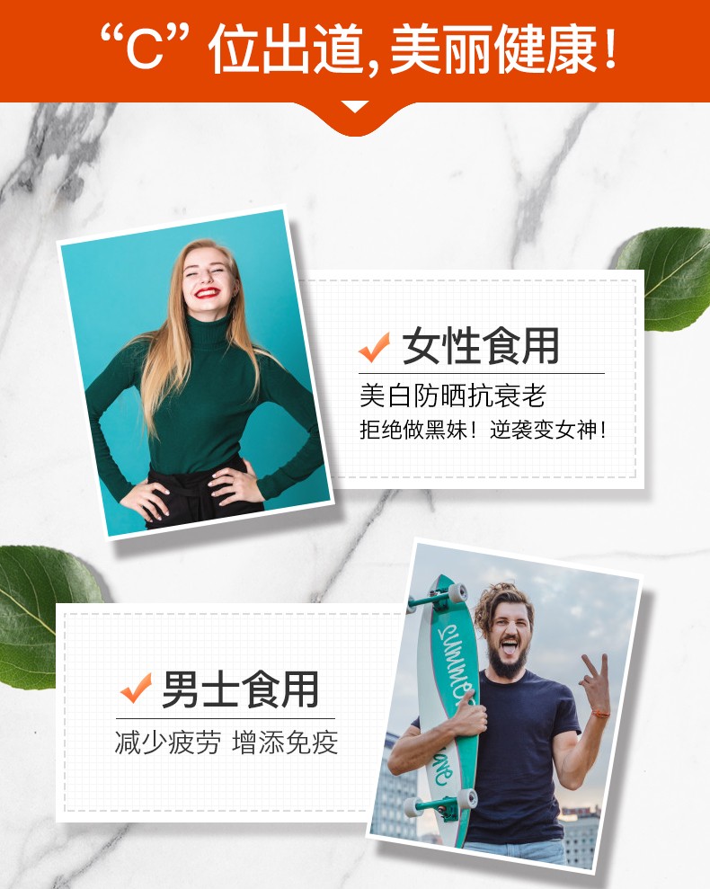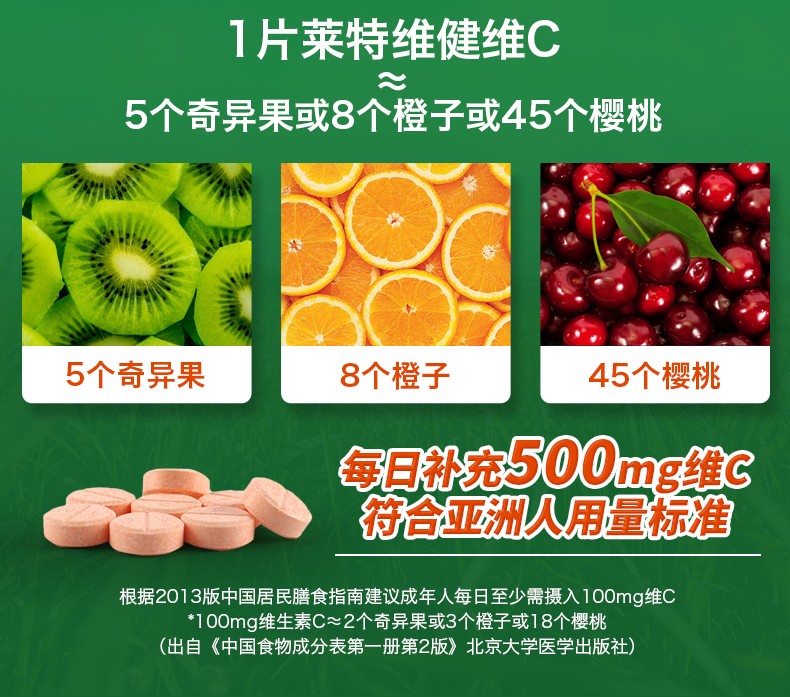 主要成份为维生素C,每片维C高达250毫克,两片可满足成人日常维C摄取量的需求,酸甜的橙子口味,不添加糖,咀嚼食用,可增强自身免疫力,呵护皮肤和黏膜的健康,促进骨骼牙齿的健康,还可清除自由基,达到美容养颜的作用。每日一次,成人2片,青少年1片,尤其适合白领人群。