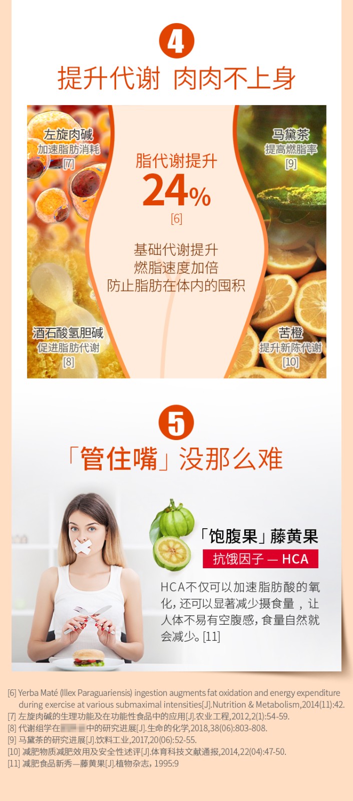 旨在通过支持健康的代谢,运用科学复合配方,有助于卡路里的消耗; 精选肌醇、绿咖啡、藤黄果、左旋肉碱、瓜拉纳等体态管理营养。