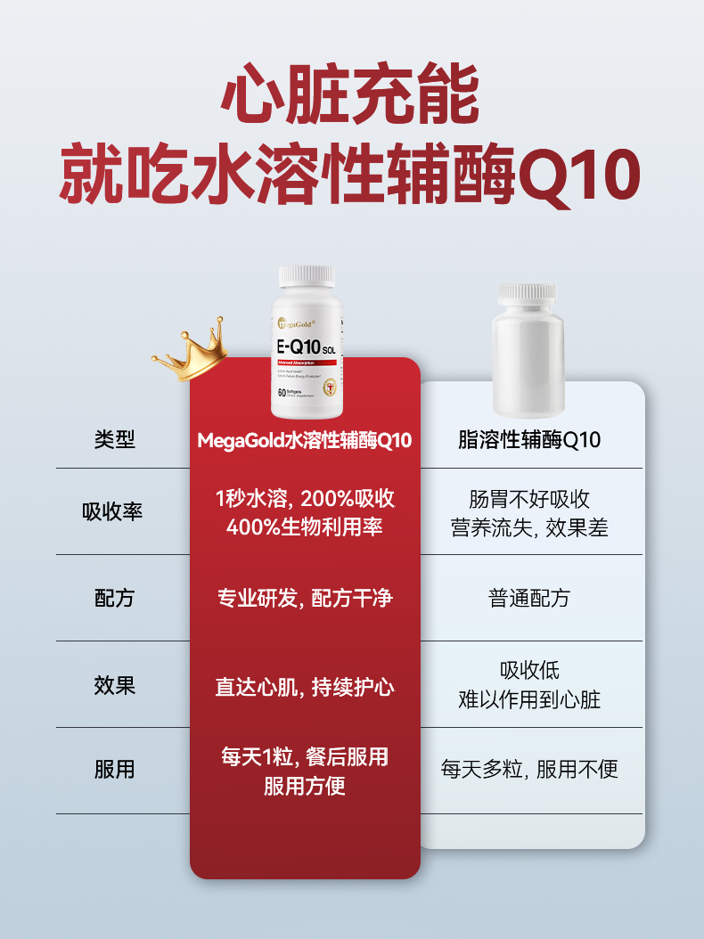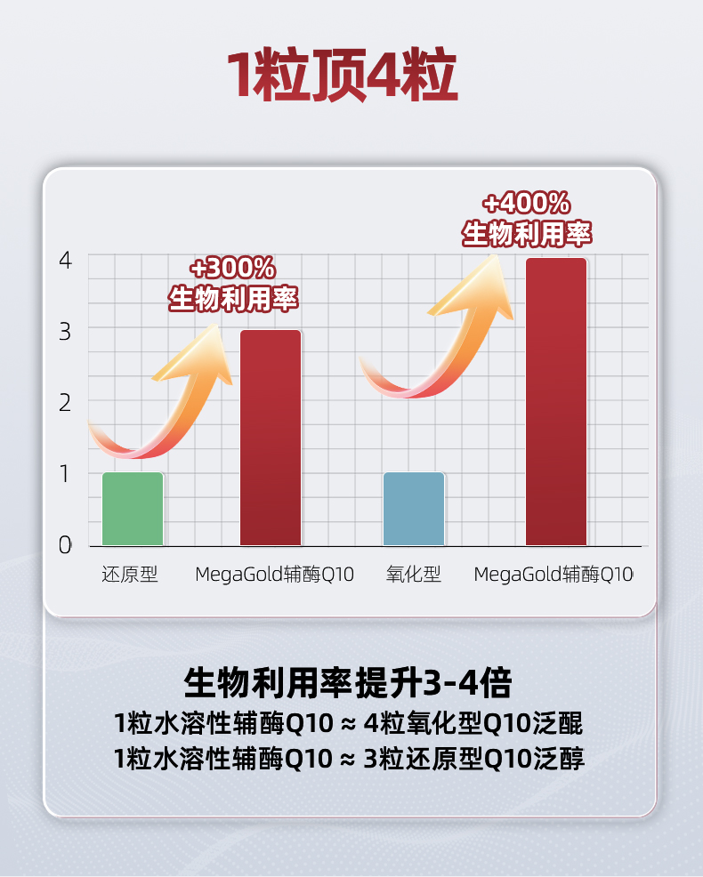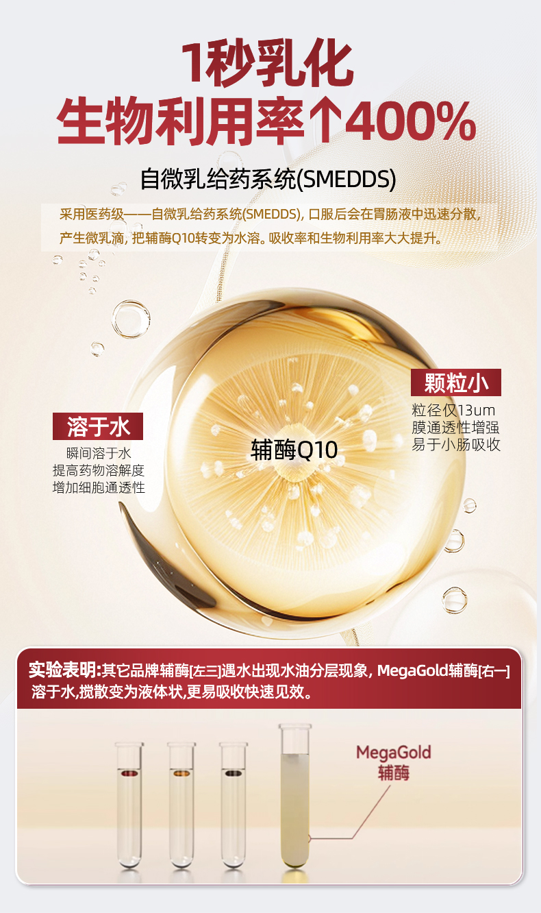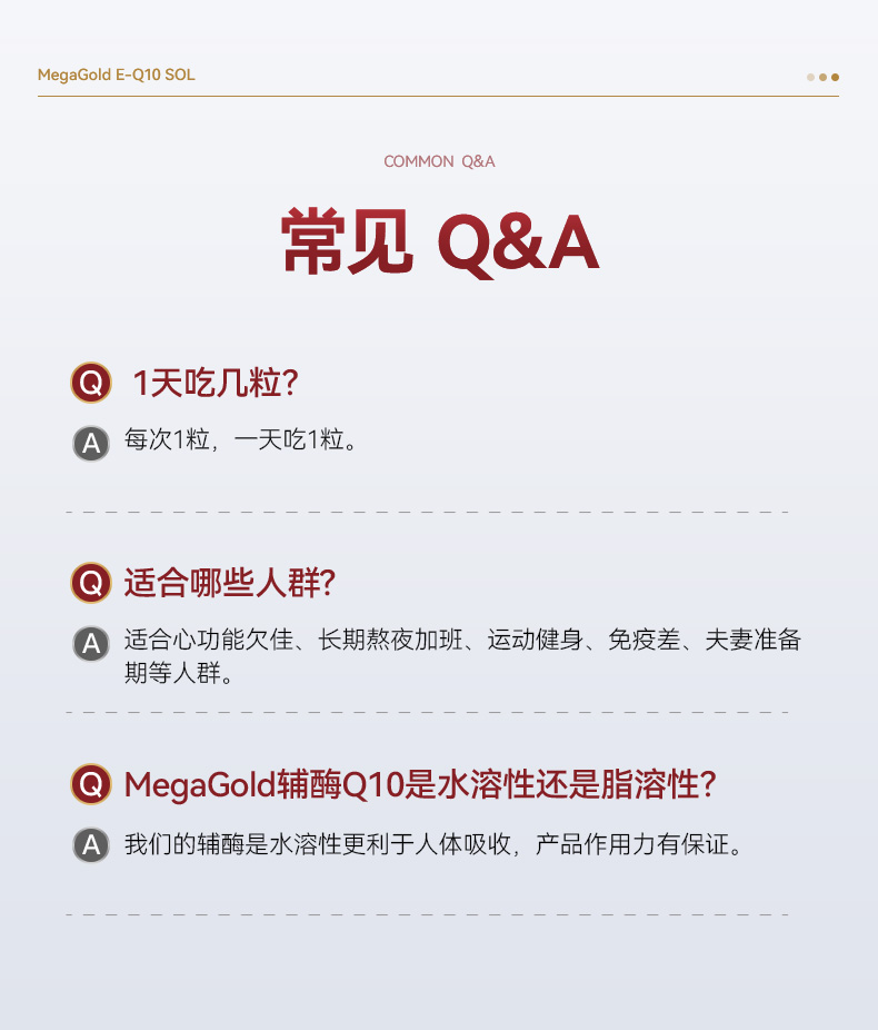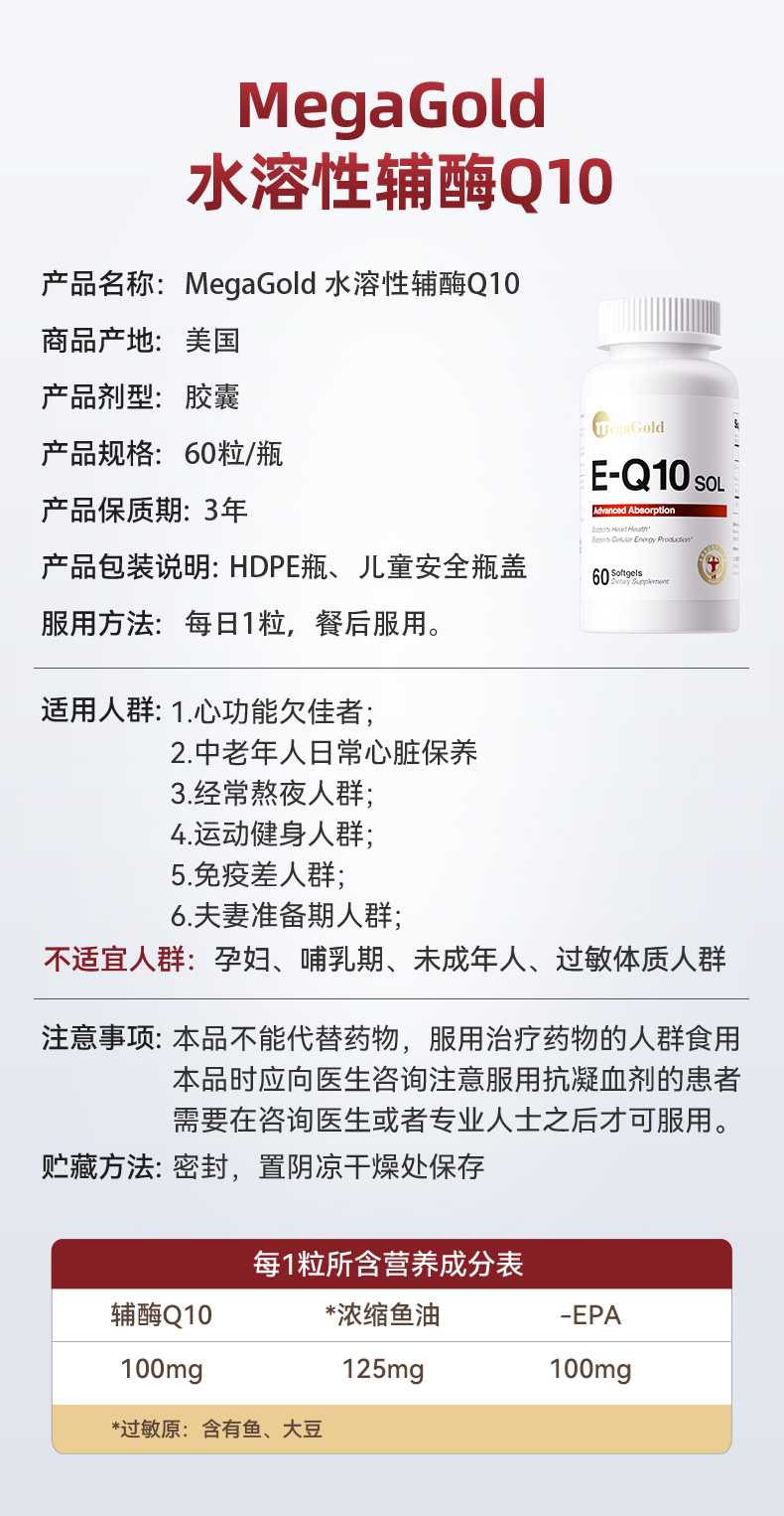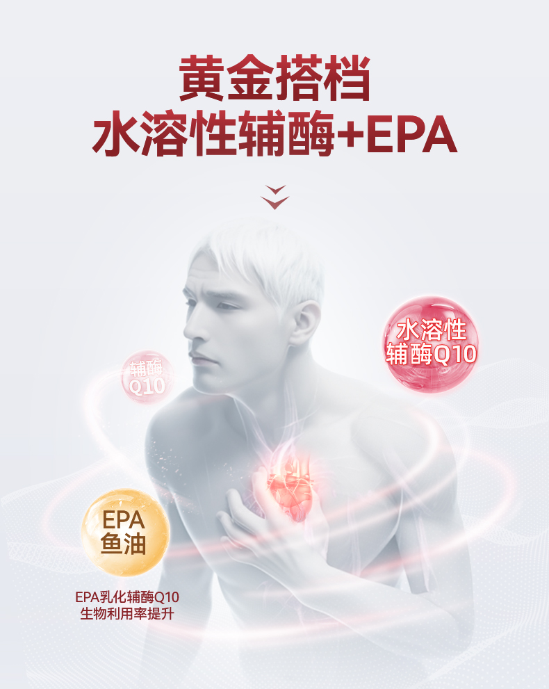 每1粒含 *辅酶Q10 100mg *浓缩鱼油 125mg -EPA 100mg ①第四代自乳化辅酶,突破吸收难题 ②对备孕、增强免疫力、提供运动耐力及减少他汀药物副作用均有明显效果