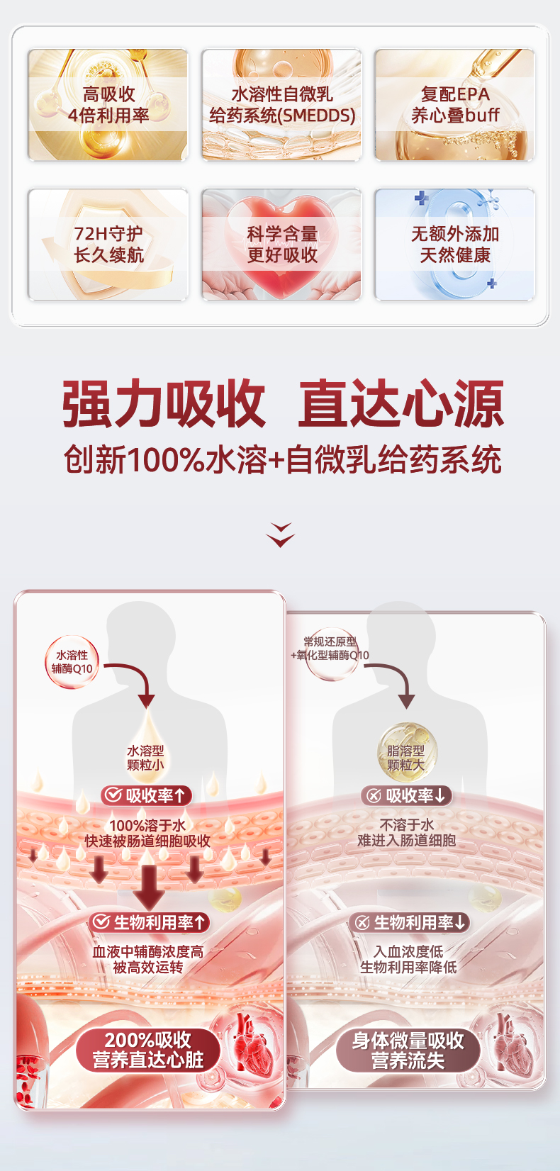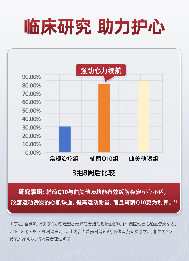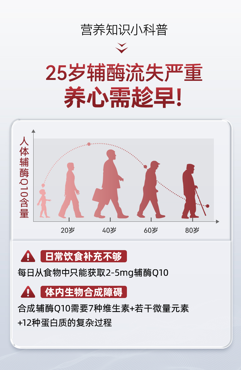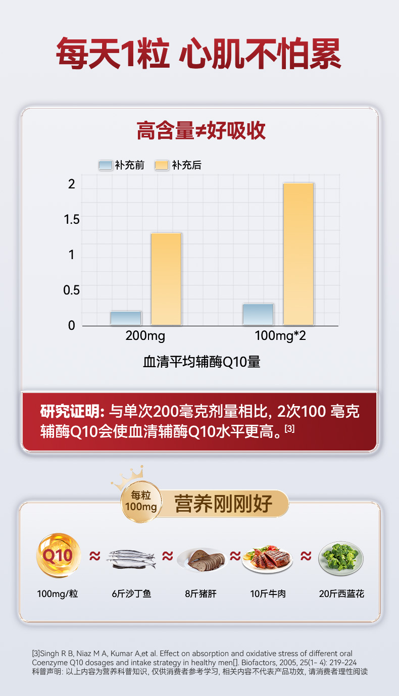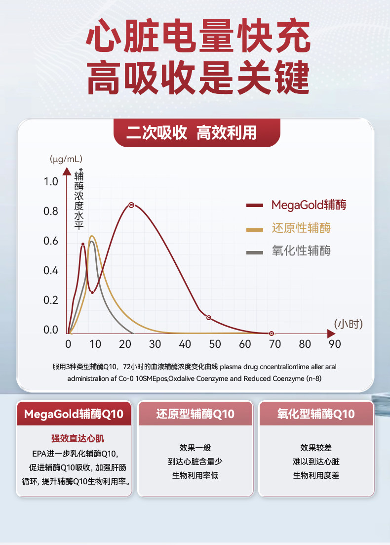 每1粒含 *辅酶Q10 100mg *浓缩鱼油 125mg -EPA 100mg ①第四代自乳化辅酶,突破吸收难题 ②对备孕、增强免疫力、提供运动耐力及减少他汀药物副作用均有明显效果