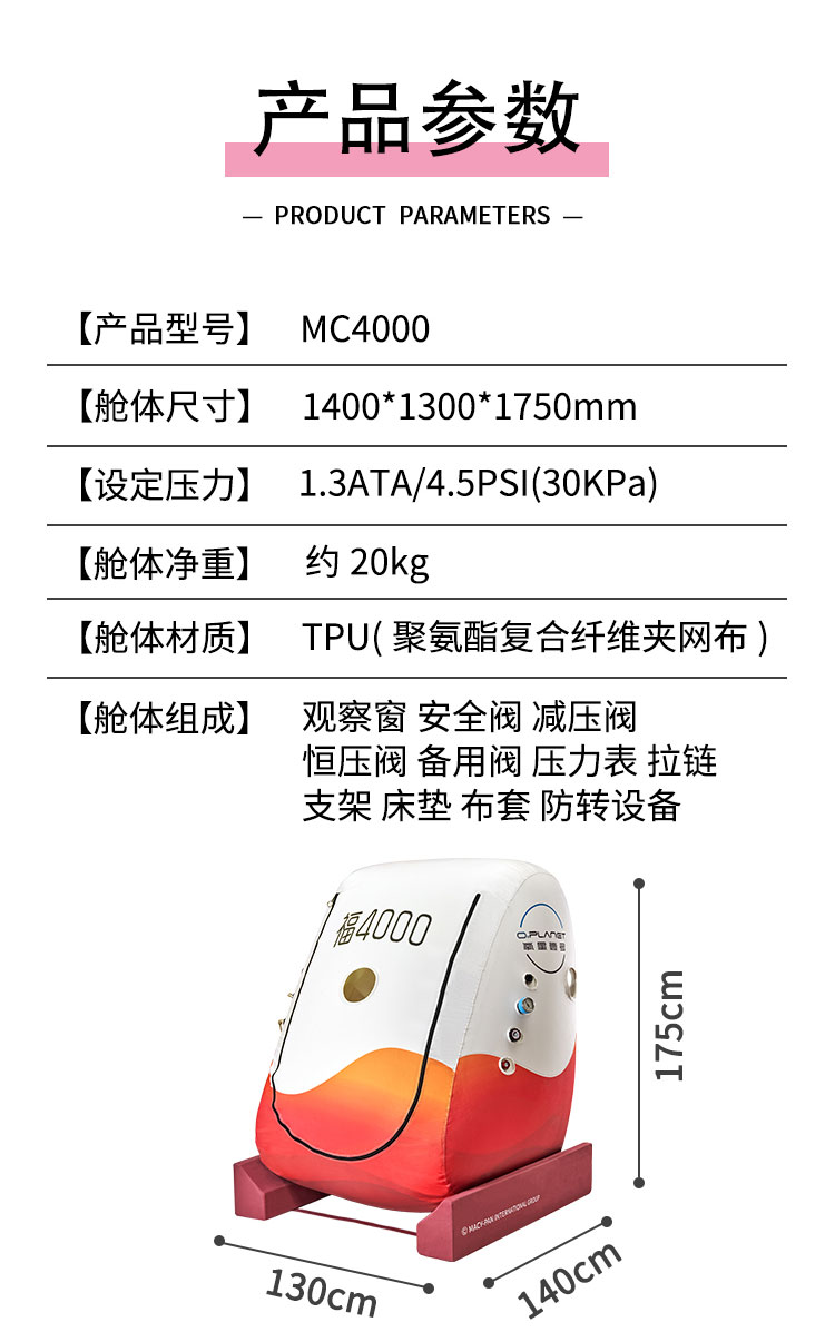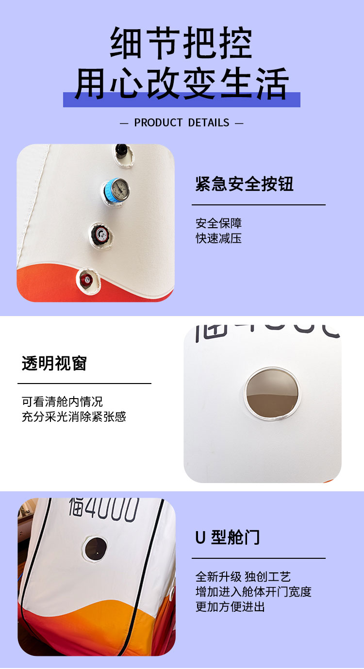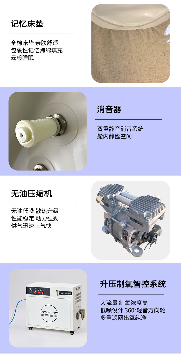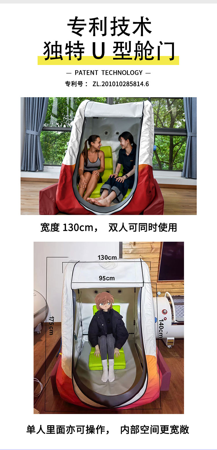 舱体材质:TPU(聚氨酯复合纤维夹网布)一体机材质:铁合金(表面涂装处理); 有“U”型门和“N”型门可选择,轮椅可进入氧舱;可容纳2把座椅,空间舒适。 用途:保健养生辅助用