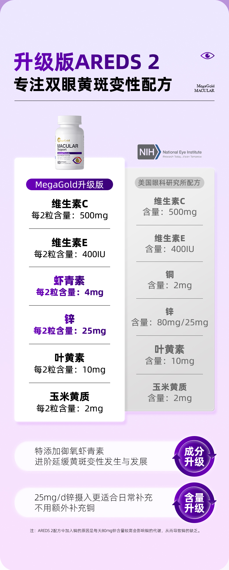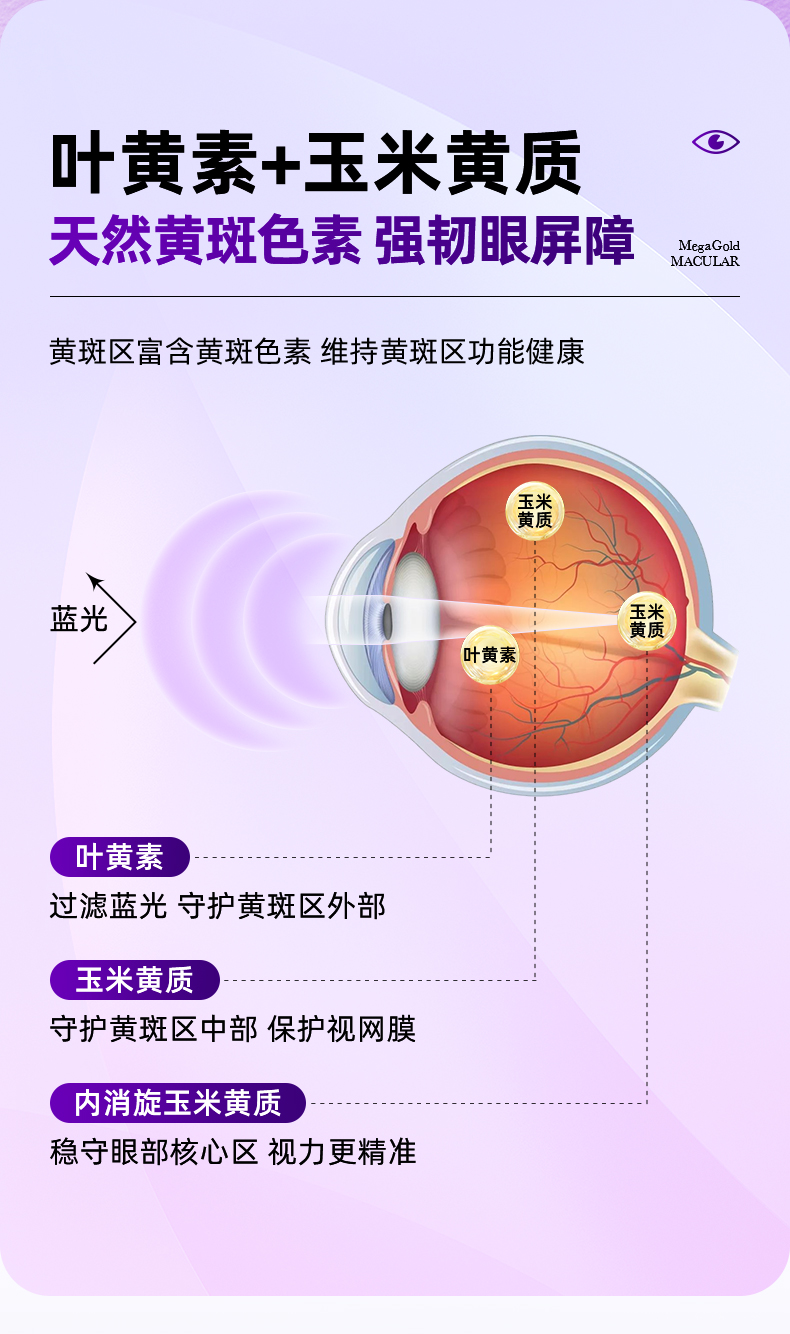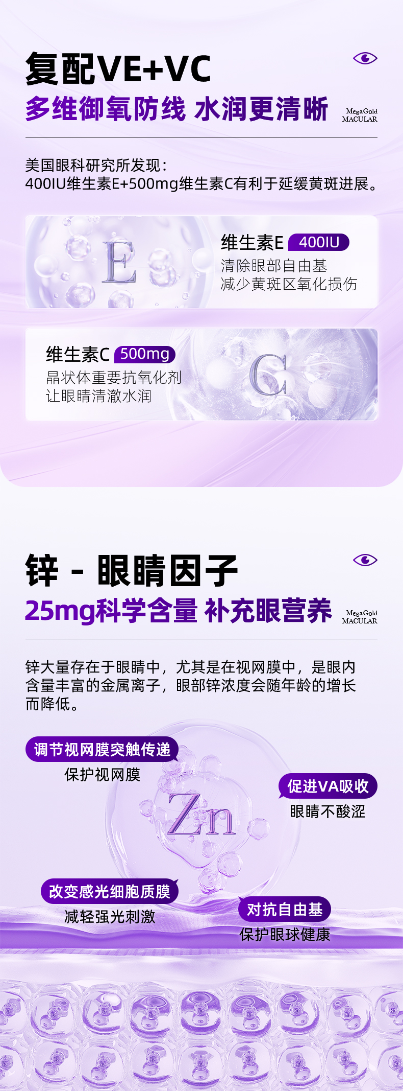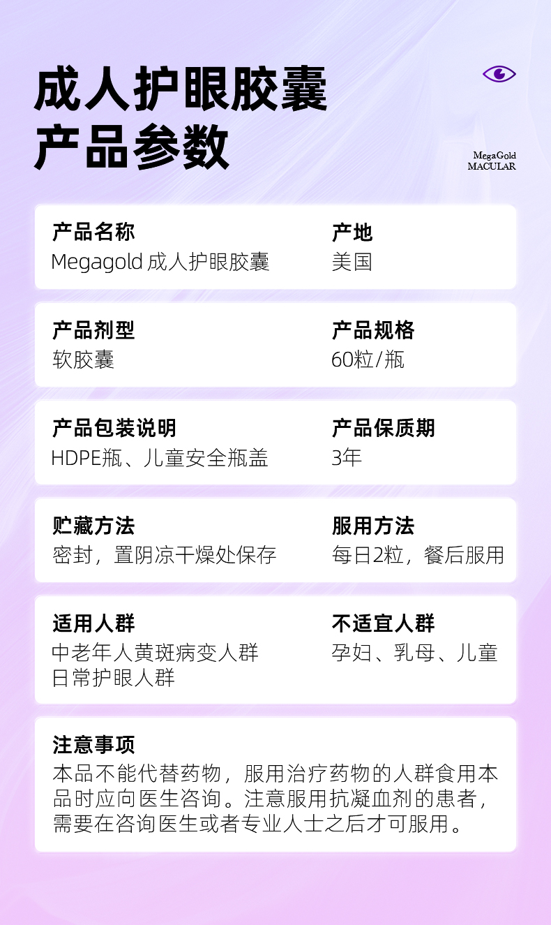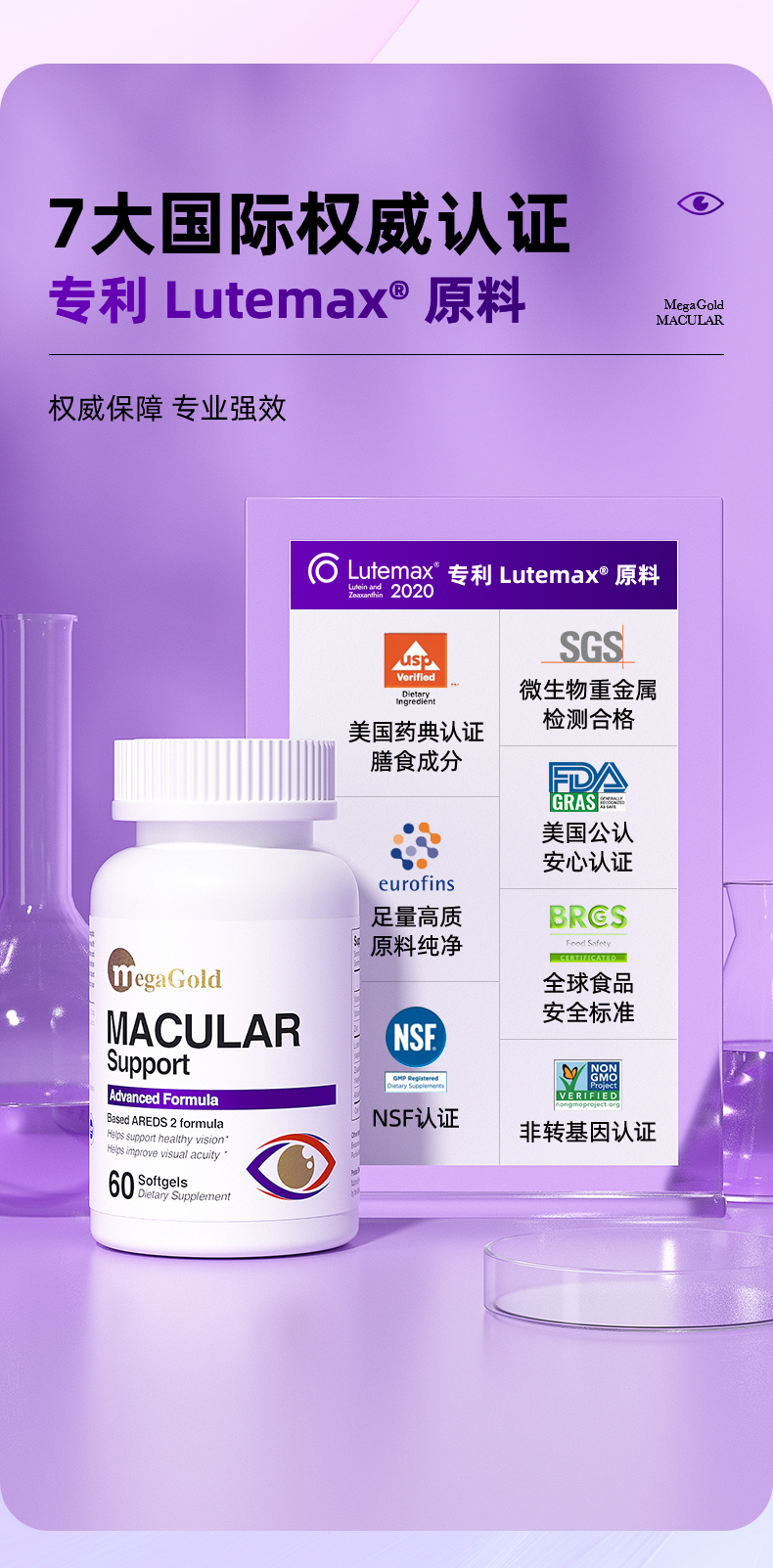 每2粒含: *叶黄素 10mg *玉米黄质 2mg *锌 25mg *虾青素 4mg *维生素C 500mg *维生素E 400IU ①延缓黄斑病变进展 ②降低视觉丧失风险 ③Lutemax®专利原料