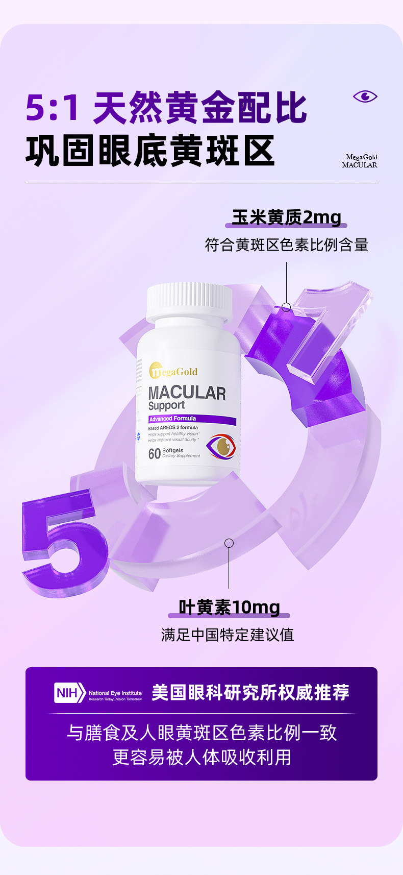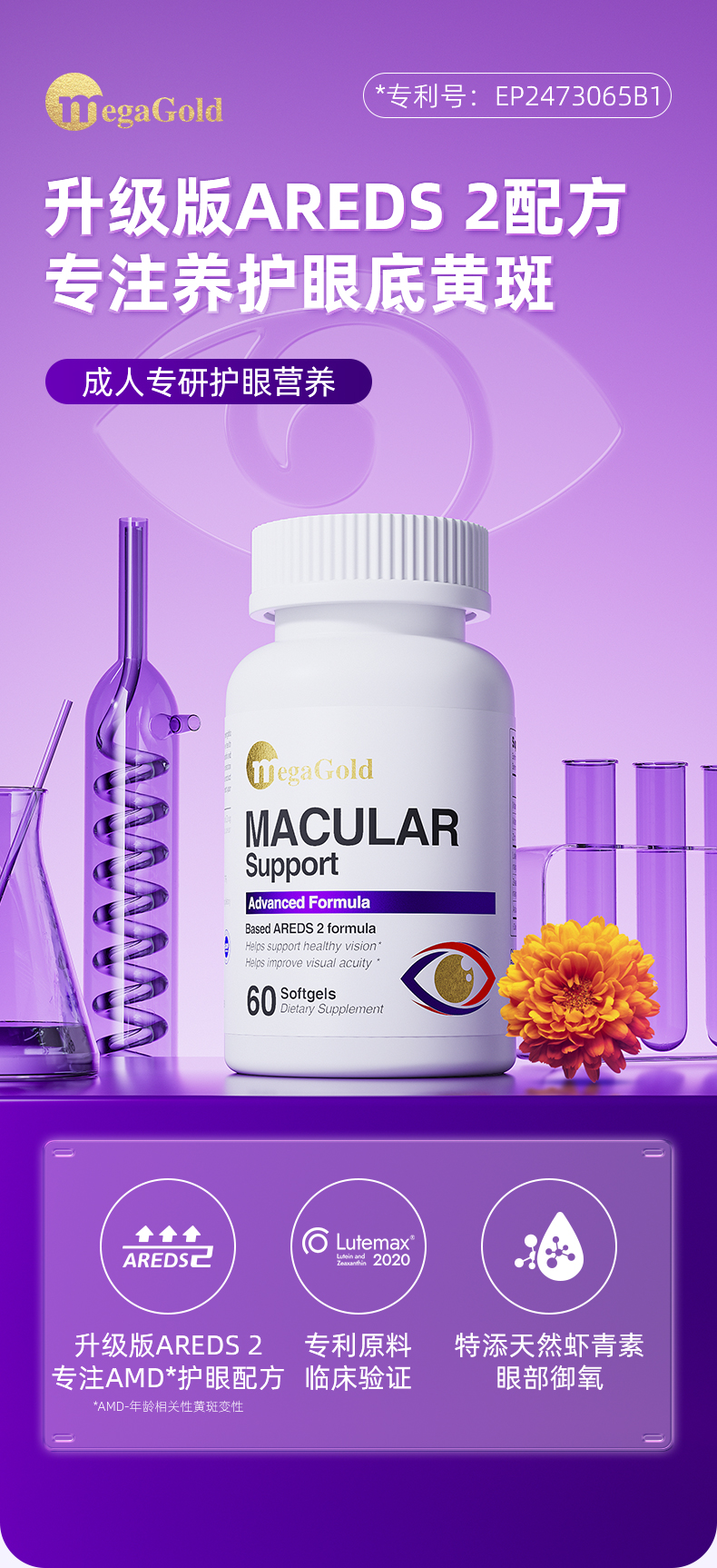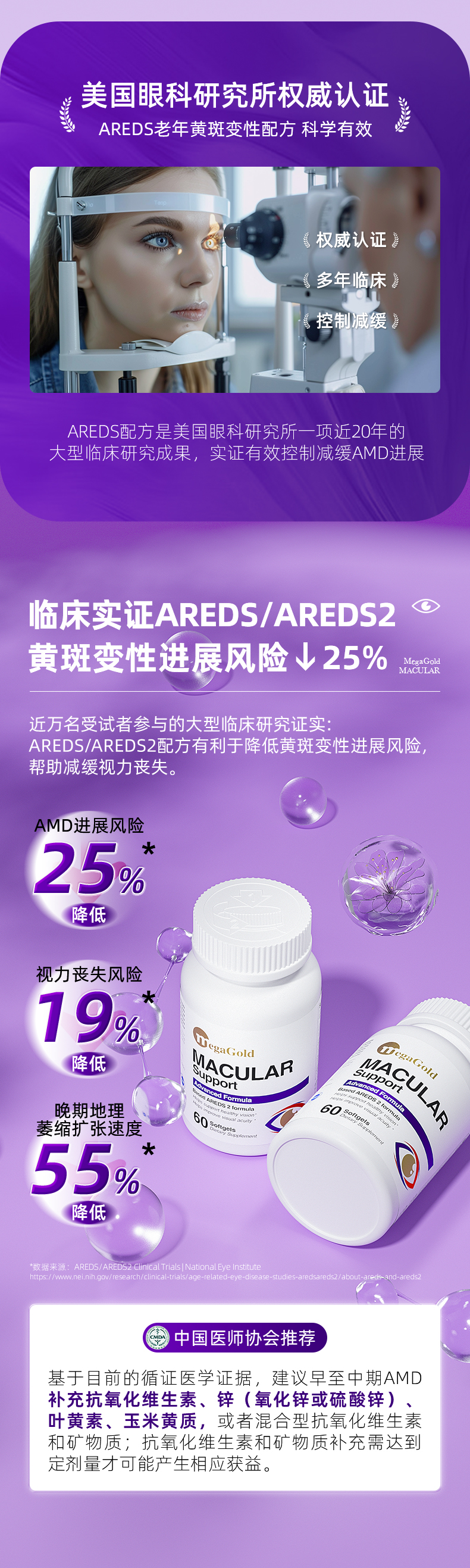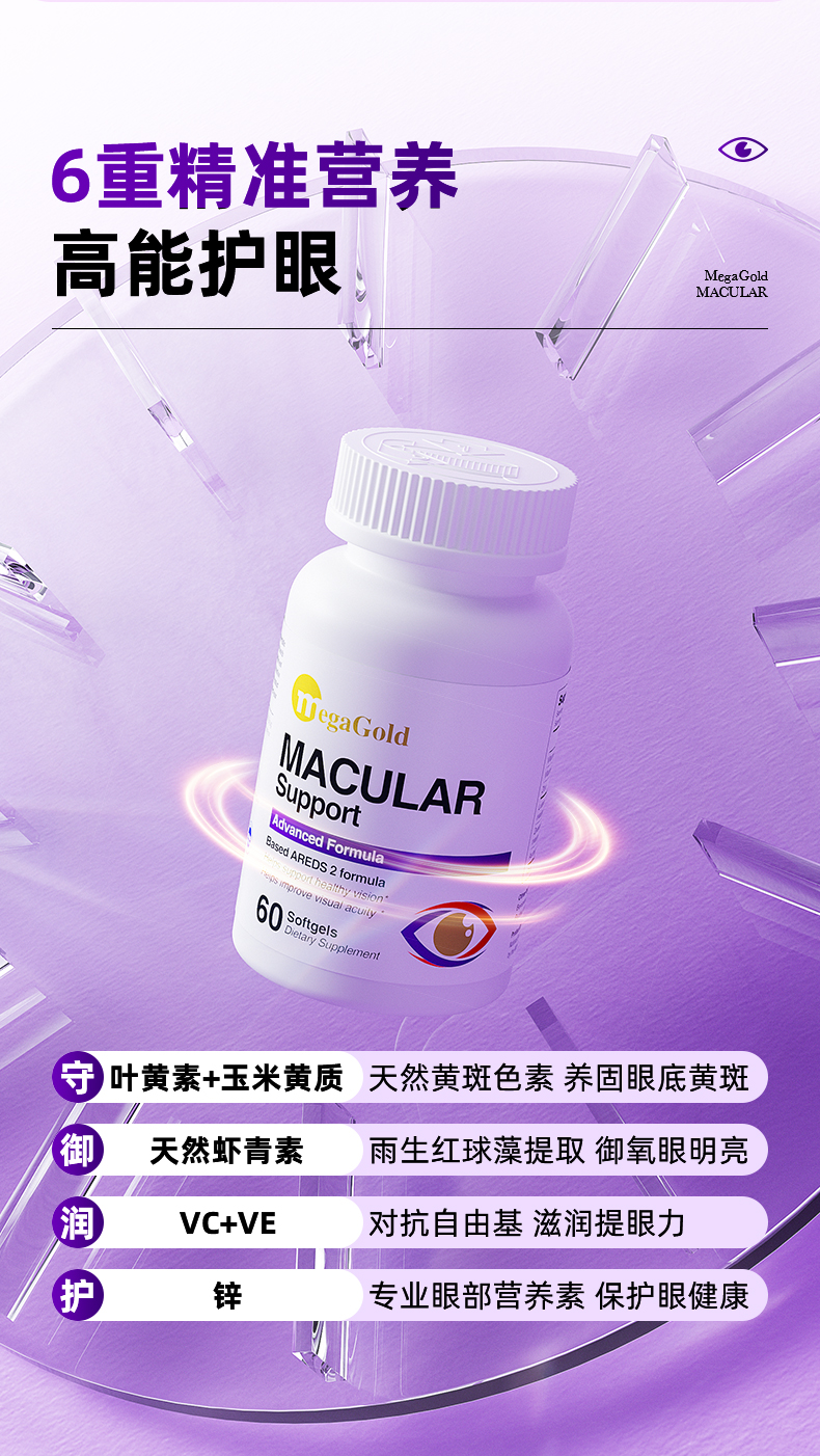 每2粒含: *叶黄素 10mg *玉米黄质 2mg *锌 25mg *虾青素 4mg *维生素C 500mg *维生素E 400IU ①延缓黄斑病变进展 ②降低视觉丧失风险 ③Lutemax®专利原料