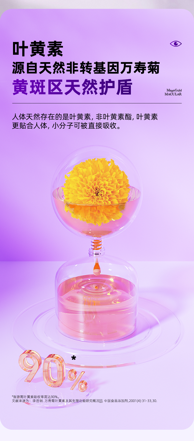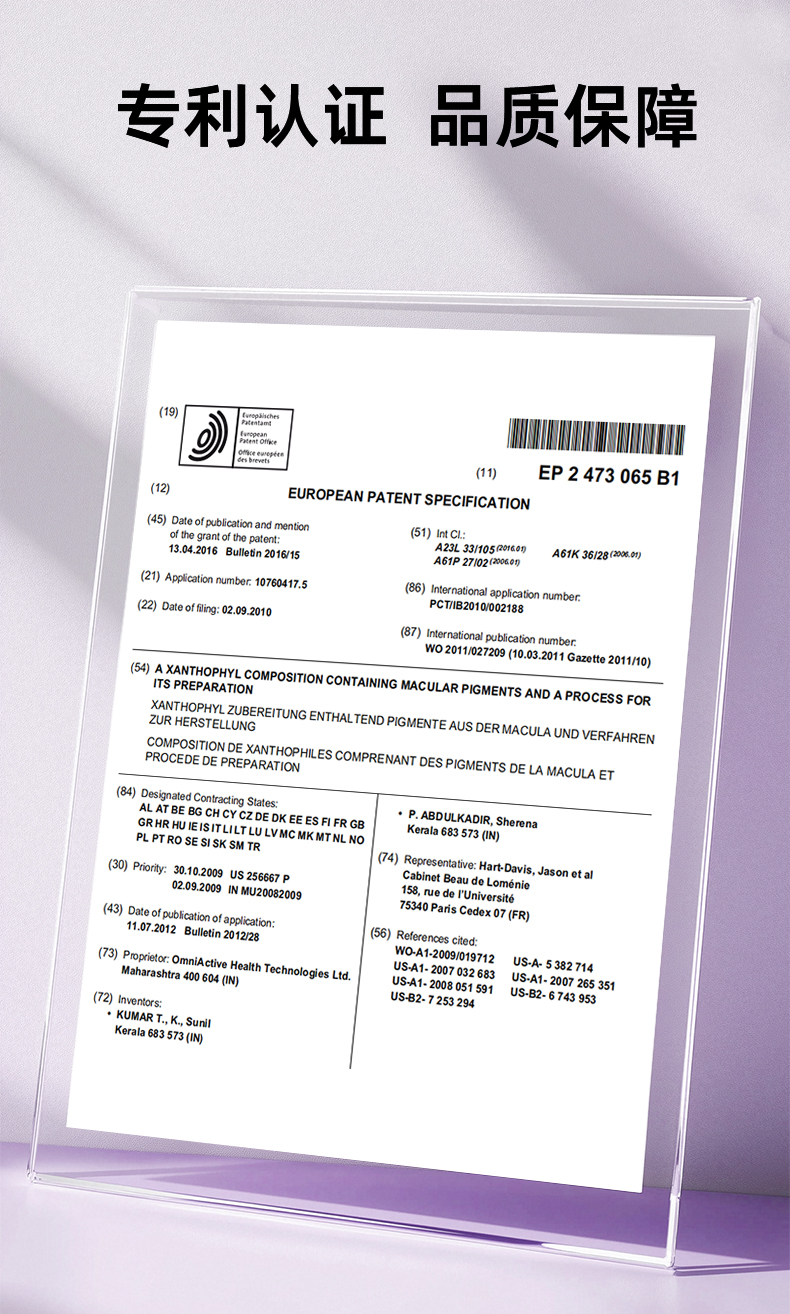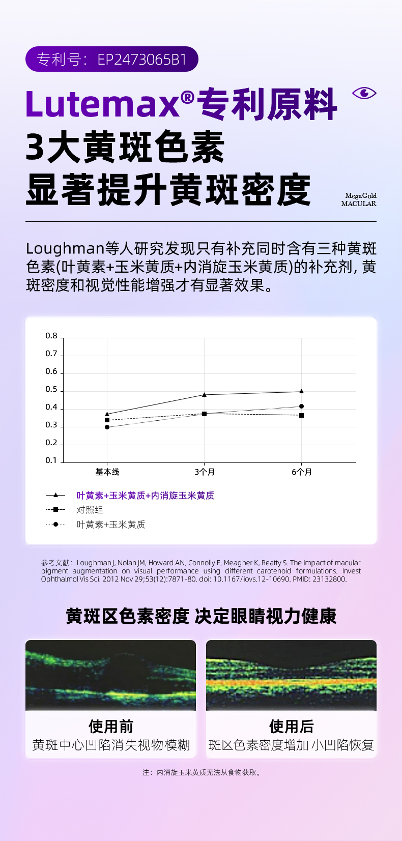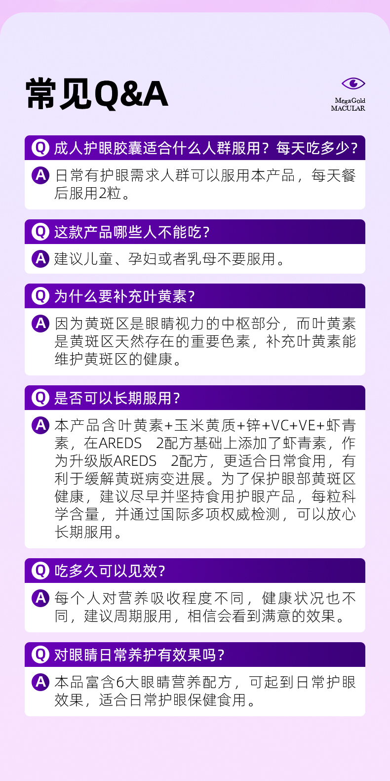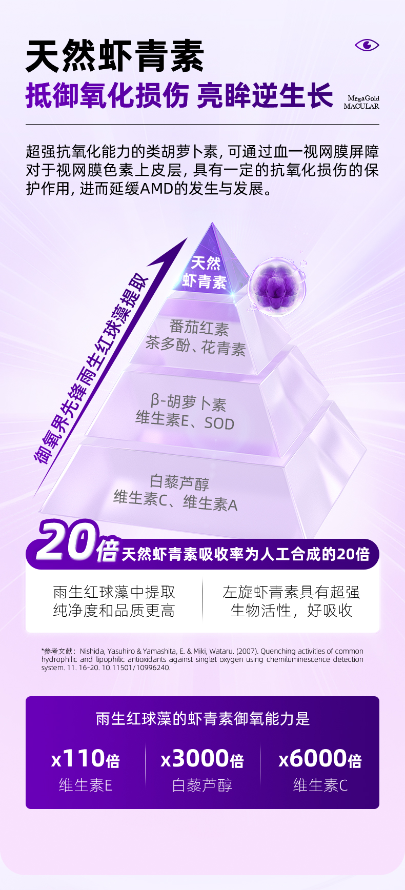 每2粒含: *叶黄素 10mg *玉米黄质 2mg *锌 25mg *虾青素 4mg *维生素C 500mg *维生素E 400IU ①延缓黄斑病变进展 ②降低视觉丧失风险 ③Lutemax®专利原料