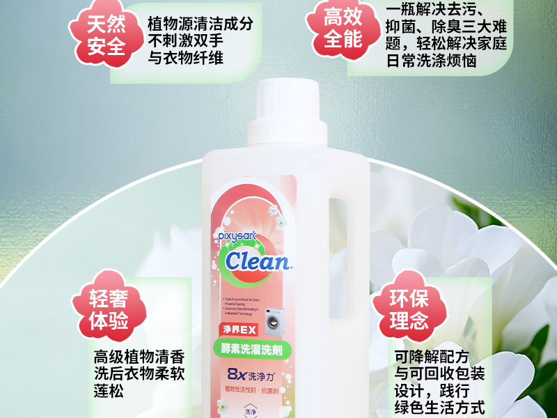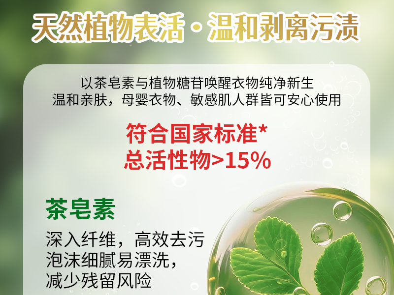 天然植萃+科技抗菌——茶皂素+银离子,洁净与守护并存 三重酵素靶向去渍——顽固污渍层层分解,低温洗涤也高效 99%抑菌率——长效防异味,敏感肌、宝宝衣物更安心 国家标准认证——符合《QB/T 1224-2012 衣料用液体洗涤剂》国家标准,总活性物含量>15%(行业高标准,清洁力有保障)