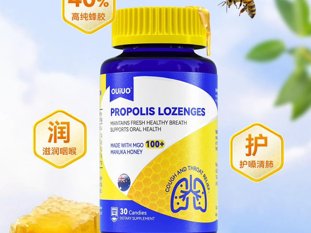 喉糖是一种可以缓解喉咙不适、咳嗽或喉咙疼痛的药品或食品。普通喉糖含都有薄荷、蜂蜜、柠檬等成分,这款OUIUO品牌无糖蜂胶喉糖每片添加珍贵澳洲严寒高山邓恩桉桉树油、动植物界的“软黄金”新西兰蜂胶、高品质的 MGO100+麦卢卡蜂蜜,不仅具有清凉舒爽的效果,还能帮助舒缓止咳消炎,畅爽通气,保护呼吸道健康。所以喉糖在寒冷干燥的天气或喉咙不适等情况就特别受到人们的青睐,是一种常见的药品或保健食品。如果您感到喉咙不适,可以考虑使用喉糖来缓解症状。 强大呵护嗓肺配方,一含缓喉痛,清咽止咳消炎利器 换季不适,畅爽通气,保护呼吸道健康,持续舒爽 • “软黄金”澳洲蜂胶,缓解咽炎,减轻喉咙干痒、异物感的情况 • 澳洲严寒高山邓恩桉桉树油,抑制炎反应,深入润养咽喉,消炎清肺。 • 0脂肪、0抗生素、0防腐剂,0色素、无麸质,不含蔗糖,不易龋齿,健康无负担,全家都可以吃。