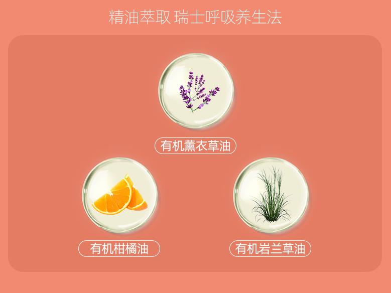 帮助您应对日常压力的一种令人感到放松的气味成分:有机薰衣草精油、有机柚子精油、有机岩兰草精油