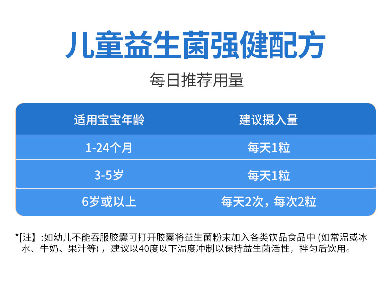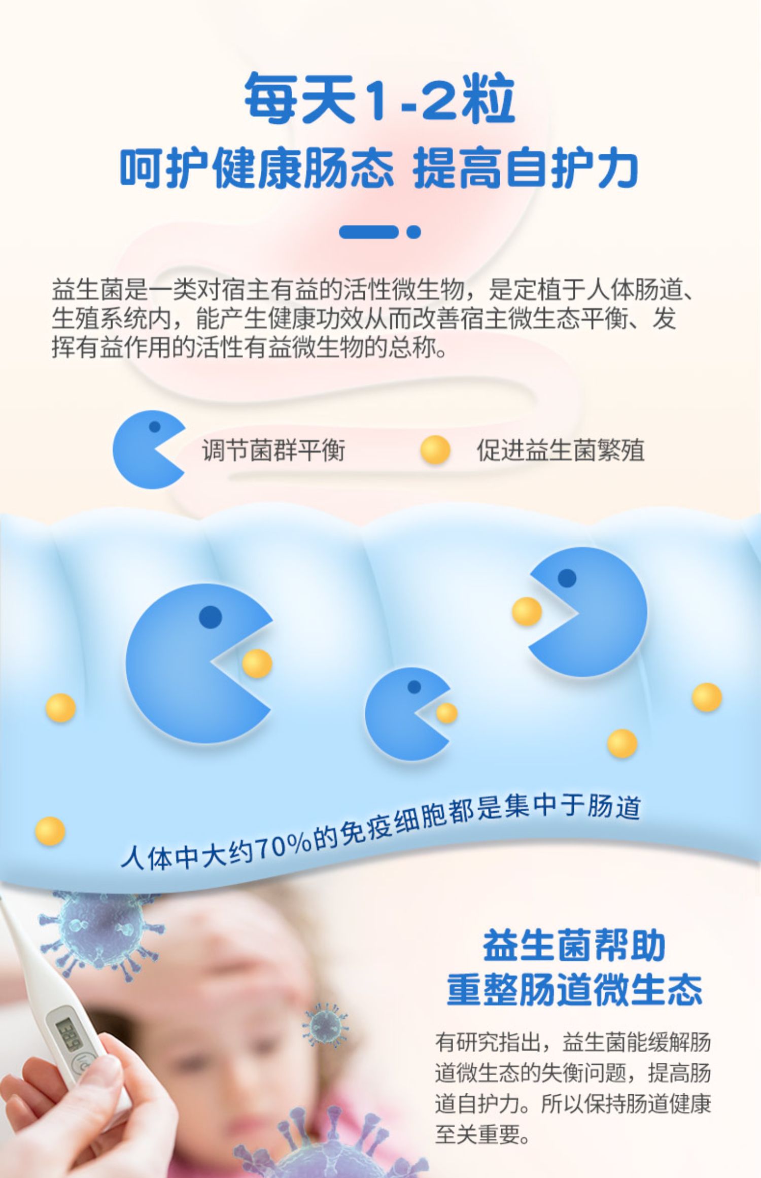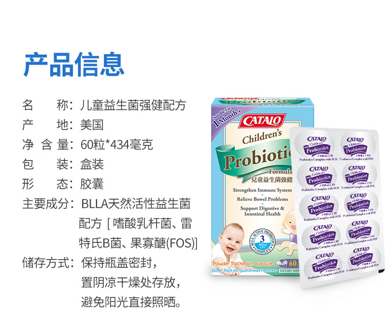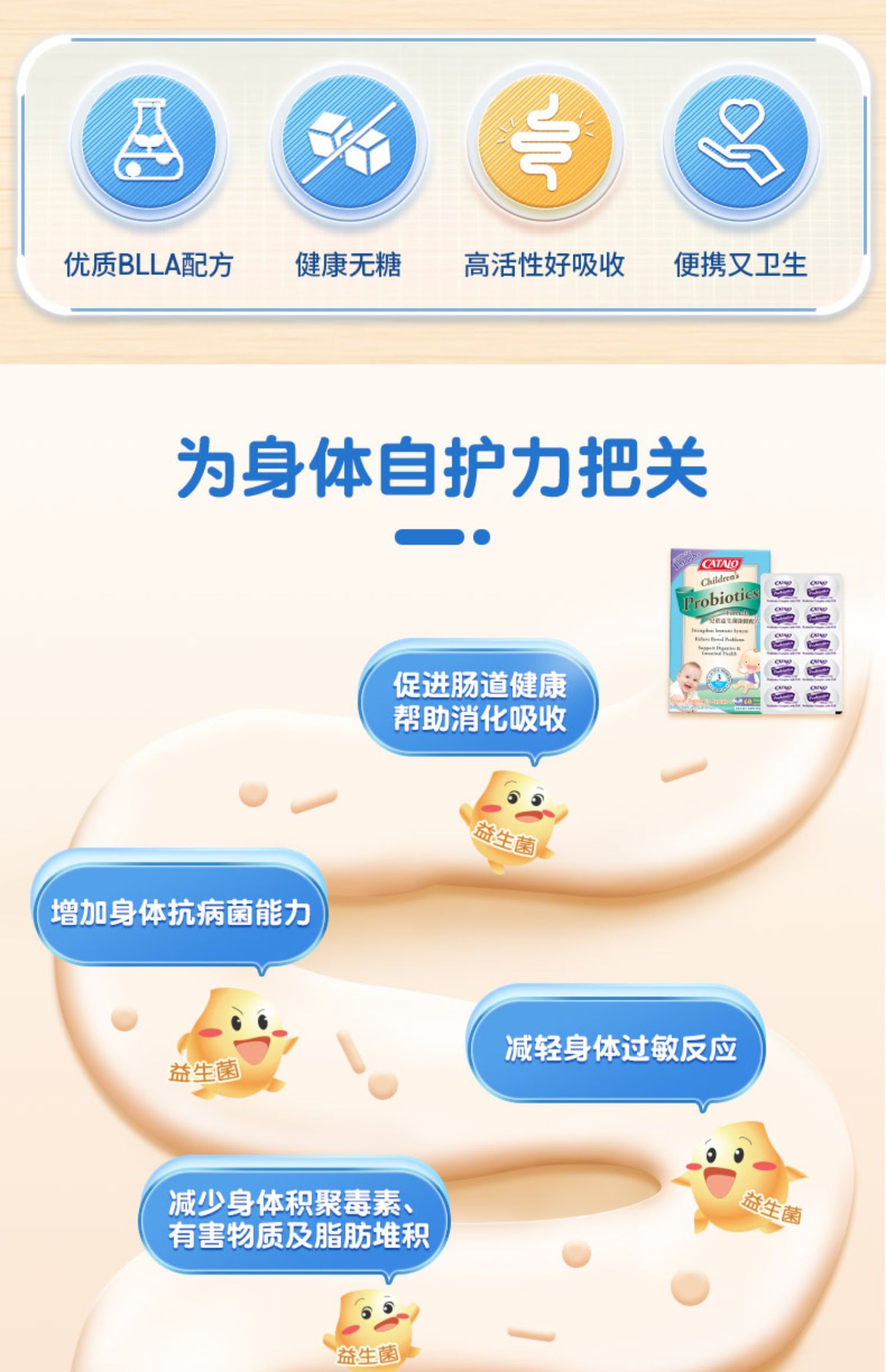 1:选用益生菌BLLA配方(嗜酸乳杆菌+雷特氏B菌),为儿童肠道补充有益菌 2:配合益生元-低聚果糖/FOS,有助益菌繁殖及肠道健康 3:每食用分量提供30亿单位活性益生菌 4:独立包装,方便又卫生