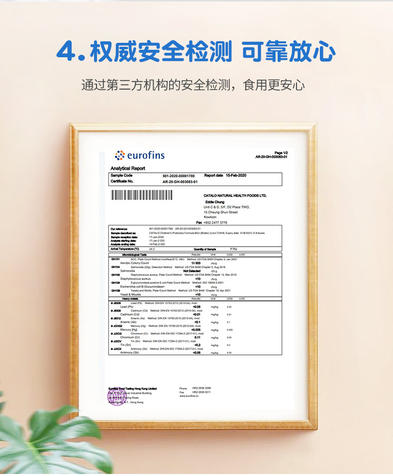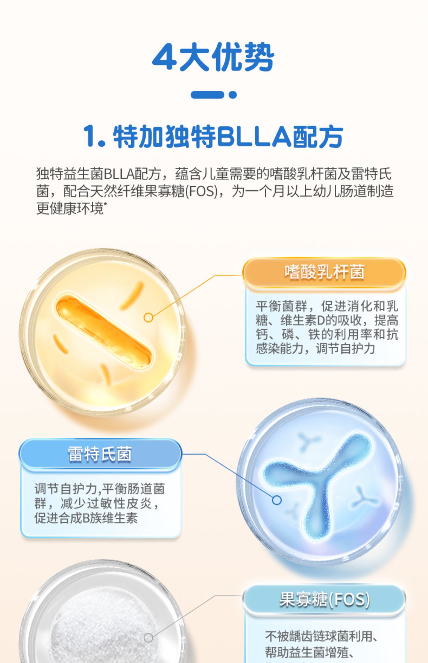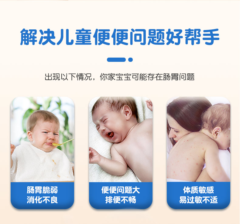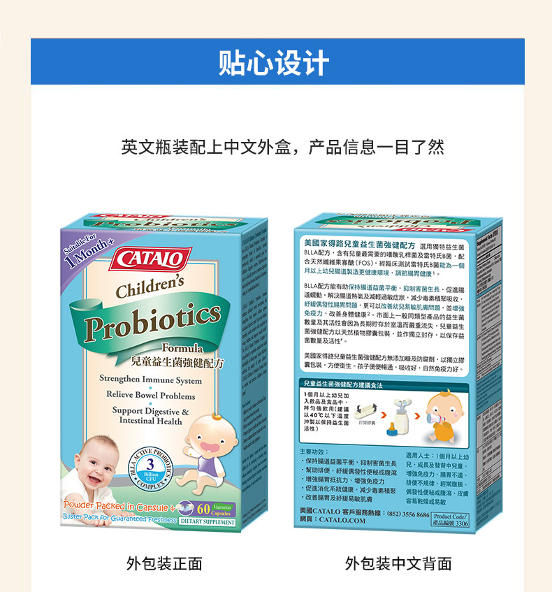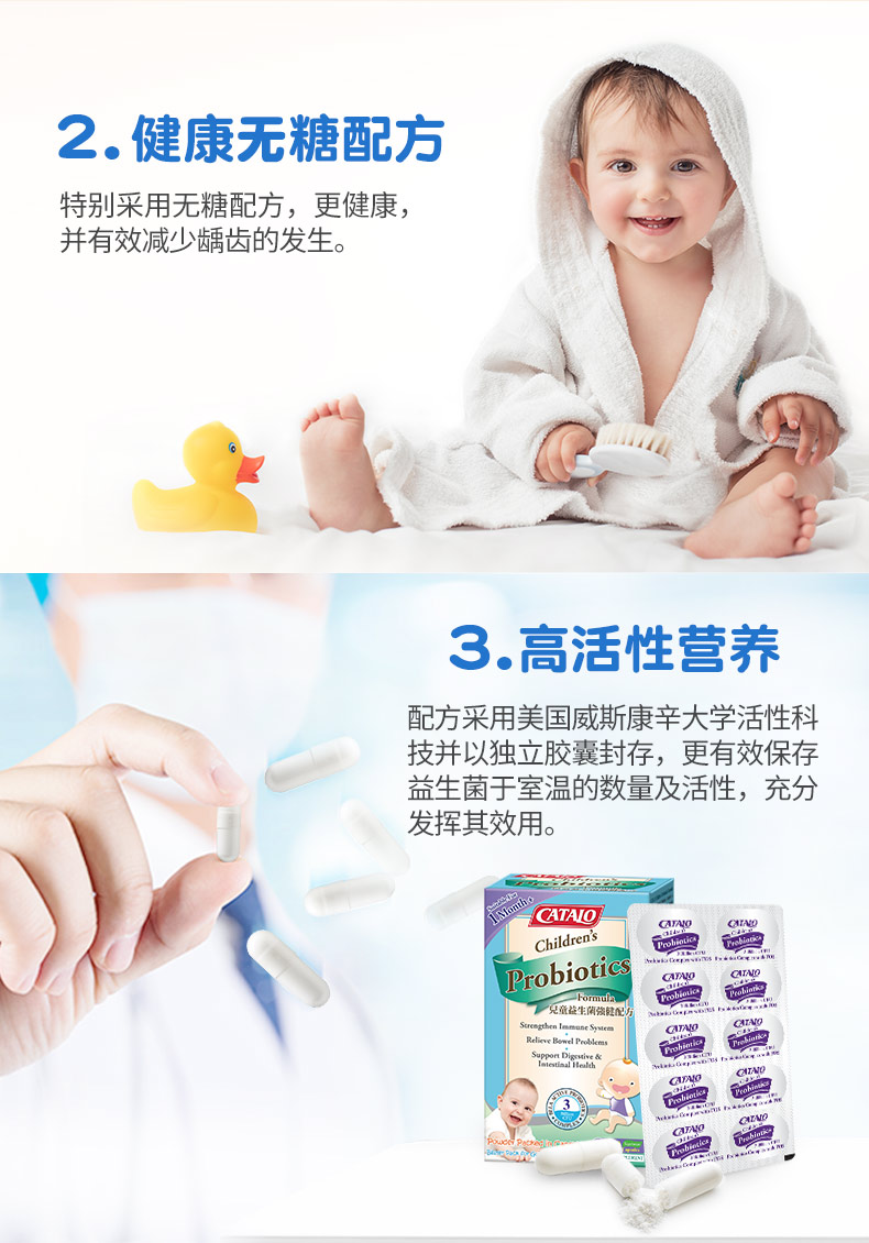 1:选用益生菌BLLA配方(嗜酸乳杆菌+雷特氏B菌),为儿童肠道补充有益菌 2:配合益生元-低聚果糖/FOS,有助益菌繁殖及肠道健康 3:每食用分量提供30亿单位活性益生菌 4:独立包装,方便又卫生