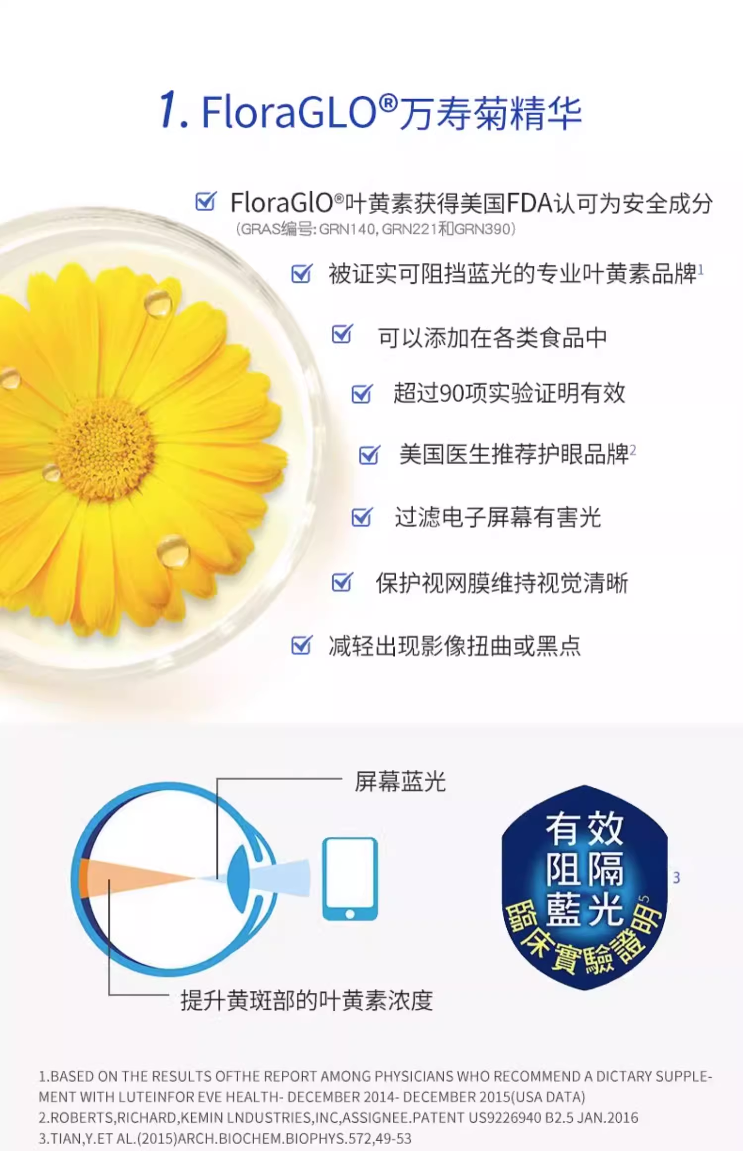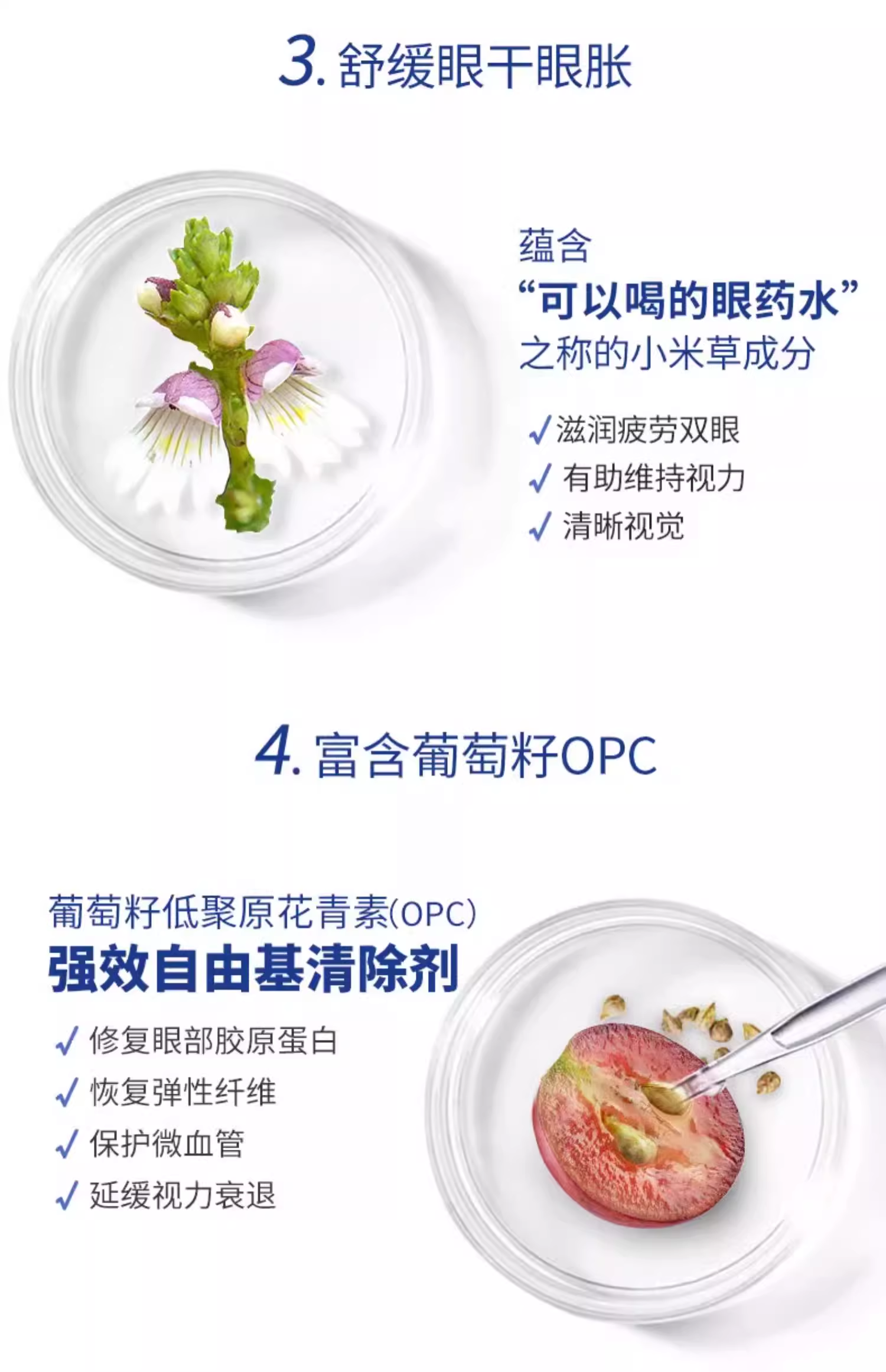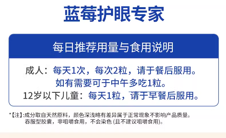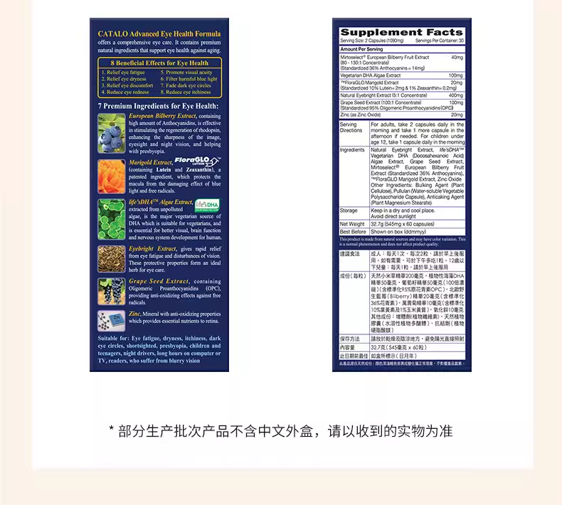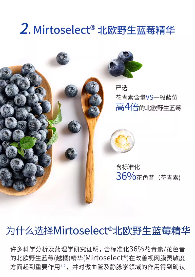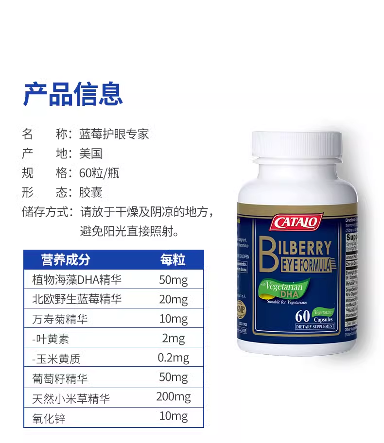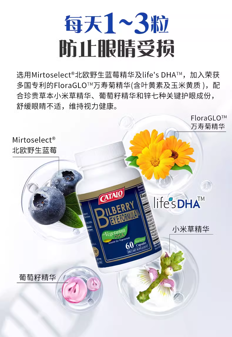 1:蕴含Mirtoselect北欧野生蓝莓精华、小米草精华、FloraGLO万寿菊精华(含叶黄素及玉米黄素)、life's DHA、葡萄籽及锌,为眼睛提供多种营养 2:选用植物胶囊,容易消化 3:适合作为日常护眼保健