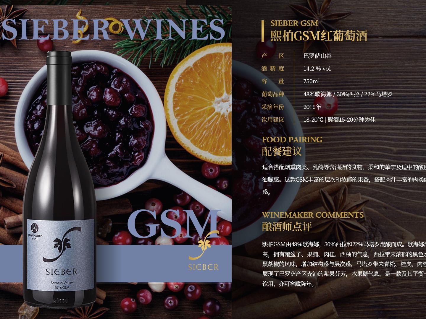 熙柏GSM由48%歌海娜,30%西拉和22%马塔罗混酿而成。歌海娜酒体较轻,酒精含量高,拥有覆盆子、果脯、肉桂、西柚的气息,西拉带来浓郁的黑色水果、蓝莓、李子、黑胡椒的风味,增加结构感与层次感,马塔罗带来青松、桂皮、肉桂的味道,这款GSM展现了巴罗萨产区充沛的浆果芬芳,水果糖气息,是一款及其平衡丰润的酒,适宜当下饮用,亦可窖藏陈年。