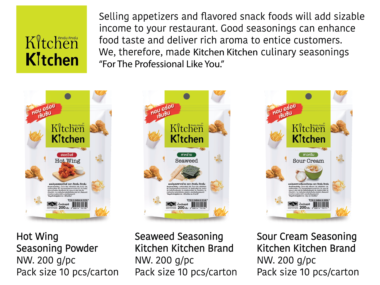 Tom Yum seasoning powder is dried blended powder ingredients, it's Seasoning for Snack, you can sprinkle 5-8% or use as required on Fries, Potato Chips, Banana Chips, Fried Chicken, Nuts or any other fried/oven snack products. Country of Origin: Thailand.