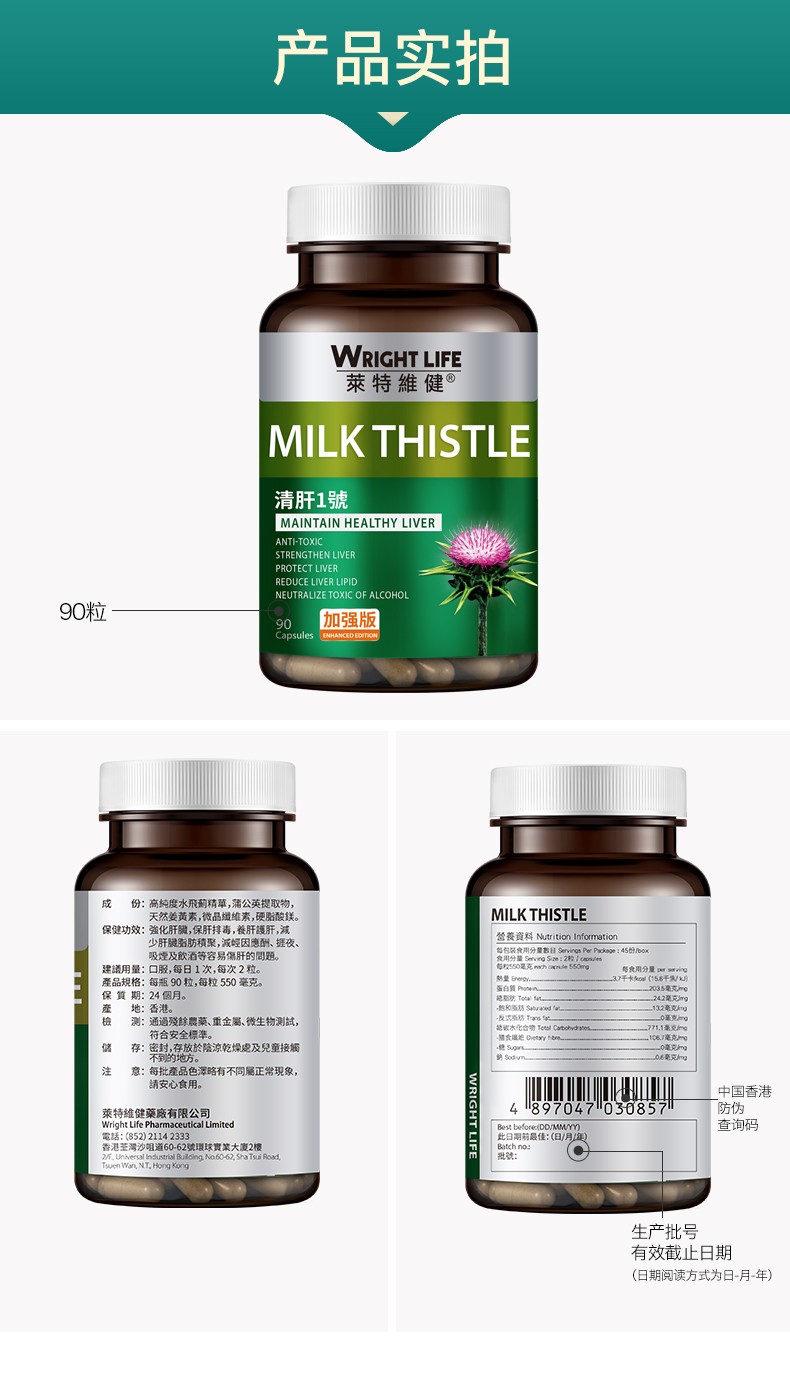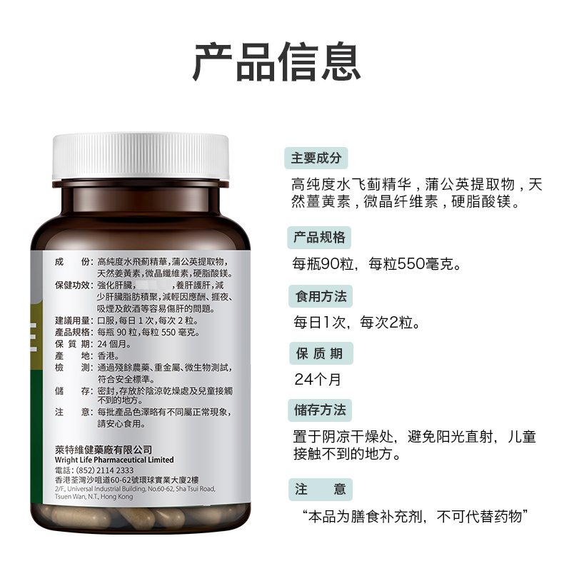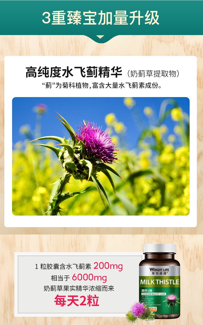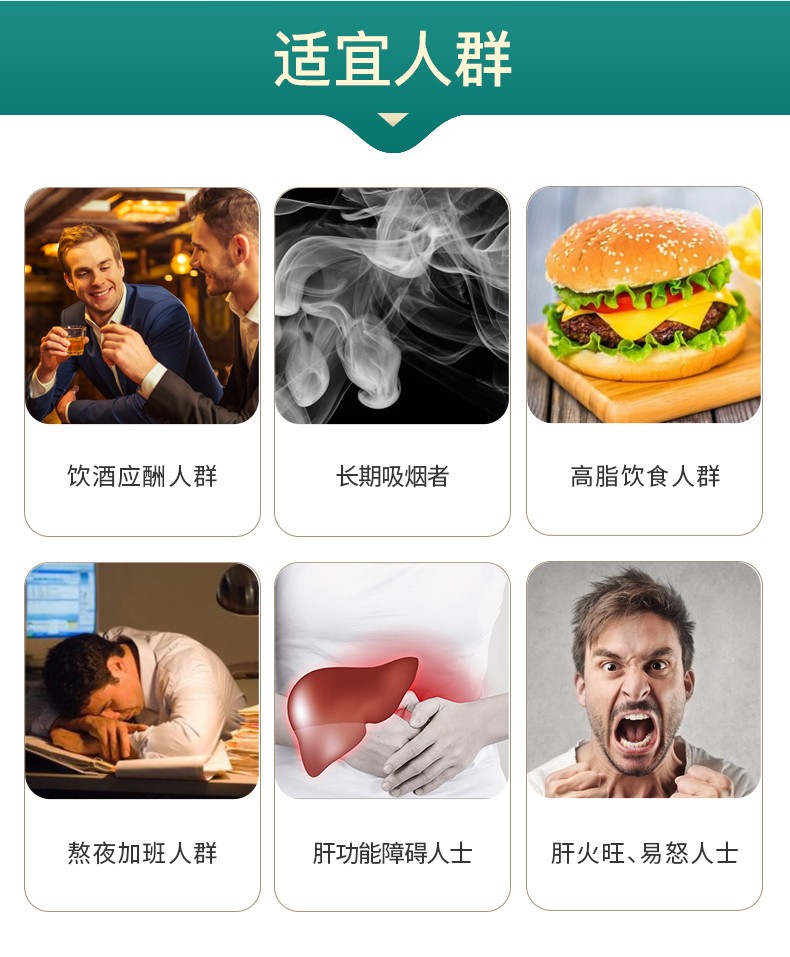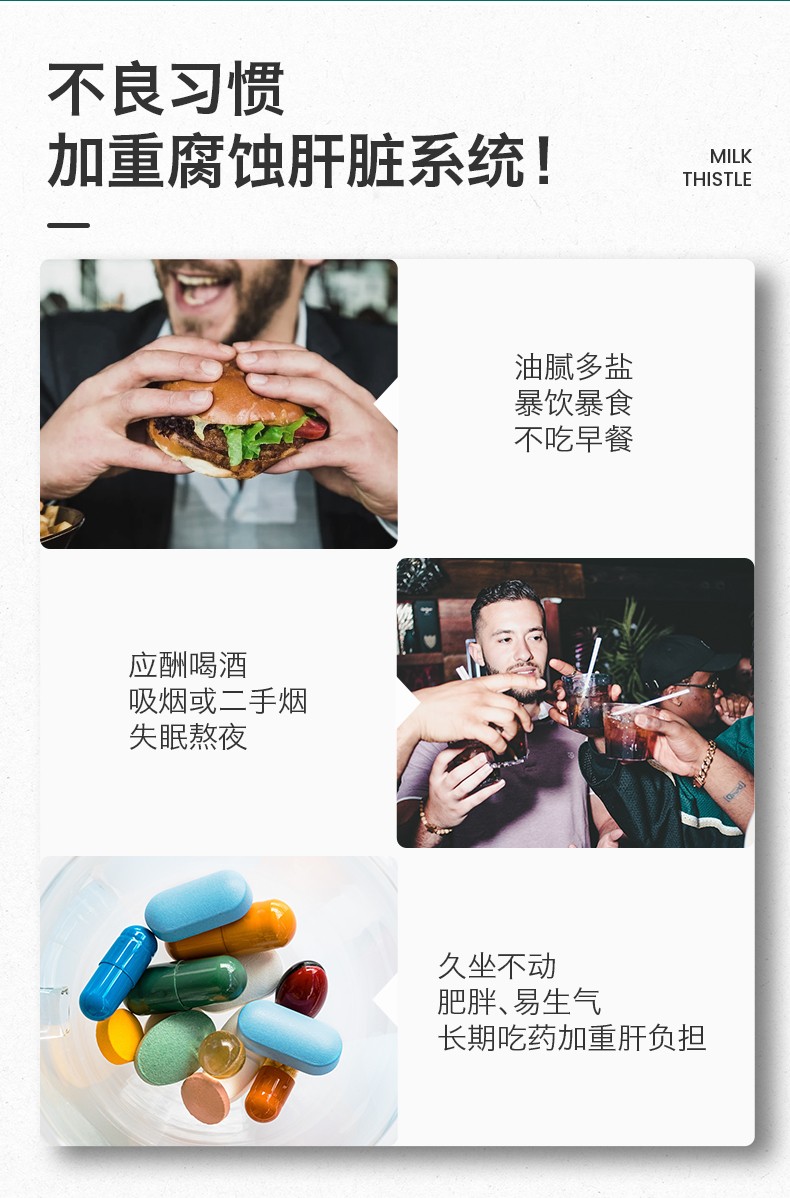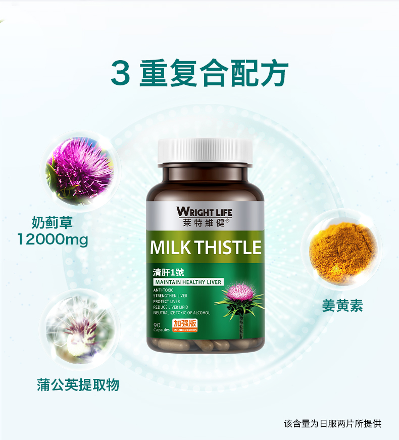 高含量水飞蓟素,三重天然护肝草本精华。以高浓度水飞蓟素、蒲公英提取物、天然姜黄素为主要成分;高浓度水飞蓟素具有抗氧化、抗肝纤维化和抗病毒活性作用,可保护肝细胞膜,改善肝功能,增强肝细胞的修复能力和再生能力;蒲公英提取物含有多种健康营养成分,具有清热解毒和疏肝利胆的作用,可舒缓肝炎和充血;天然姜黄素具有抗肝纤维化的作用,可抑制肝星状细胞增殖,诱导肝星状细胞凋亡。每一粒融合三种成分,多方位呵护肝脏健康。每日一次,一次两粒。适合经常熬夜人群、应酬、喝酒人群、以及多商务出差的男性。