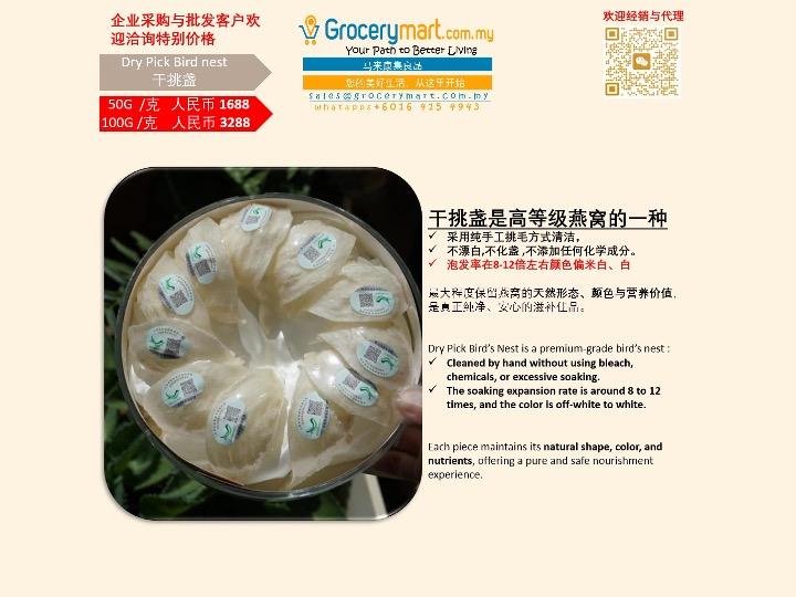 干挑盏是高级燕窝的一种 ✔ 采用纯手工挑毛方式清洁, ✔ 不漂白、不化盏、不添加任何化学成分。 ✔ 泡发率在 8-12 倍左右 色调偏米白。 最大程度保留燕窝的天然形态、颜色与营养价值, 是真正纯净、安心的滋补佳品。