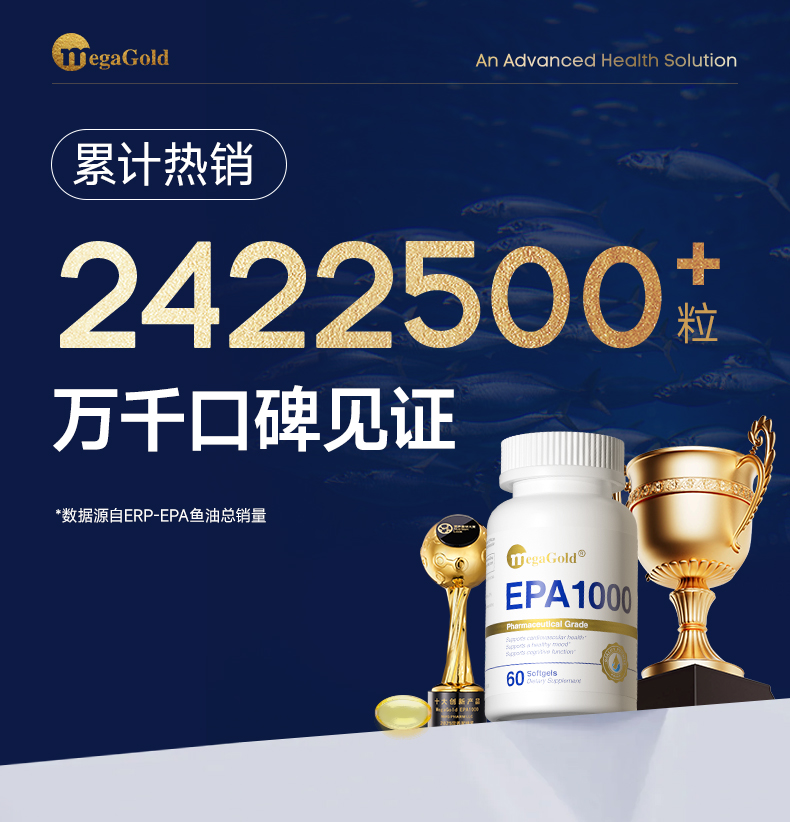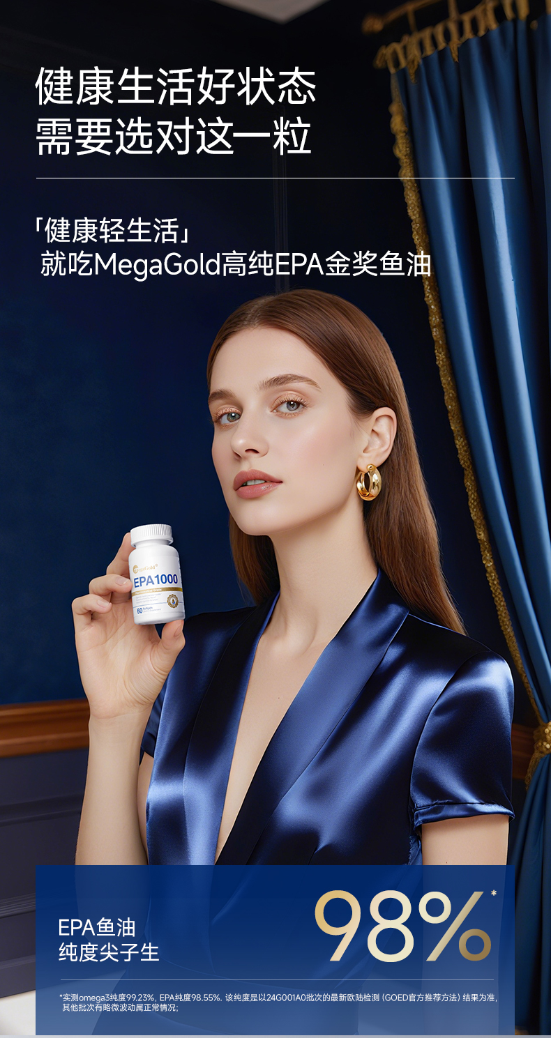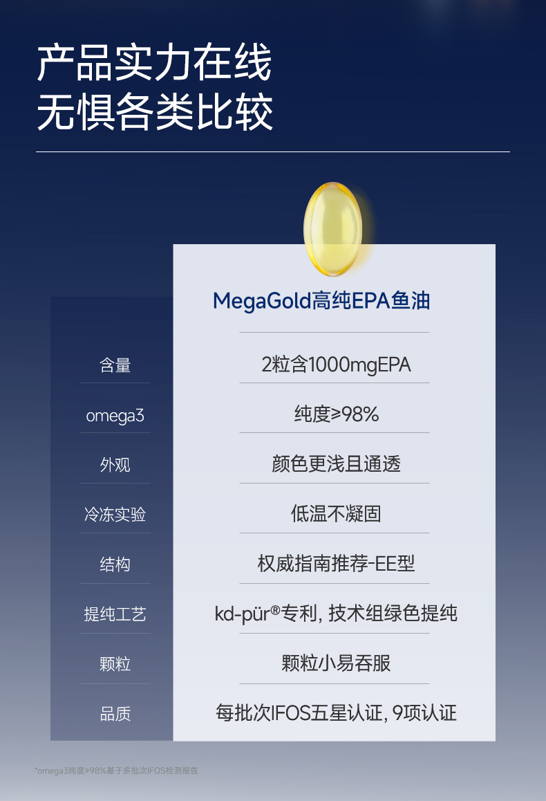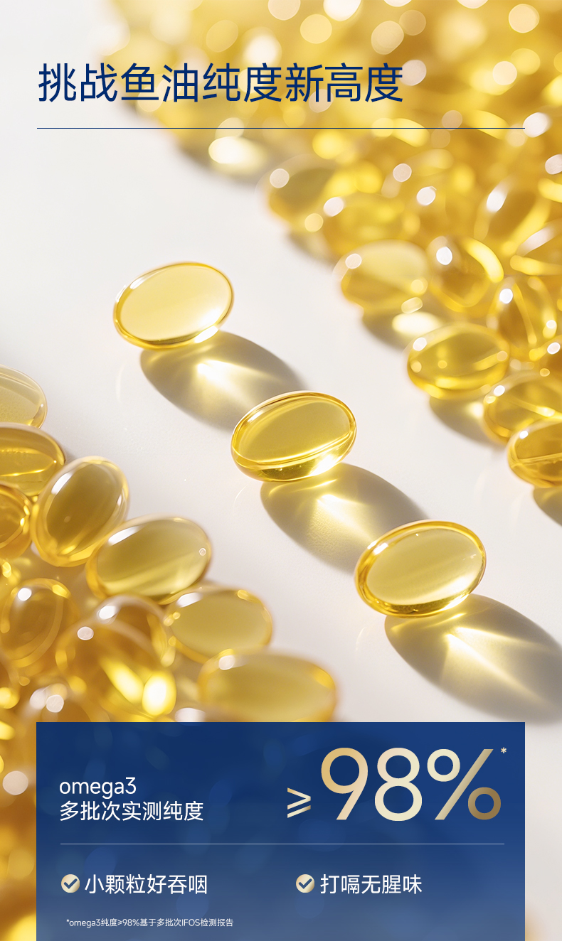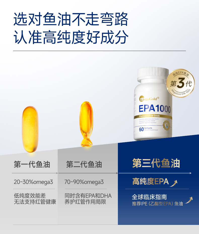 每2粒含 浓缩鱼油1100mg -EPA1000mg ①第三代医药级鱼油:98.6%高纯EPA ②高效降血脂:降低心血管风险更显著 ③长期调理抗抑郁:情绪调节 ④皮肤福星:抗炎抗氧化,改善痤疮