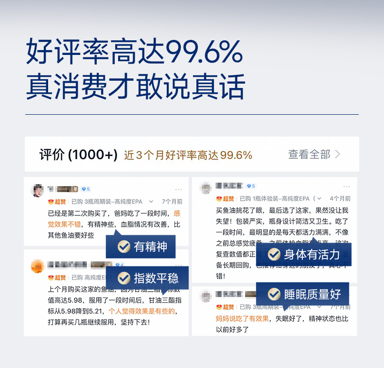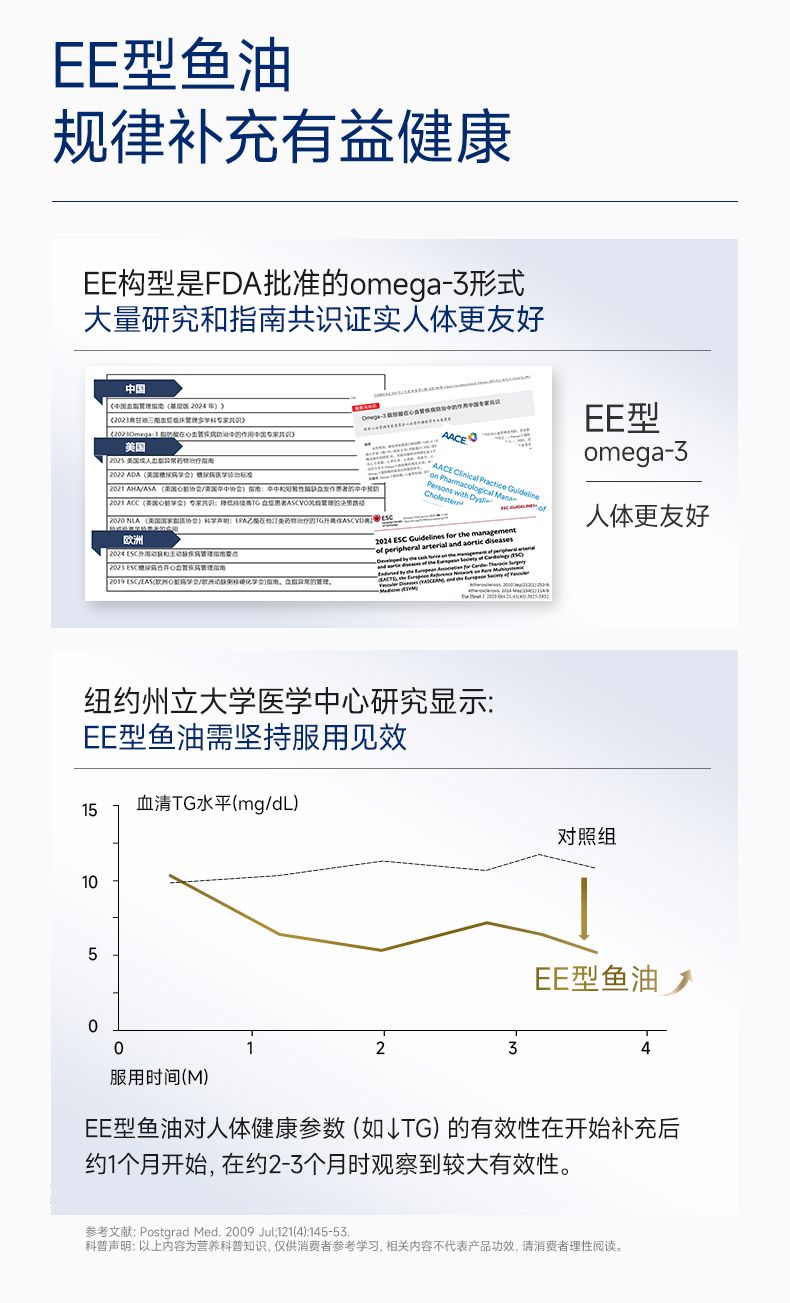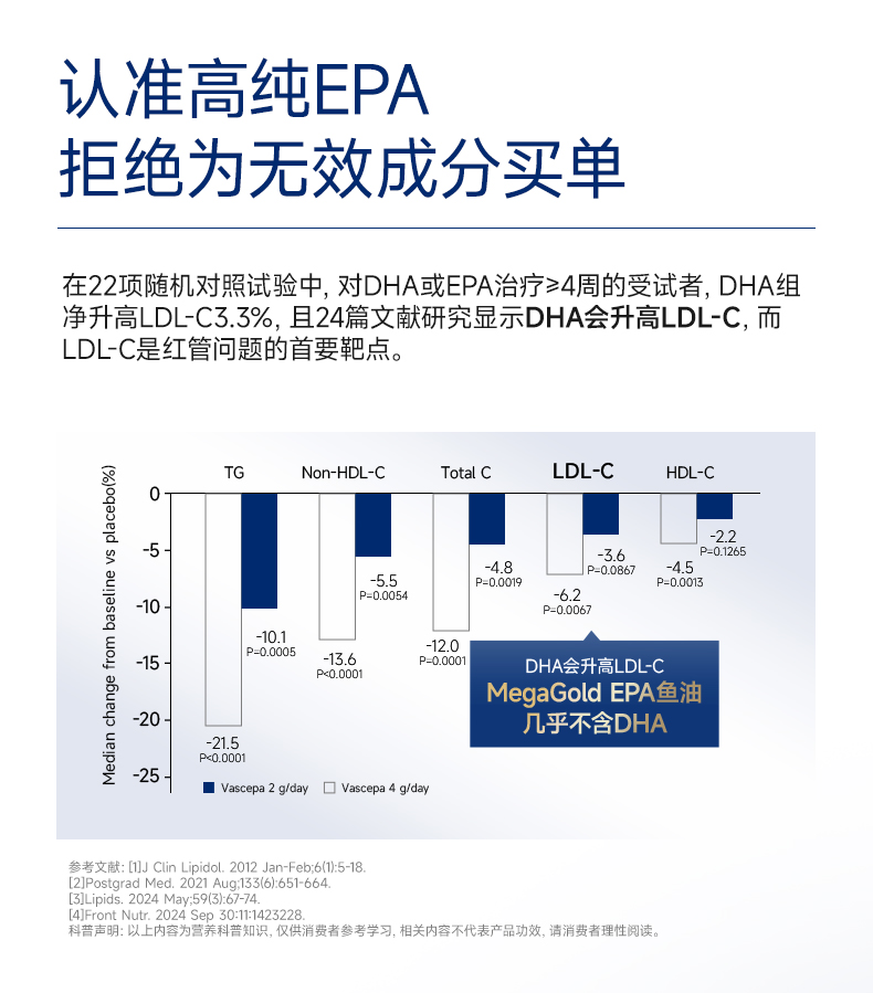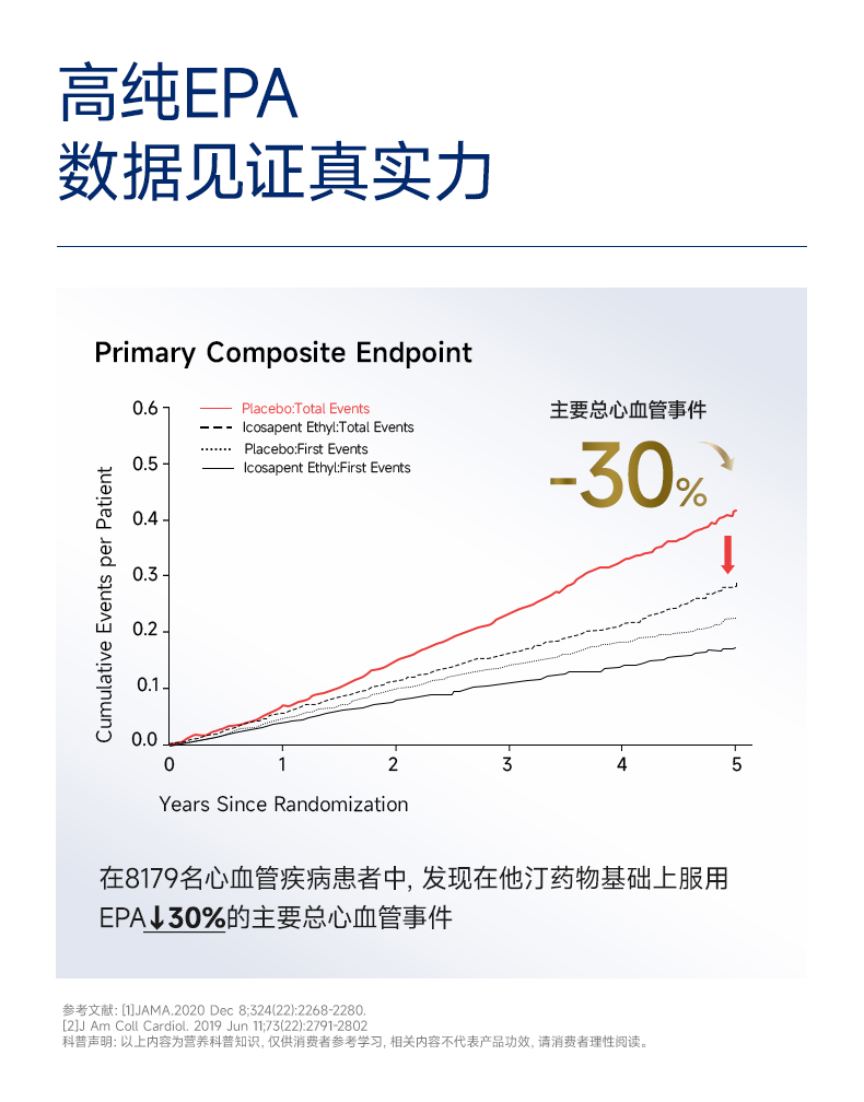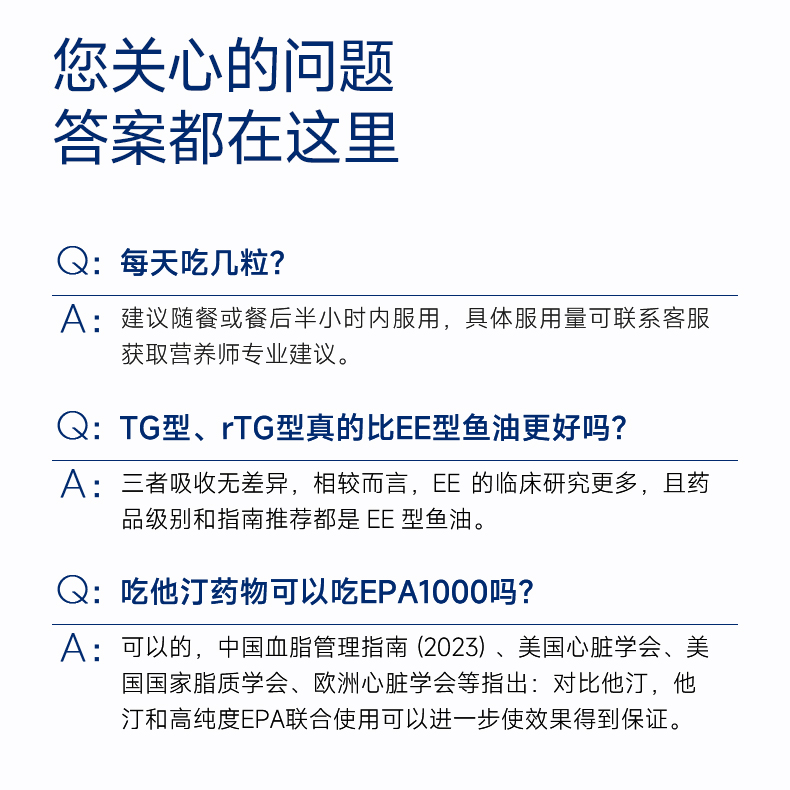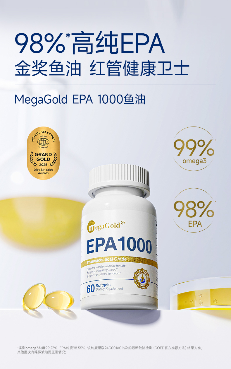 每2粒含 浓缩鱼油1100mg -EPA1000mg ①第三代医药级鱼油:98.6%高纯EPA ②高效降血脂:降低心血管风险更显著 ③长期调理抗抑郁:情绪调节 ④皮肤福星:抗炎抗氧化,改善痤疮