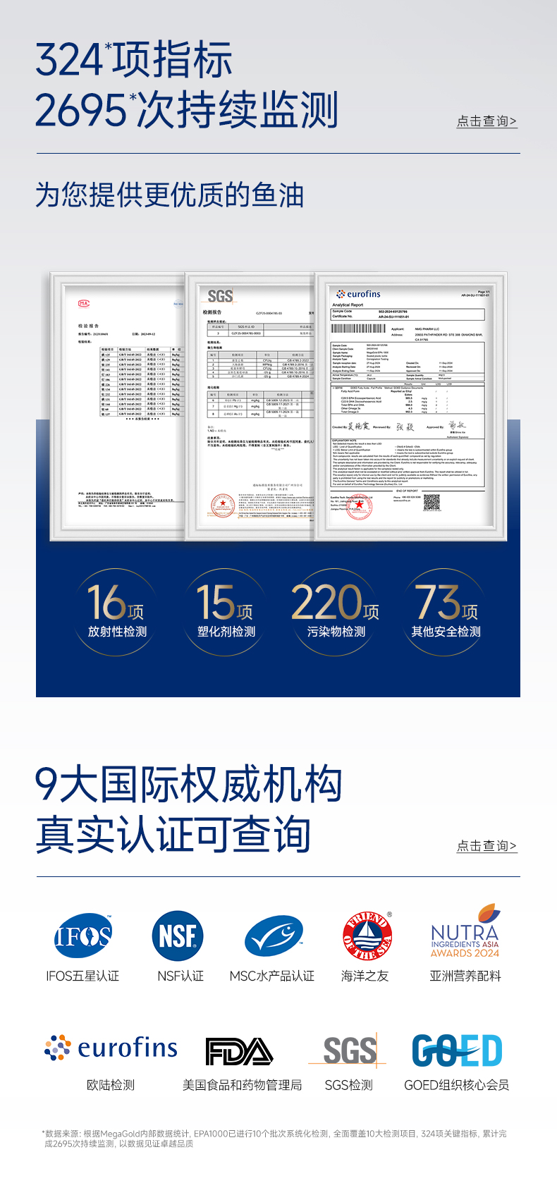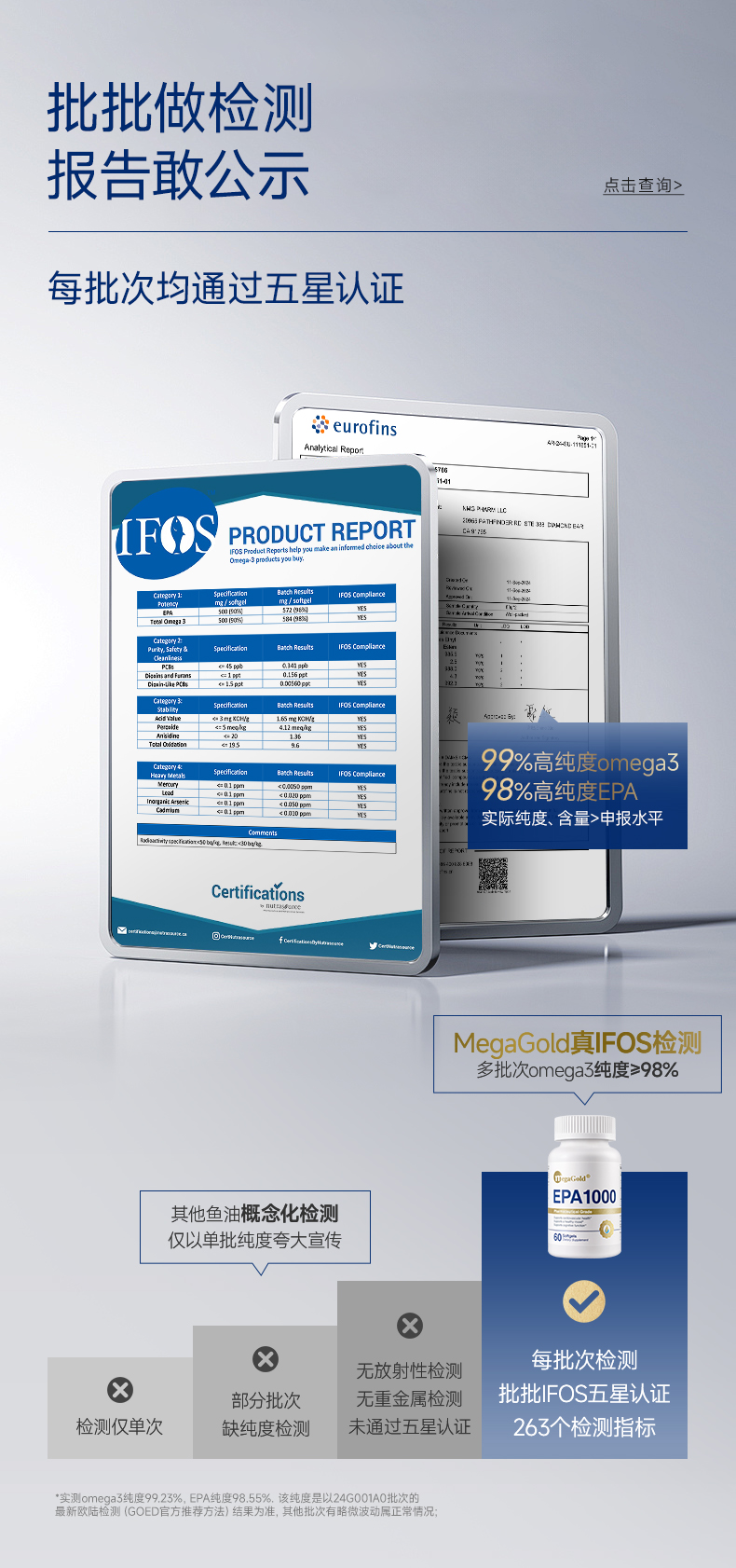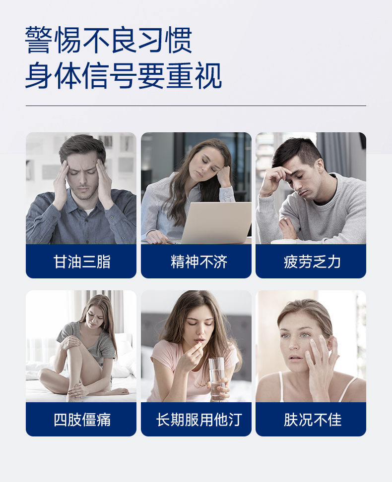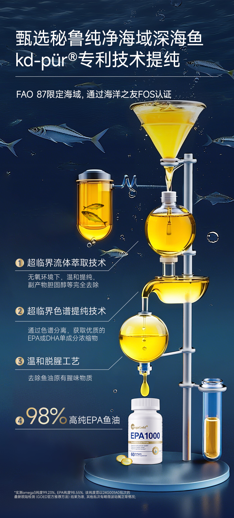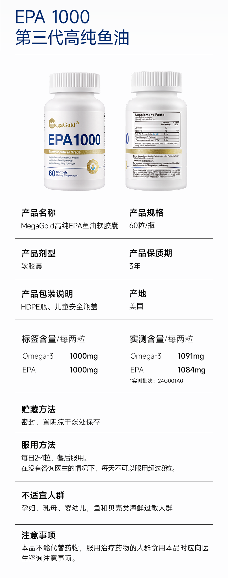 每2粒含 浓缩鱼油1100mg -EPA1000mg ①第三代医药级鱼油:98.6%高纯EPA ②高效降血脂:降低心血管风险更显著 ③长期调理抗抑郁:情绪调节 ④皮肤福星:抗炎抗氧化,改善痤疮