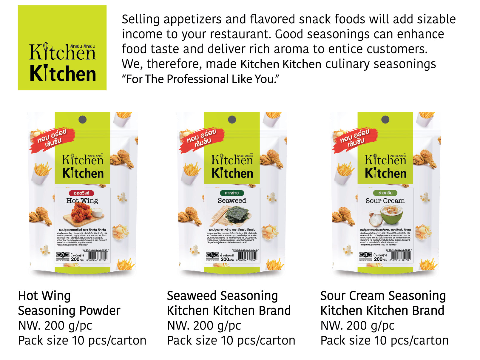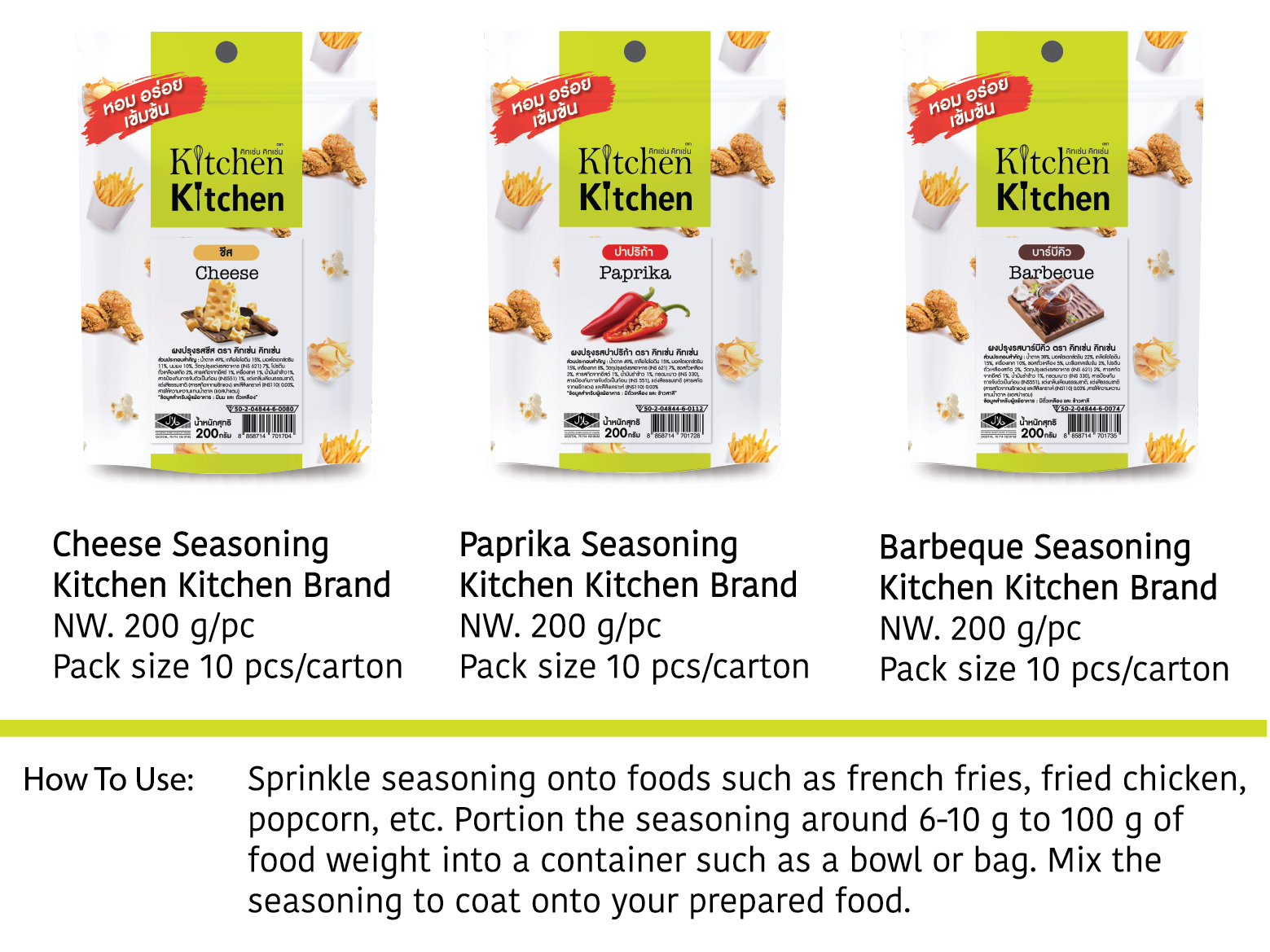 Massaman Seasoning Powder is dried blended powder ingredients, it's Seasoning for Snack, you can sprinkle 8-10% on Fries, Potato Chips, Banana Chips, Fried Chicken, Nuts or any other fried/oven snack products.