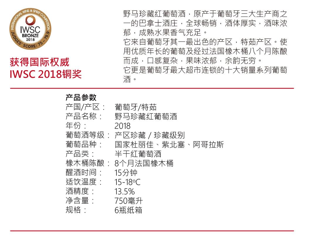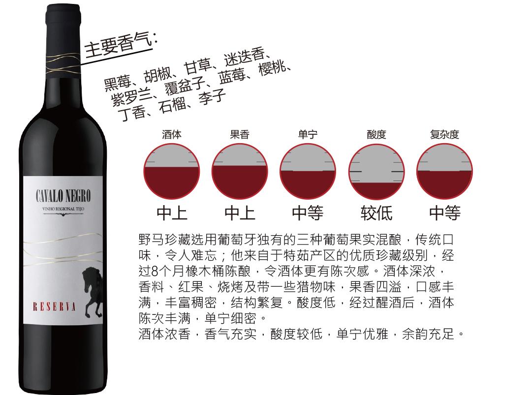 巴拿士酒庄是葡萄牙第三大酒庄,在葡萄牙杜罗河、里斯本、阿莲特茹、杜奥等八个优质产区拥有优质的葡萄资源。酒庄旗下的庄园之一Quinta do Gradil(嘉乐帝)最早的文献记载可追溯到15世纪,曾隶属于开创世界上第一个葡萄酒法产区的庞巴尔侯爵家族,是葡萄牙最古老的酒庄之一;酒庄最早经营的西泽庄园建立于1790年,地处里斯本奥比多斯子产区,是该地区的第一家瓶酒生产商;我们的瓶装葡萄酒在葡萄牙最大超市集团长年畅销,我们亦出口到全球超过30个国家及每年销售超过2000万公升。 更被葡萄牙最权威的葡萄牙葡萄酒杂志(Revista de Vinhos)评为2020年度葡萄牙最佳酒庄。 野马珍藏红葡萄酒,原产于葡萄牙三大生产商之一的巴拿士酒庄,全球畅销,酒体厚实,酒味浓郁,成熟水果香气充足。它来自葡萄牙其一最出色的产区,特茹产区。使用优质年长的葡萄及经过法国橡木桶八个月陈酿而成,口感复杂,果味浓郁,余韵无穷。它更是葡萄牙最大超市连锁的十大销量系列葡萄酒。野马珍藏选用葡萄牙独有的三种葡萄果实混酿,传统口味,令人难忘;他来自于特茹产区的优质珍藏级别,经过6-8个月橡木桶陈酿,令酒体更有陈次感。酒体深浓,香料、红果、烧烤及带一些猎物味,果香四溢,口感丰满,丰富稠密,结构繁复。酸度低,经过醒酒后,酒体陈次丰满,单宁细密。酒体浓香,香气充实,酸度较低,单宁优雅,余韵充足。