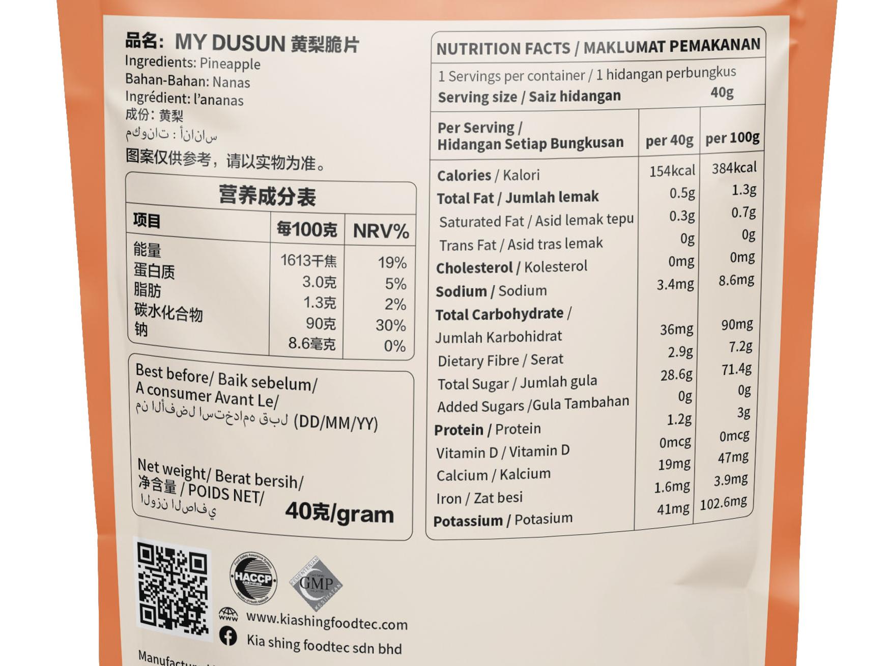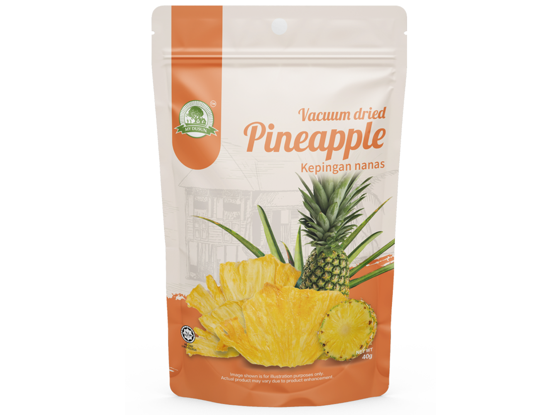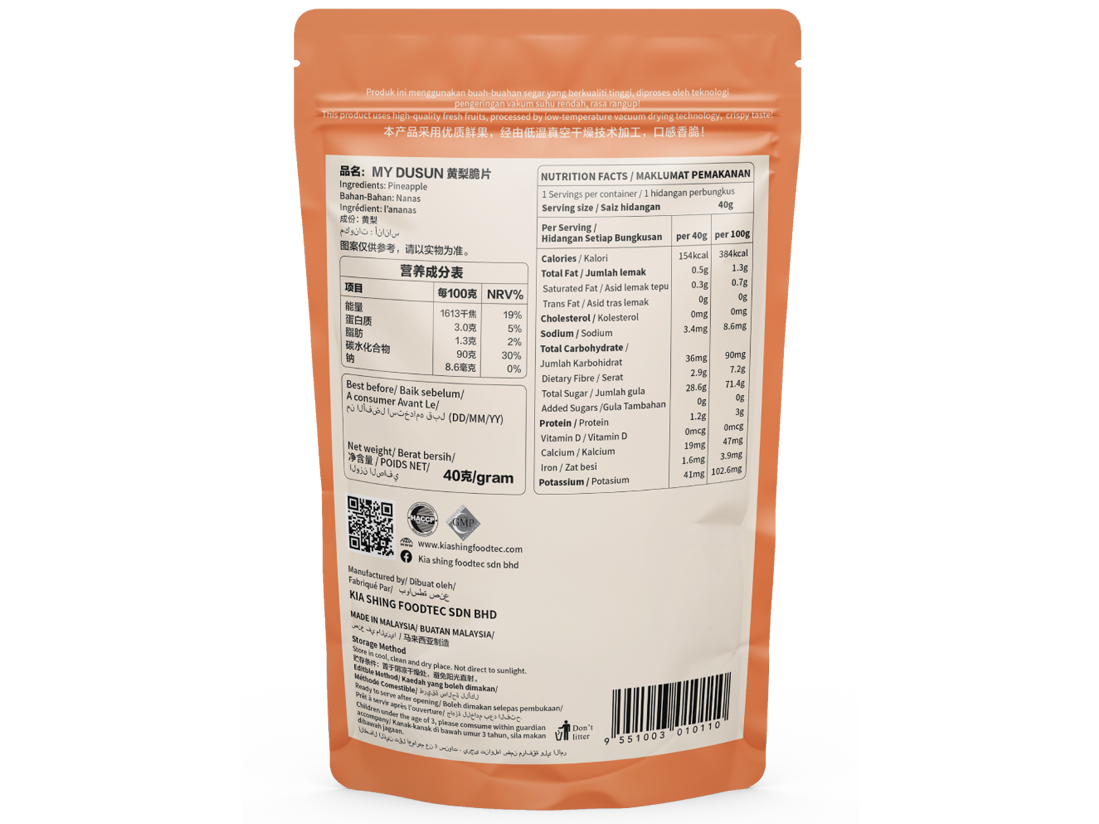 成分:菠萝 - 采用种植于马来西亚之最新畅销品 种MD2黄梨。特别挑选栽种于丘陵地之鲜果,独特环境产出之凤梨肉质细腻、多汁、甜度高,经由低温真空干燥。浓缩保留凤梨的香气, 且每20公斤鲜果仅能制成一公斤果干,口感香脆。