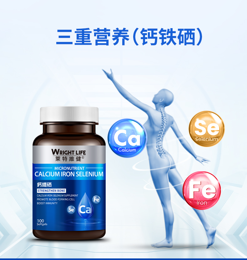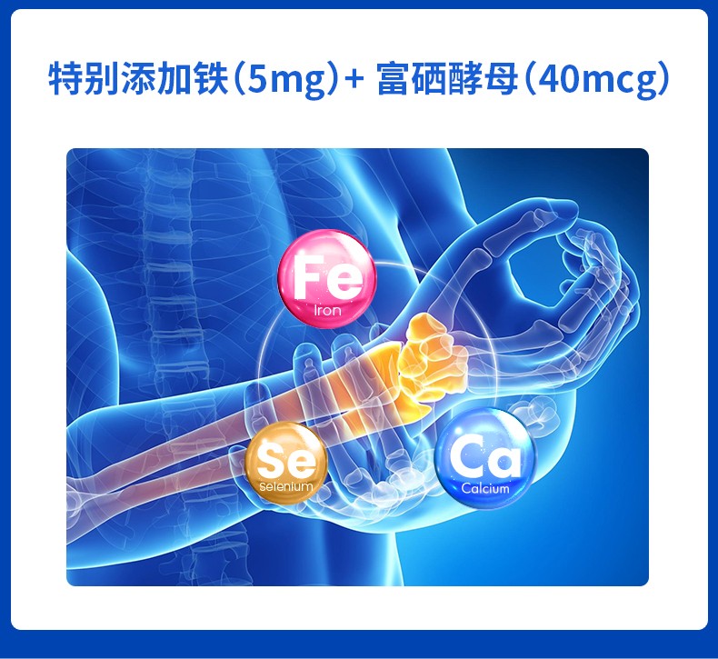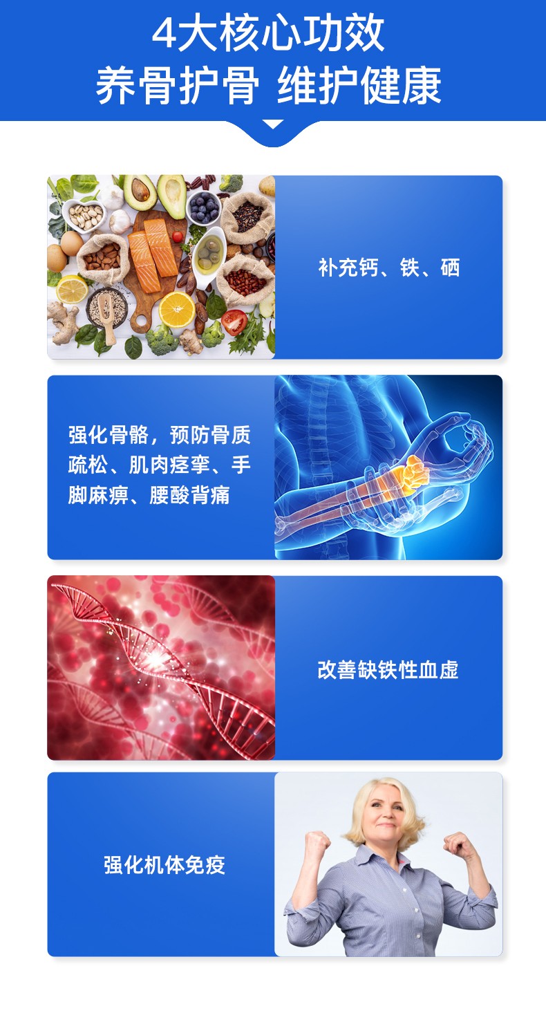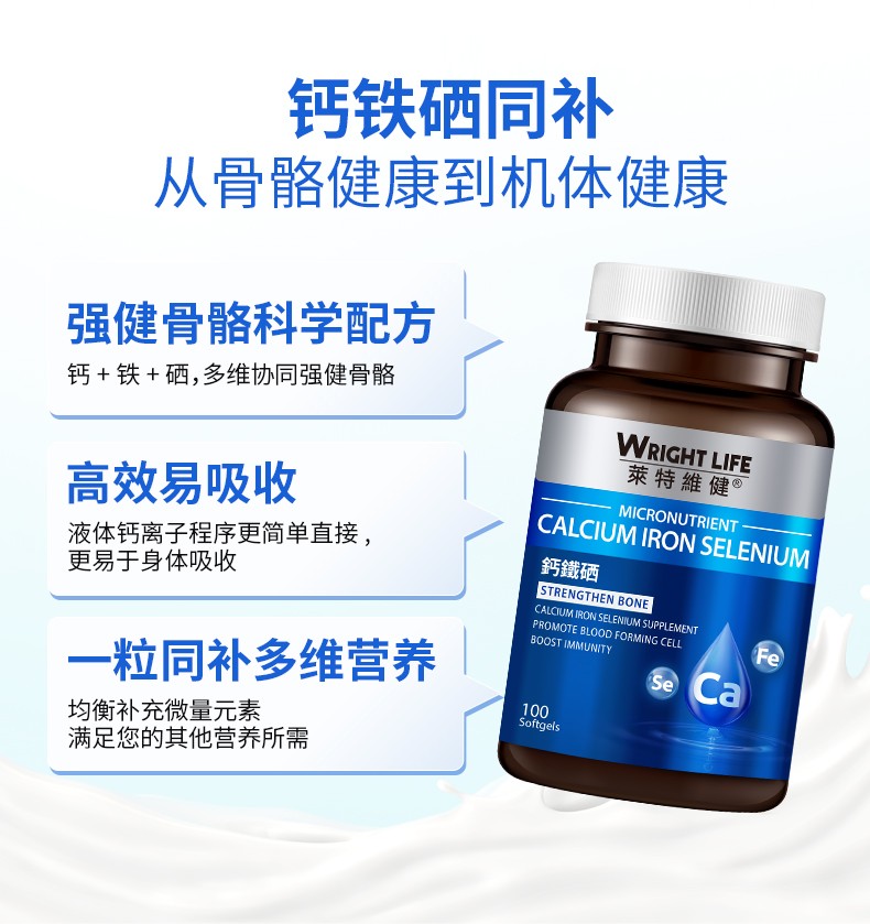 钙、铁、硒,三重骨骼营养,多效养护,增添“骨”力。液体碳酸钙,易被肠胃直接吸收,有利于强健骨骼和牙齿,降低因年龄增长而造成的骨质流失,骨质疏松问题;富马酸亚铁含铁量高,可促进骨髓造血功能,改善缺铁性血虚,促进肌肉中肌红蛋白的合成,进行强化骨骼生长;富硒酵母具有保护软骨细胞,修护受损分子,灵活关节运动。每日一粒,每次两粒。适合中老年人,更年期人群,健身运动人群,贫血头晕人群。