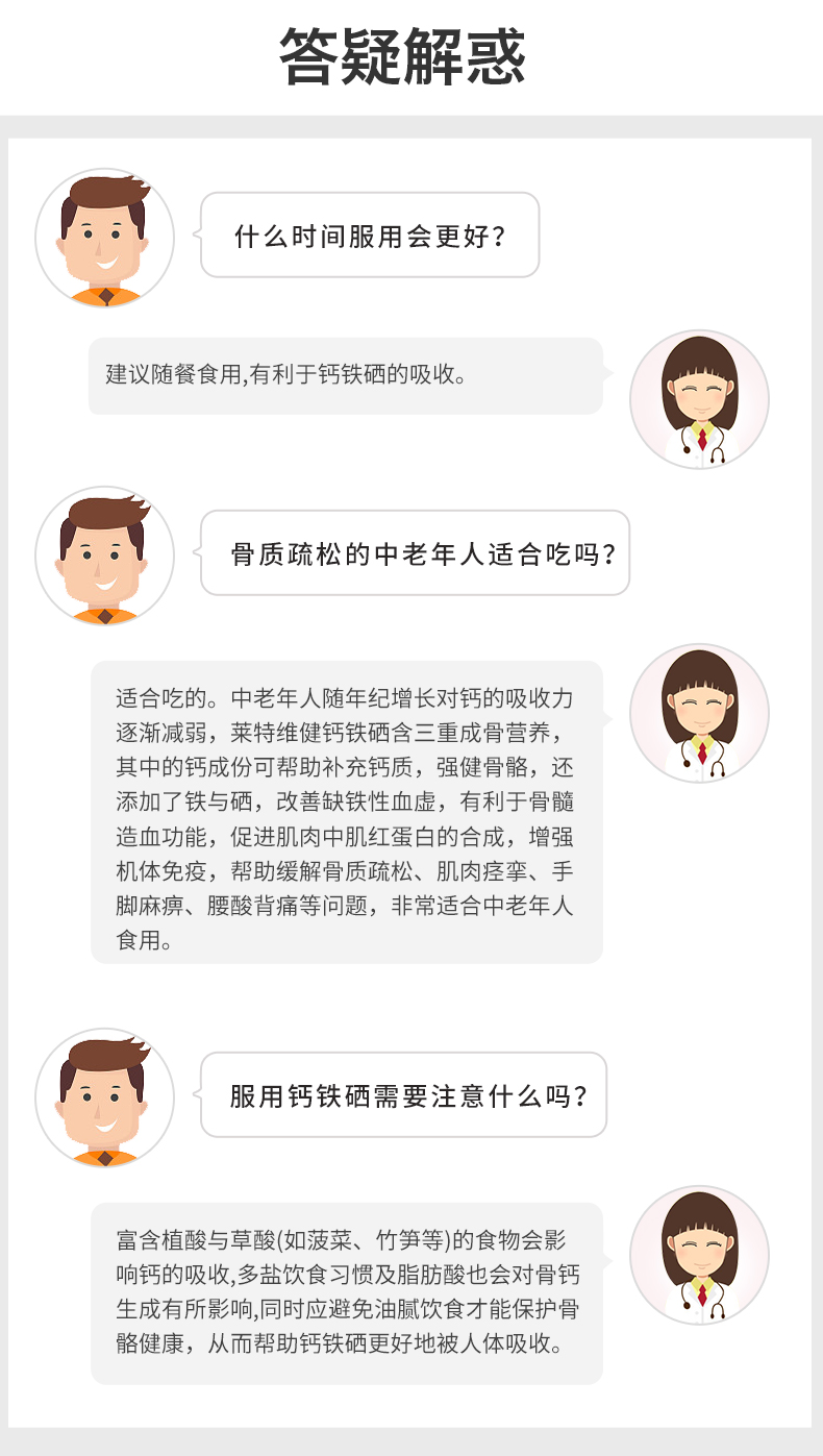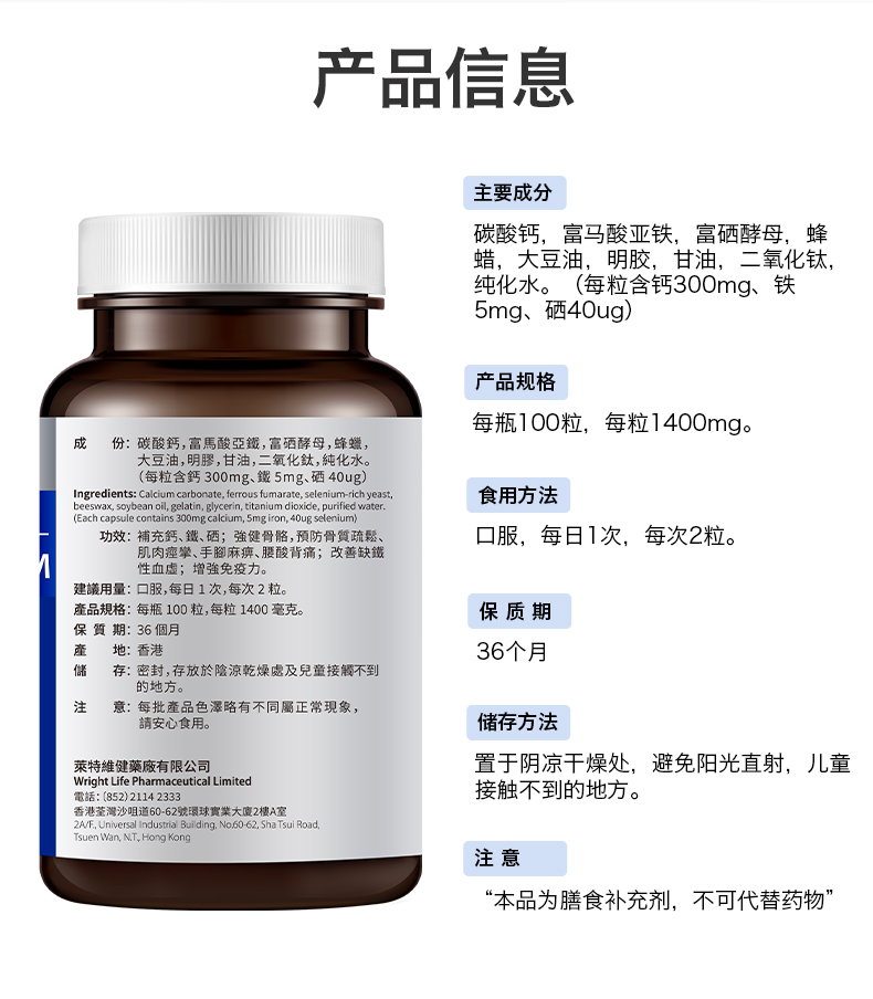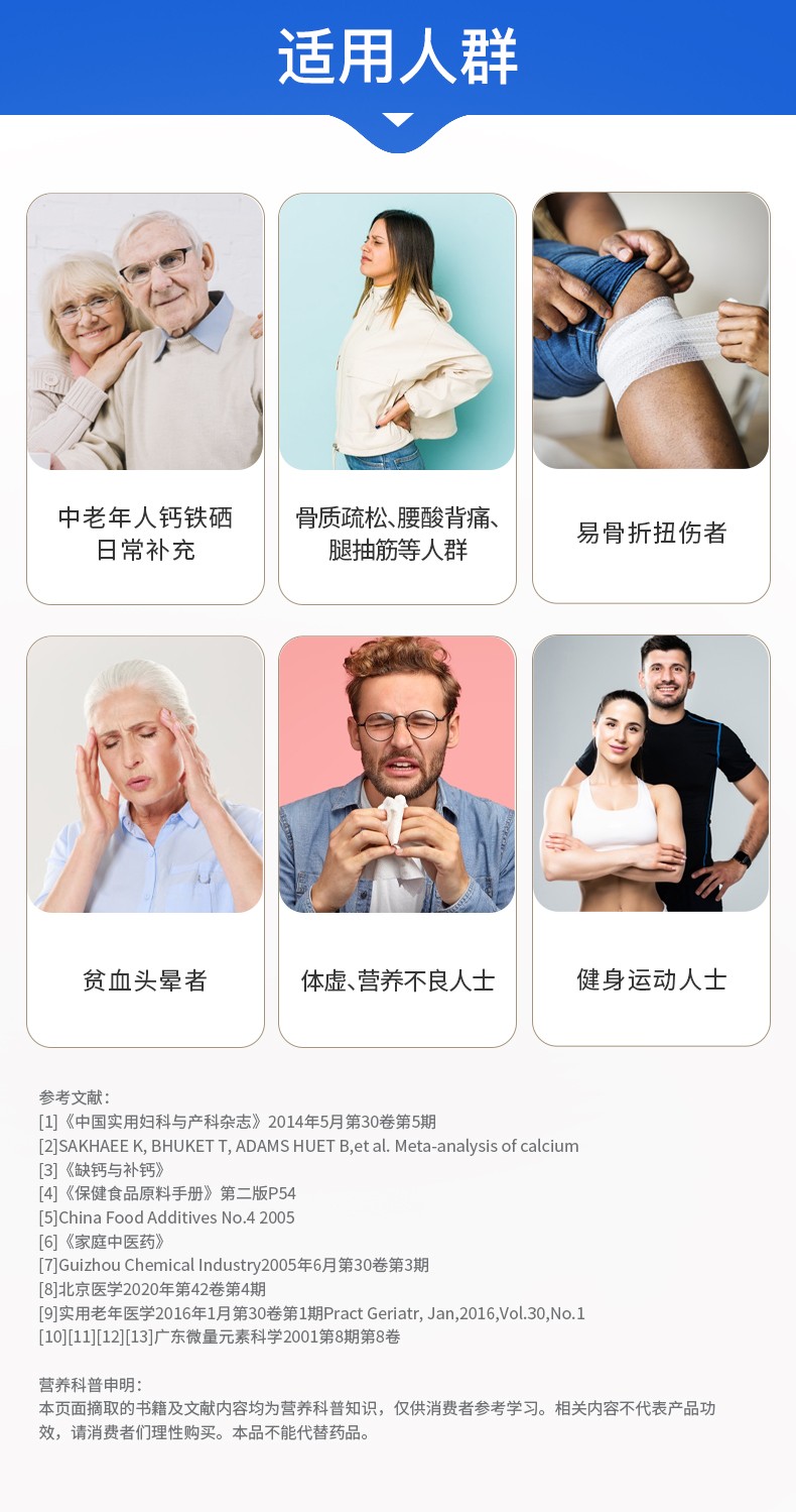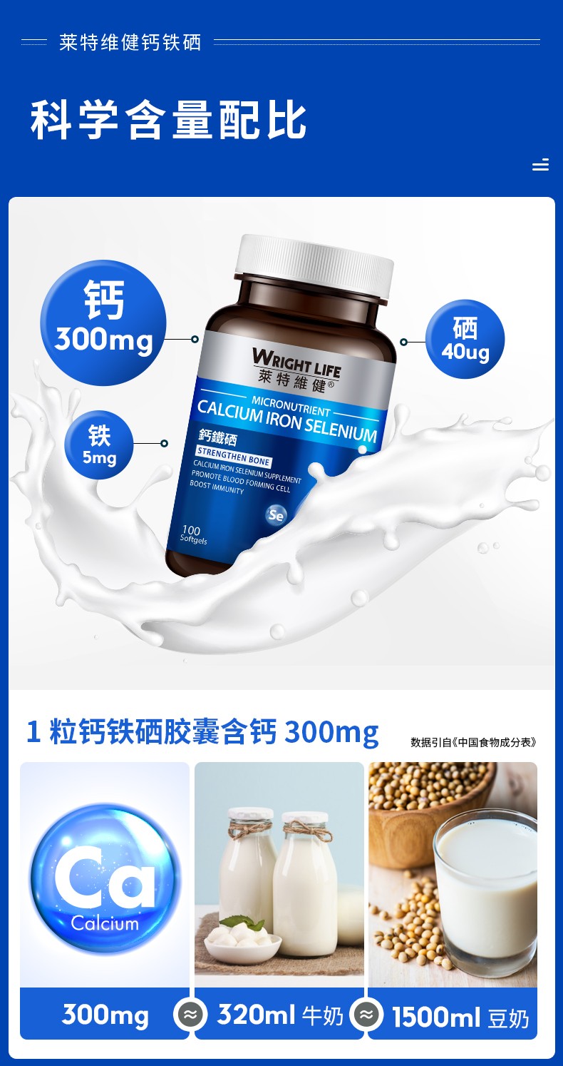 钙、铁、硒,三重骨骼营养,多效养护,增添“骨”力。液体碳酸钙,易被肠胃直接吸收,有利于强健骨骼和牙齿,降低因年龄增长而造成的骨质流失,骨质疏松问题;富马酸亚铁含铁量高,可促进骨髓造血功能,改善缺铁性血虚,促进肌肉中肌红蛋白的合成,进行强化骨骼生长;富硒酵母具有保护软骨细胞,修护受损分子,灵活关节运动。每日一粒,每次两粒。适合中老年人,更年期人群,健身运动人群,贫血头晕人群。