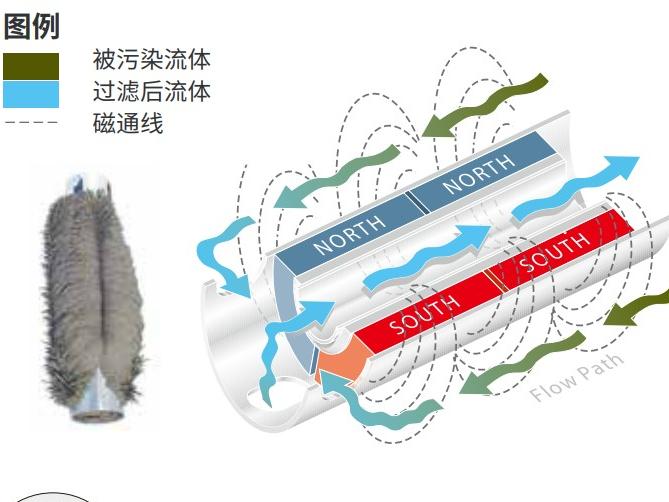 磁场的通路意味着污染物颗粒以受控的方式被吸附,保证过滤器不会被阻塞,不管堆积了多少污染物也不会中断液体的流动,这样的设计保证总有液体流过的通路。