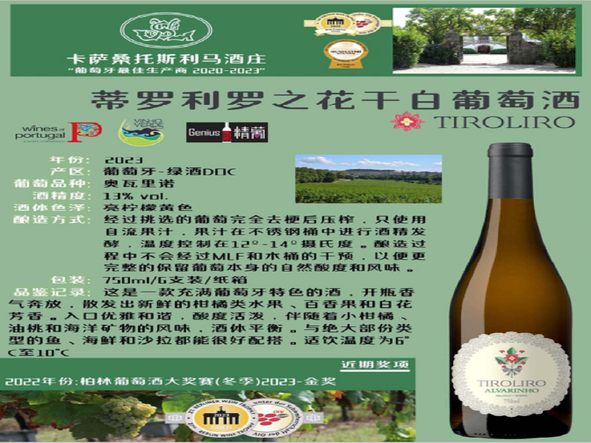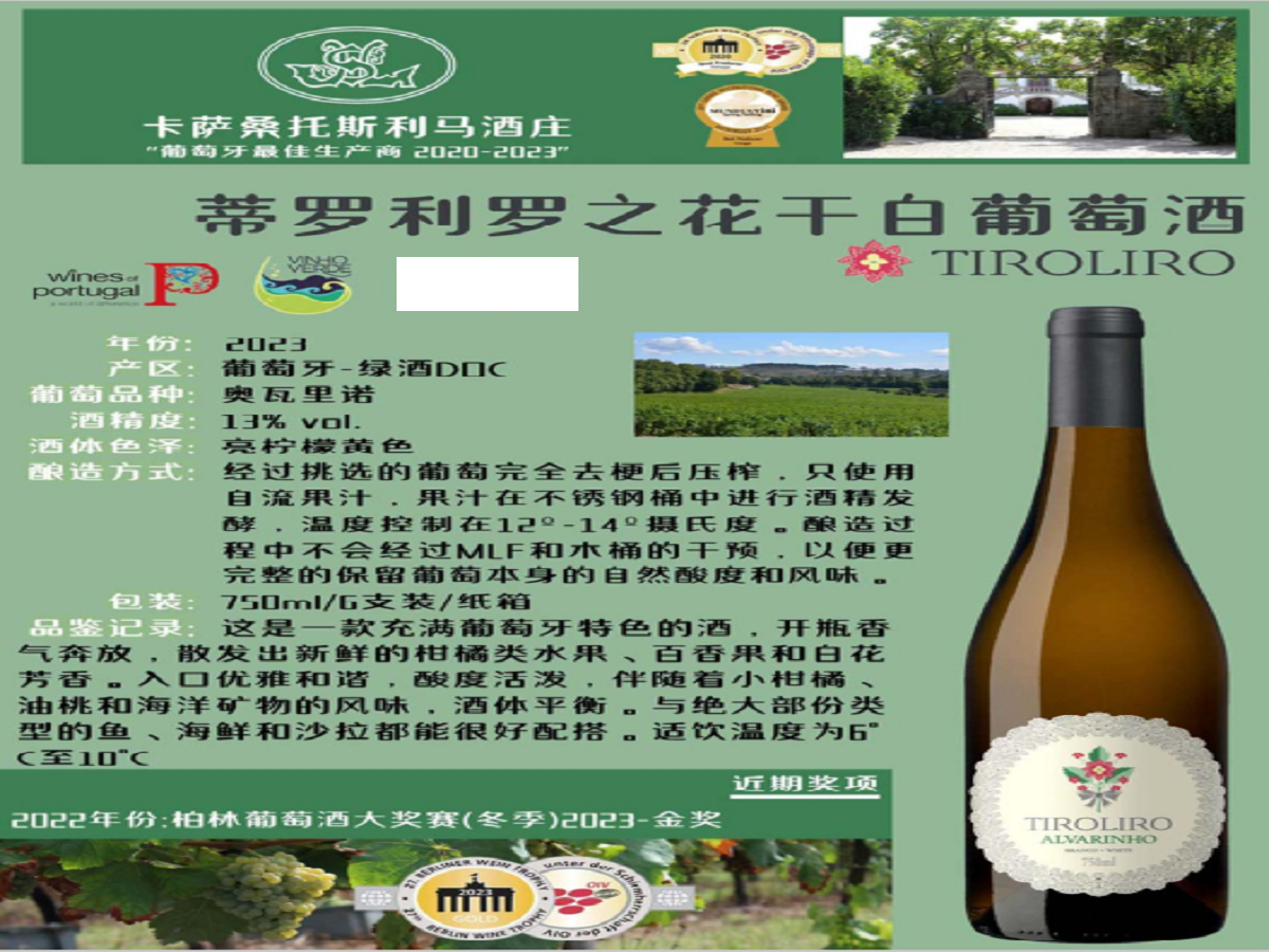 年份:2023产区:葡萄牙-绿酒D口C葡萄品种:奥瓦里诺酒精度:13% vo1.洒体色泽:亮柠檬黄色酿造方式:经过挑选的葡萄完全去梗后压榨,只使用自流果汁,果汁在不锈钢桶中进行酒精发酵,温度控制在122-142摄氏度。酿造过程中不会经过MLF和木桶的干预,以便更完整的保留葡萄本身的自然酸度和风味。ǖ多包装:750ml/G支装/纸箱品鉴记录:这是一款充满葡萄牙特色的酒,开瓶香气奔放,散发出新鲜的柑橘类水果、百香果和白花芳香。入口优雅和谐,酸度活泼,伴随着小柑橘、油桃和海洋矿物的风味,酒体平衡。与绝大部份类型的鱼、海鲜和沙拉都能很好配搭。适饮温度为6C至10C 近期奖项 2022年份:柏林葡萄酒大奖赛(冬季)2023-金奖