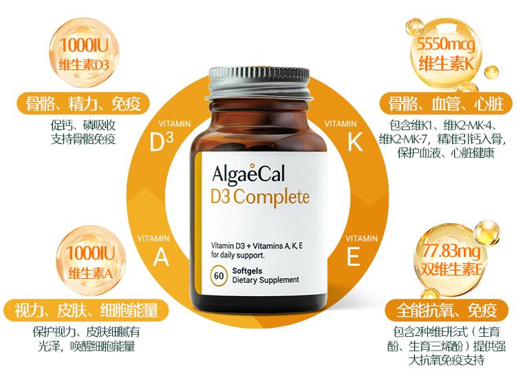 AlgaeCal维生素D3均衡瓶以其科学的配比理念和全面的健康支持,为您提供了一种更安全、更高效的日常营养补充方案。