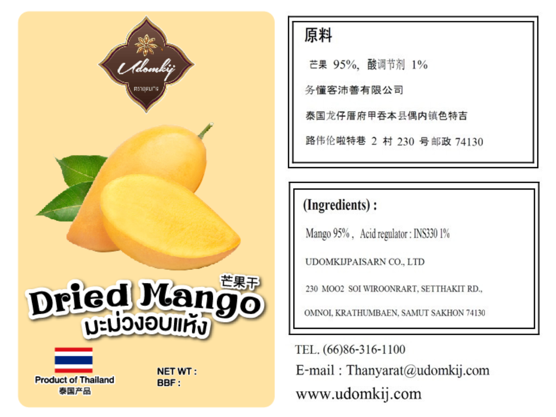 �� Thai Dried Mango – Naturally Dehydrated No Artificial Flavors • No Preservatives Enjoy the pure taste of Thai mango, gently dehydrated to lock in its natural sweetness and chewy texture. Our dried mango contains no added preservatives, artificial colors, or flavors – just clean, fruity goodness you can feel good about. Perfect for healthy snacking, lunch boxes, or a taste of Thailand anytime. �� 泰国芒果干 – 低温脱水,自然甜香 不含人工香料 • 不含防腐剂 本品采用低温脱水技术,温和去水保留泰国芒果的天然甜味与柔软口感。 无添加防腐剂、人工色素或香精,每一口都是真实果香。 适合健康零食、儿童便当或随时随地享受泰国风味。