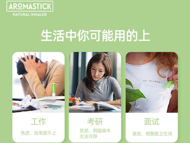 AromaStick全天然鼻吸棒之镇静棒可以快速并有效的让处于紧张、焦虑状态的健康人舒缓身心。瑞士AromaStick全天然鼻吸棒不是药物,也不能用来代替药物缓解或预防健康问题或治疗疾病。发布本产品信息目的仅在于介绍AromaStick全天然鼻吸棒以及其中所含的精油成分,旨在帮助改善个体的健康状况。
