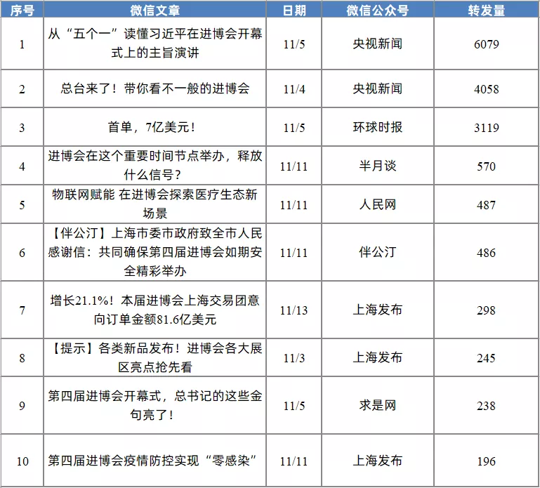 第四届进博会期间,微信平台多篇文章阅读量达“10万+”,极大提升进博会曝光度。其中,微信公众号“央视新闻”发布的《从“五个一”读懂习近平在进博会开幕式上的主旨演讲》转载量最高,达6079次,《总台来了!带你看不一般的进博会》转载量达4058次,位居第二。微信公众号“环球时报”发布的《首单,7亿美元!》位居第三名,转载量为3119次。此外,《进博会在这个重要时间节点举办,释放什么信号?》《物联网赋能 在进博会探索医疗生态新场景》等热文,也备受关注。