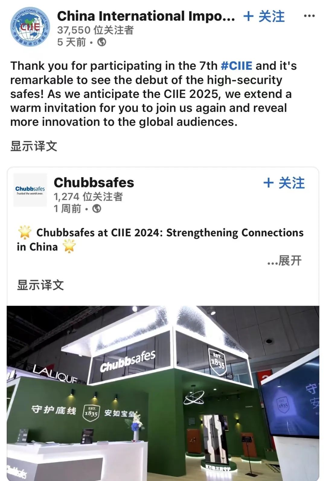 11月28日,英国保险柜品牌集宝发帖称,首次参加进博会加强了与中国伙伴的联系,提升了企业曝光度。进博会海媒账号点赞并转发表示,感谢集宝参加第七届进博会并带来创新产品,欢迎其参加2025年第八届进博会,向全球观众展示更多创新成果。