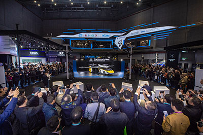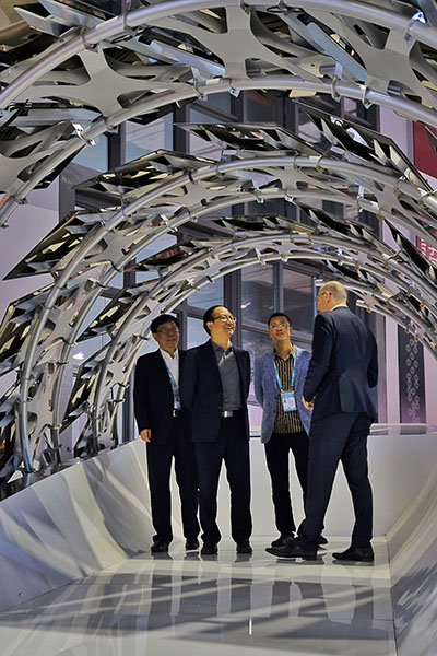 德国福伊特机器人公司的迈克尔·赫尔利(Michael Hurley),在自己的展台上与产品机器人合影