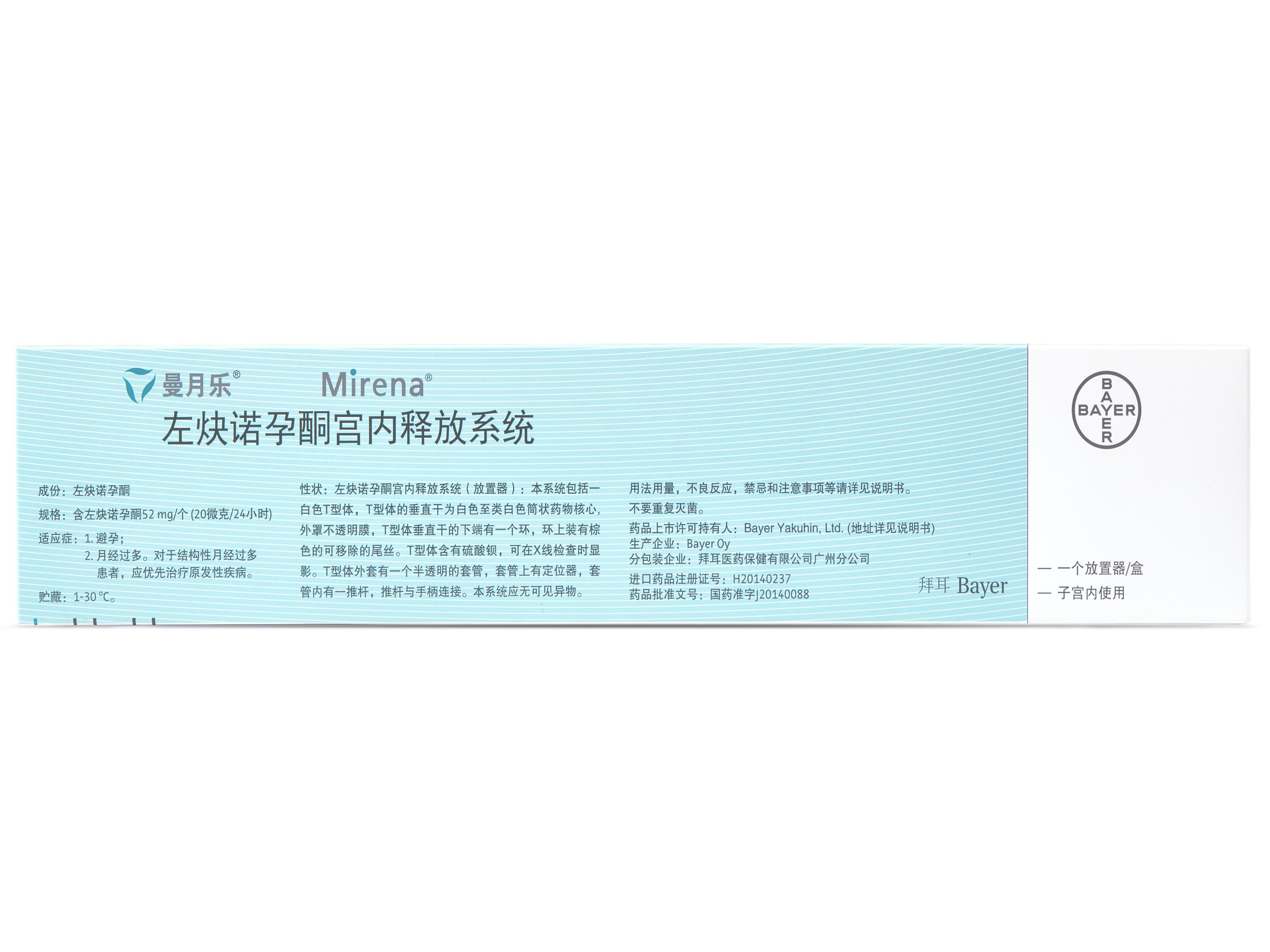 左炔诺孕酮宫内释放系统(放置器):本系统包括一白色 T 型体,T 型体的垂直干为白色至类白色筒状药物核心,外罩不透明膜,T 型体垂直干的下端有一个环,环上装有棕色的可移除的尾丝。T 型体含有硫酸钡,可在 X 线检查时显影。T 型体外套有一个半透明的套管,套管上有定位器,套管内有一推杆,推杆与手柄连接。本系统应无可见异物 本系统主要成份为左炔诺孕酮。含左炔诺孕酮 52mg/个(20 微克/24 小时)。 【适应症】 1. 避孕; 2. 月经过多。对于结构性月经过多患者,应优先治疗原发性疾病。